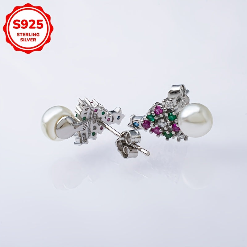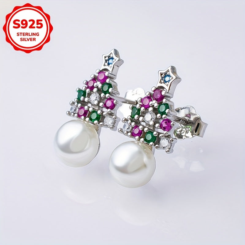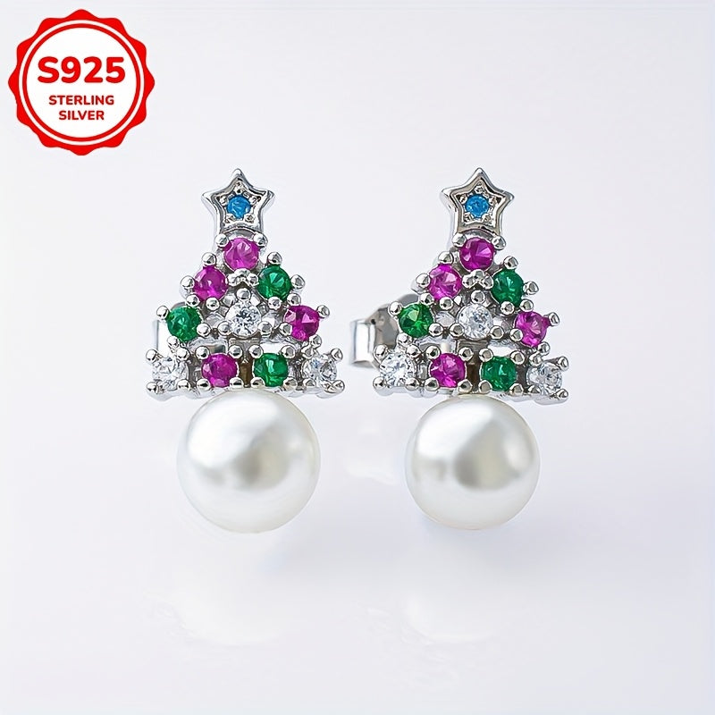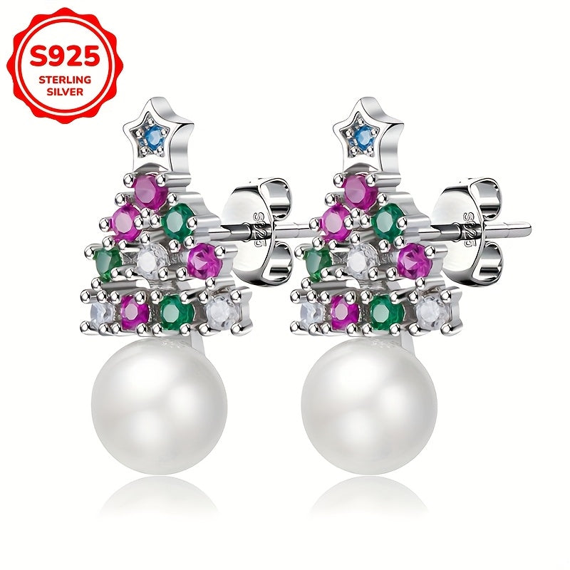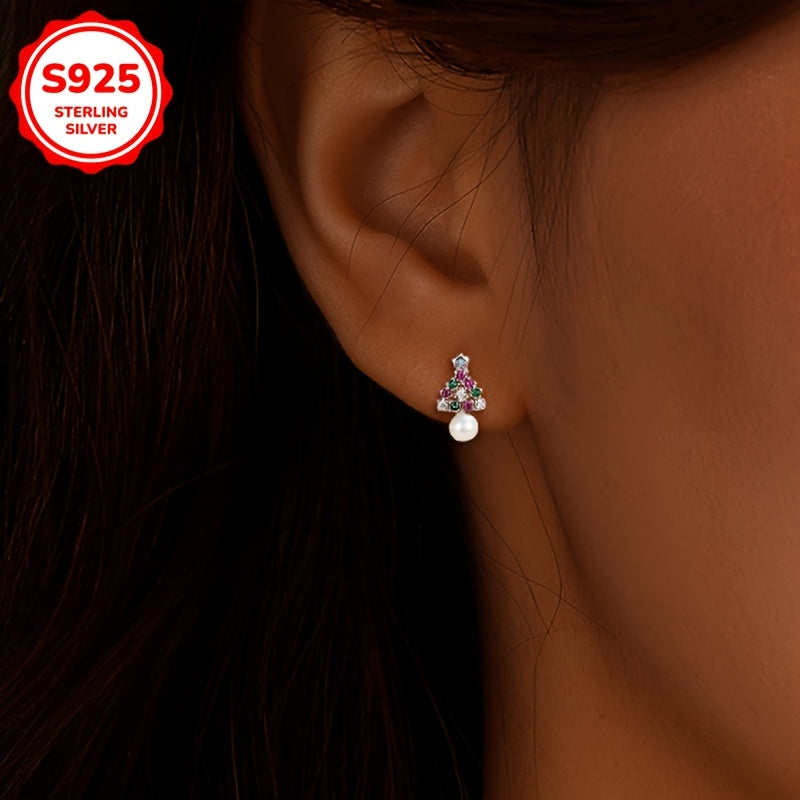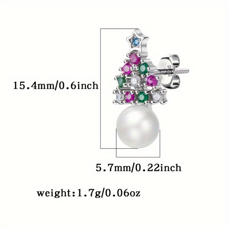 These elegant earrings feature a Christmas tree design made of synthetic zirconia stones with a light feel. The studs are shaped like pearls and set in 925 silver, weighing 1.7g.
