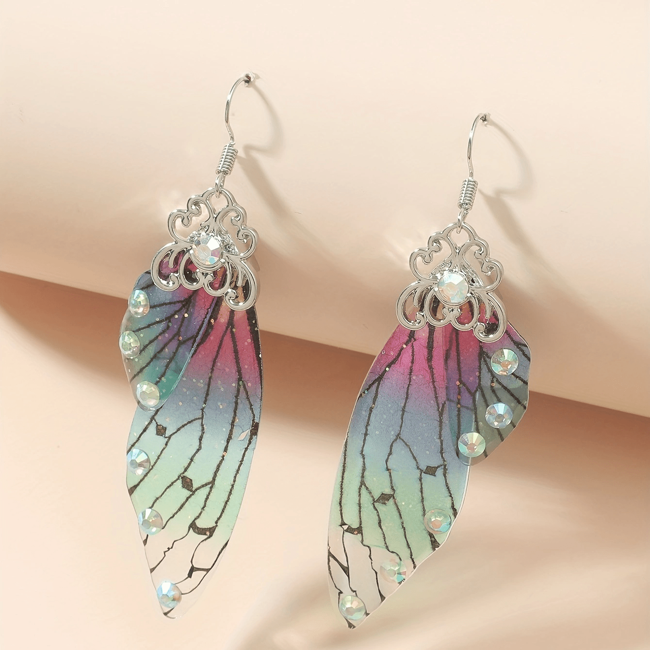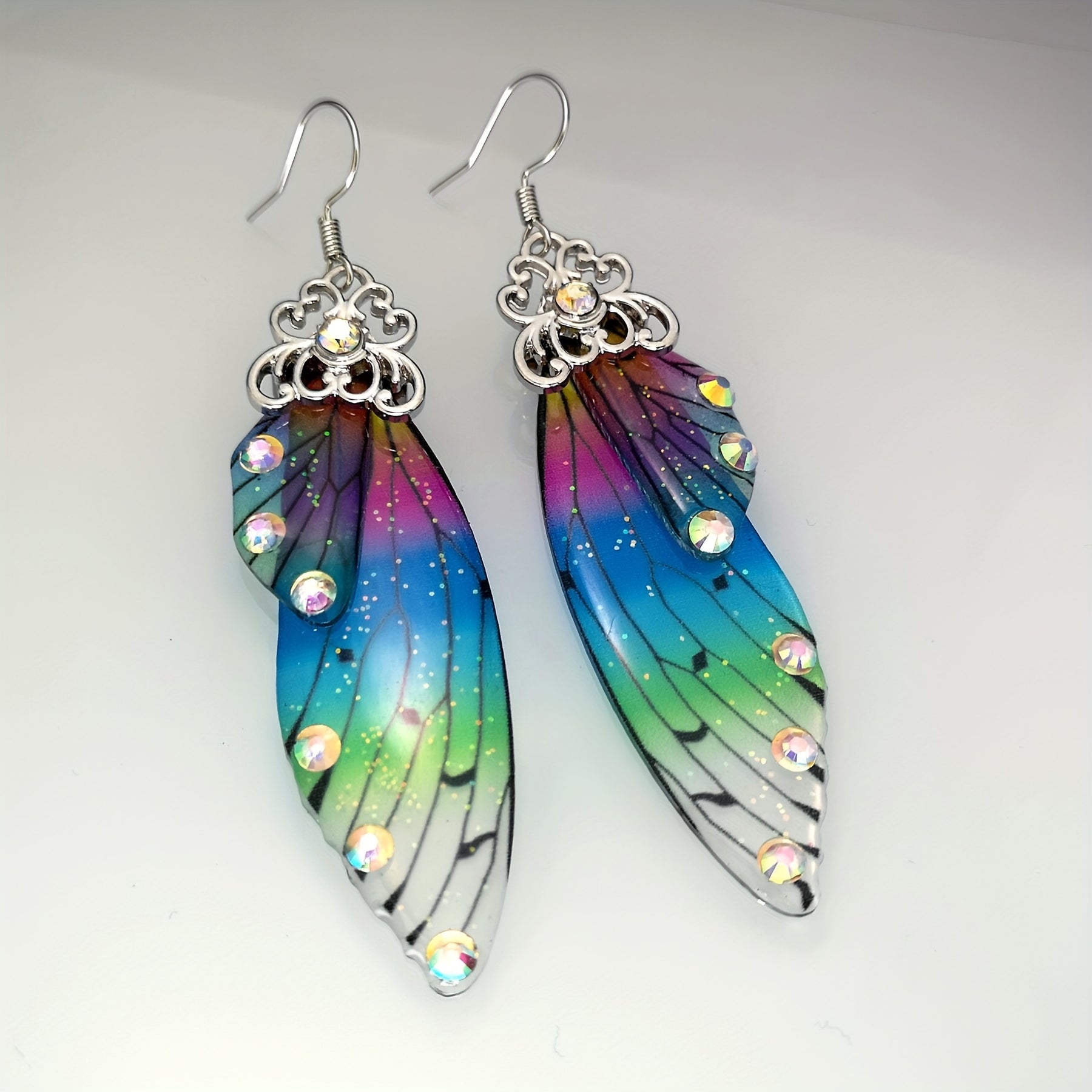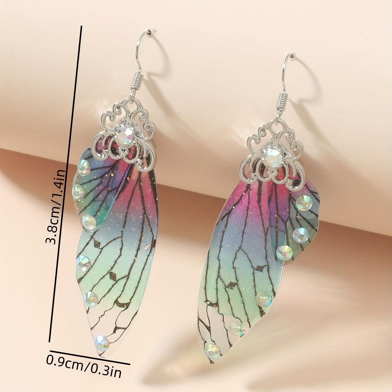 These rhinestone decorated stud earrings feature a unique cicada wing design with a gradient color effect. They are made of zinc alloy with a silver plated finish, making them a perfect gift for females who appreciate fairy-inspired accessories.