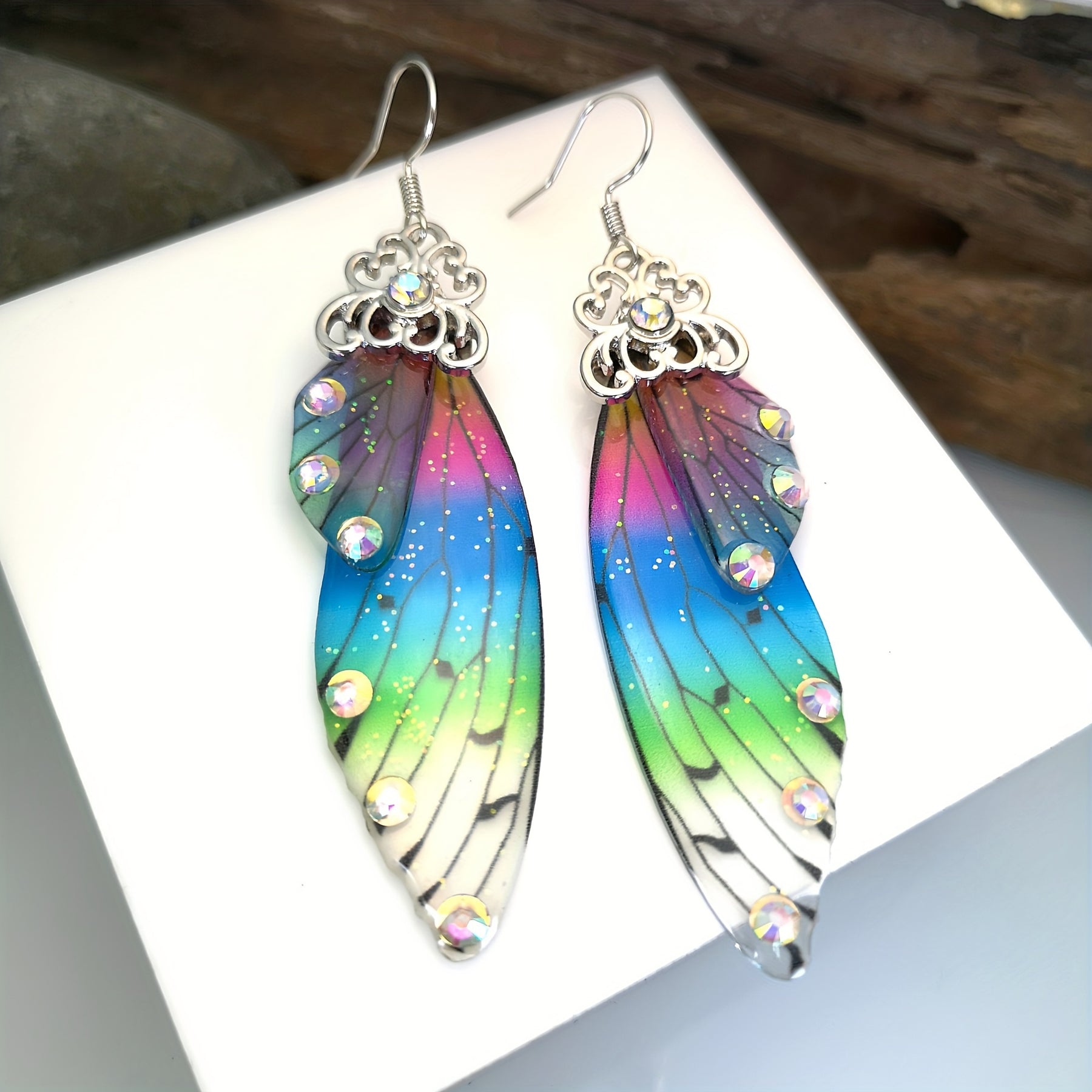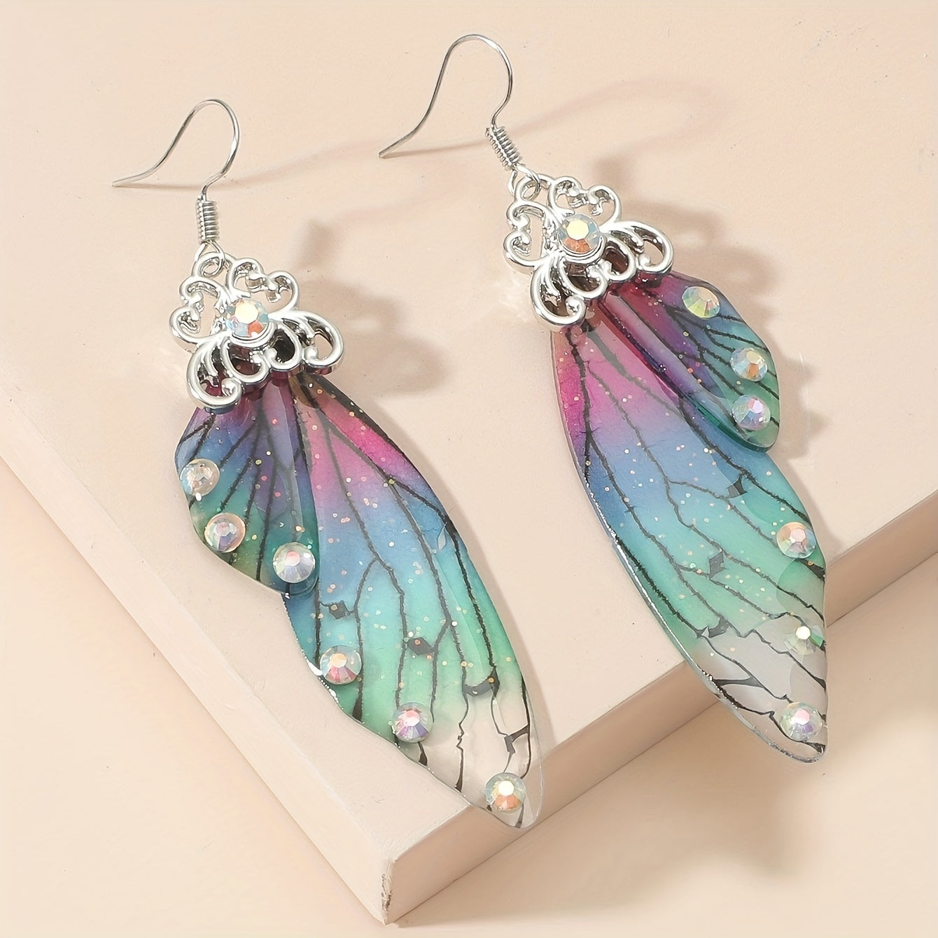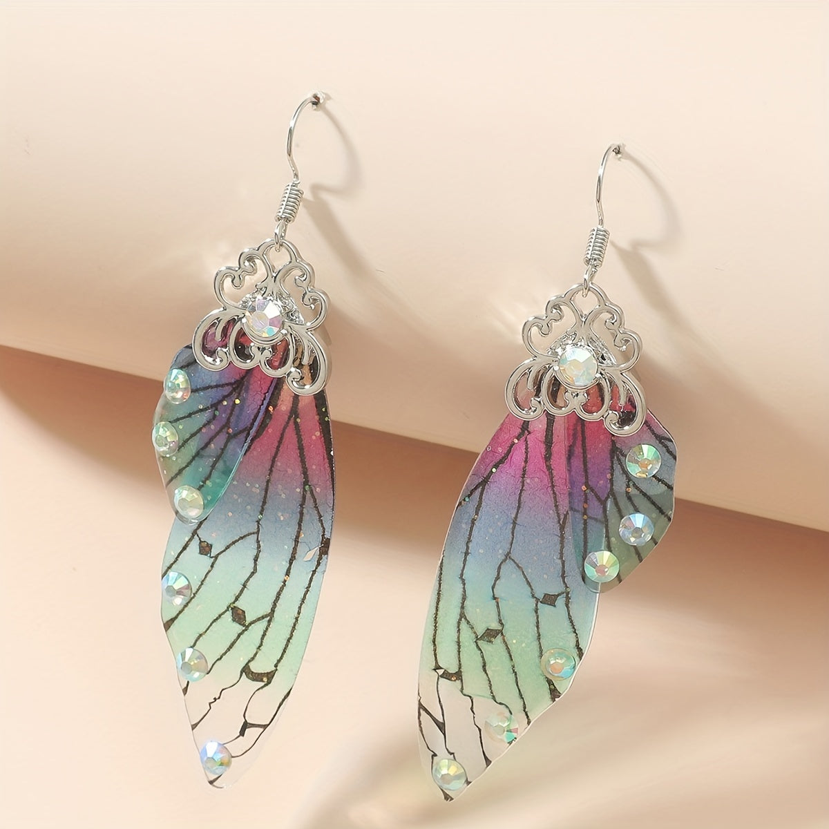 These rhinestone decorated stud earrings feature a unique cicada wing design with a gradient color effect. They are made of zinc alloy with a silver plated finish, making them a perfect gift for females who appreciate fairy-inspired accessories.