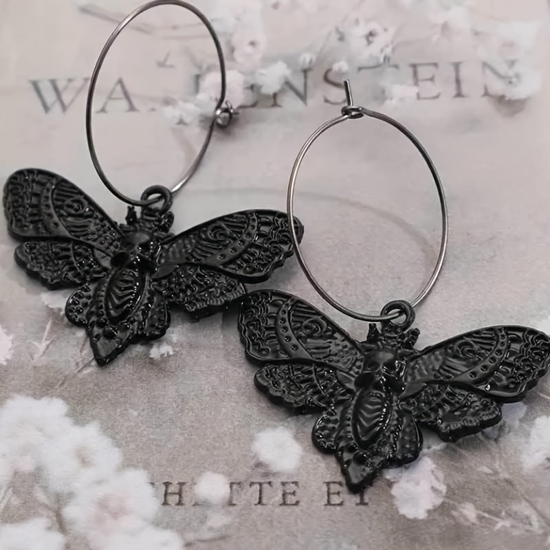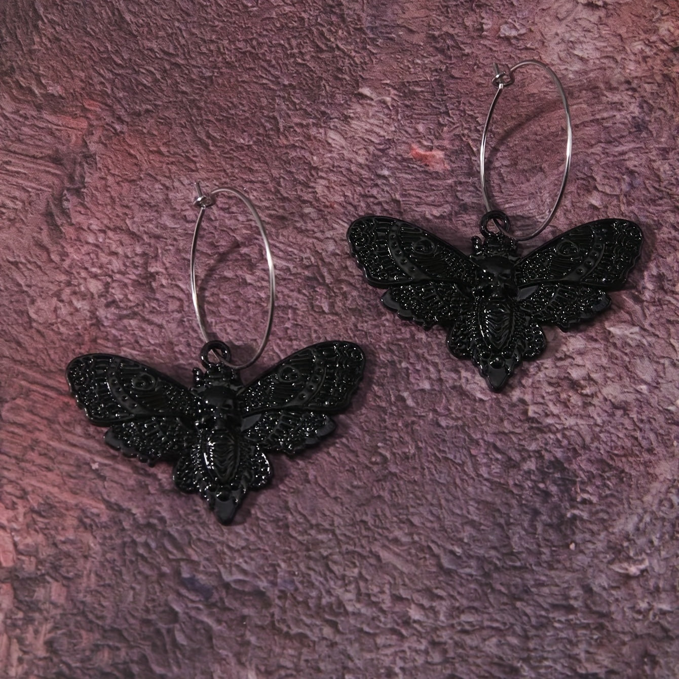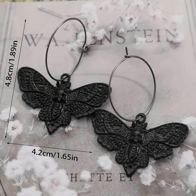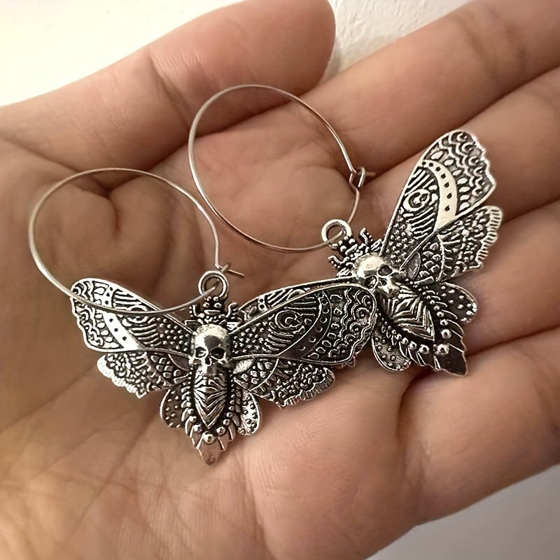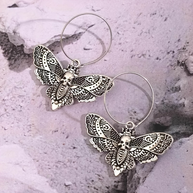 Unique and creative zinc alloy earrings with a classical gothic design featuring a moth and skull dangle. Perfect for men who love retro style accessories.