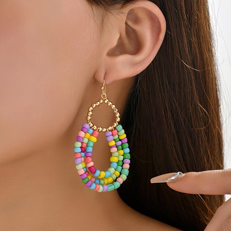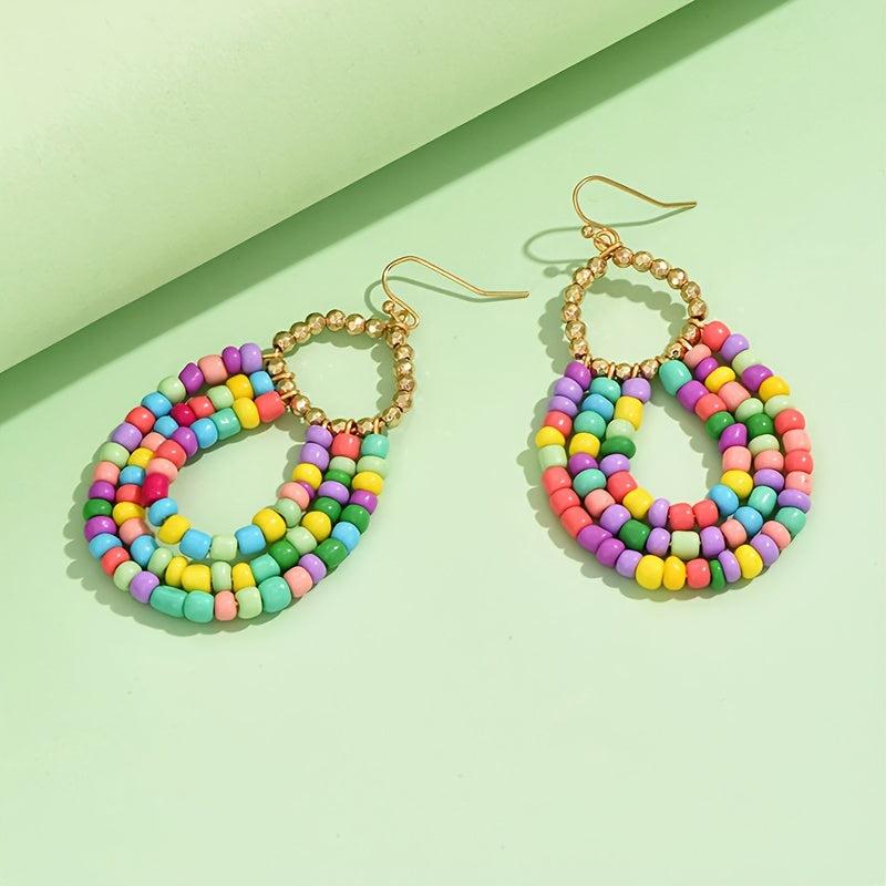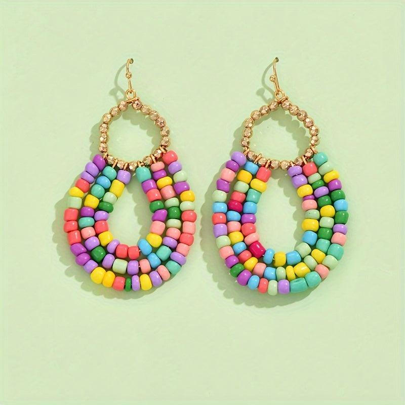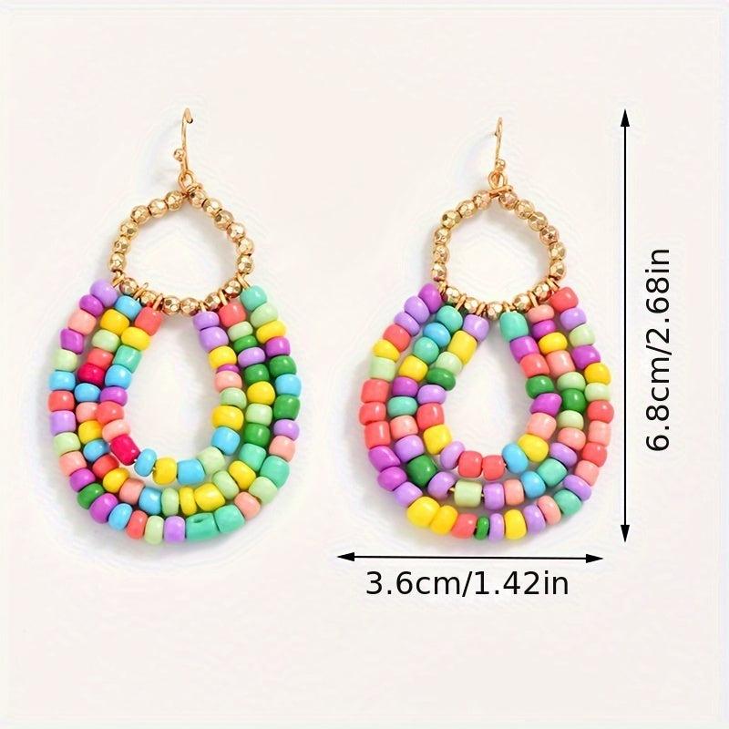 Add a pop of color to your outfit with these bohemian vacation style statement earrings featuring woven seed beads. Perfect for a fun and vibrant look!