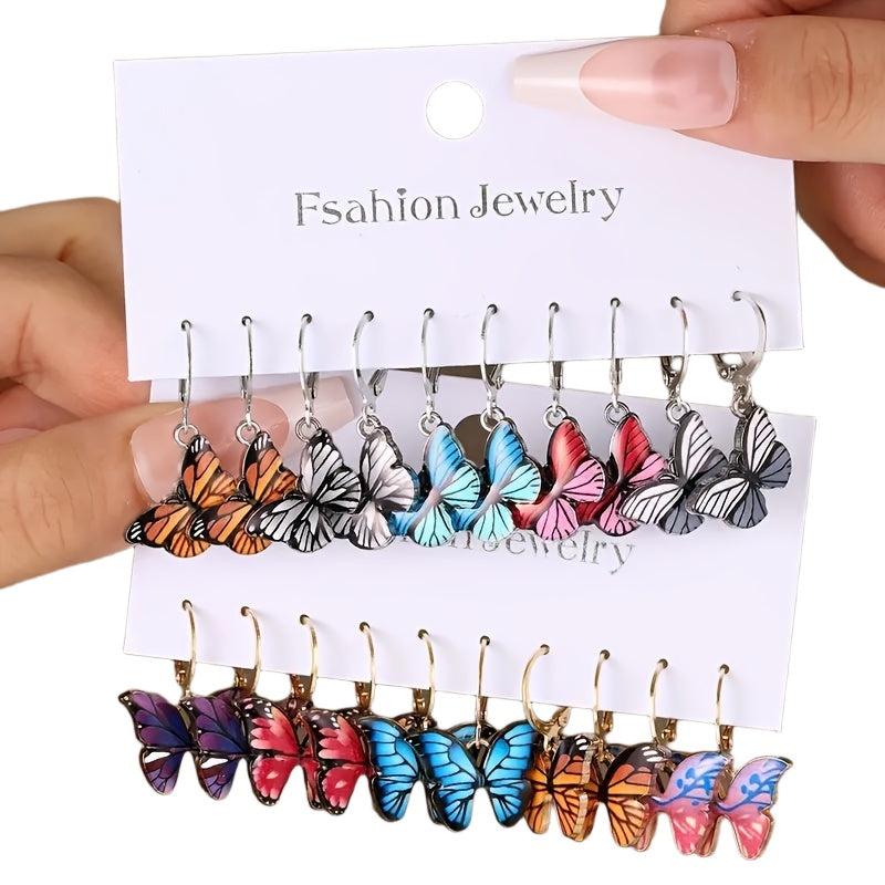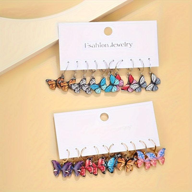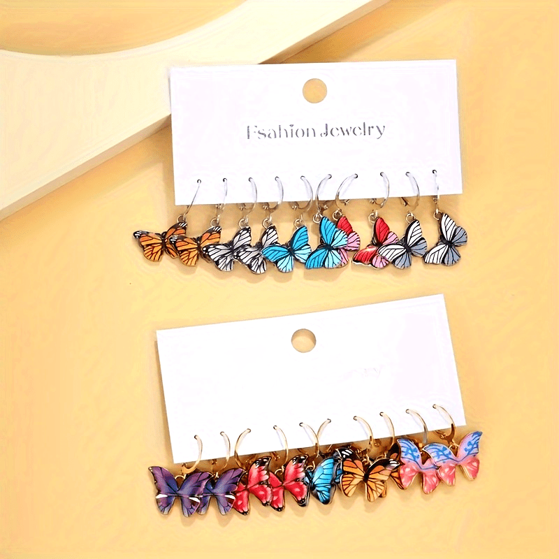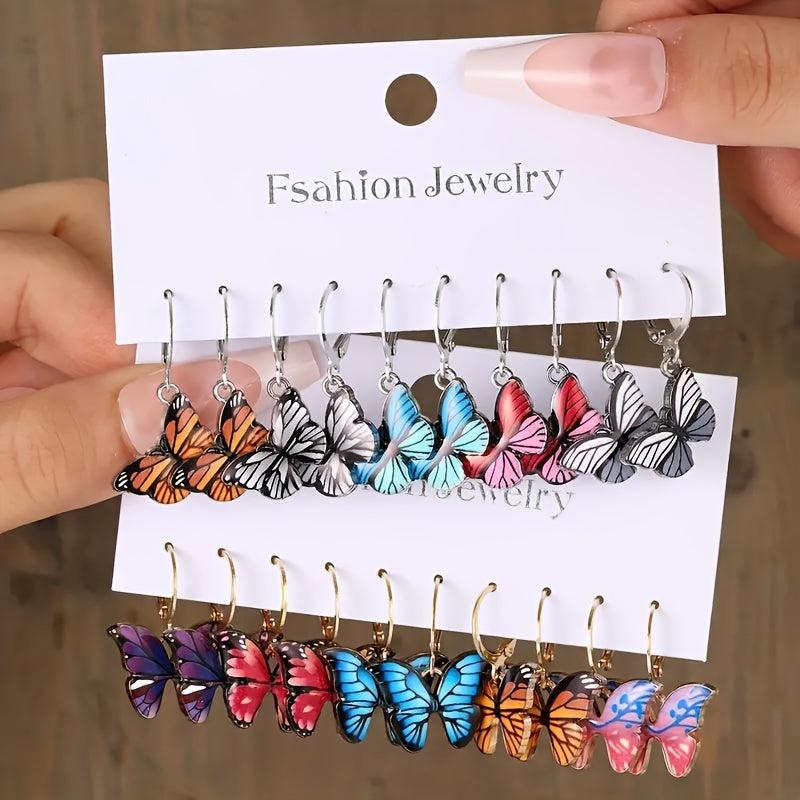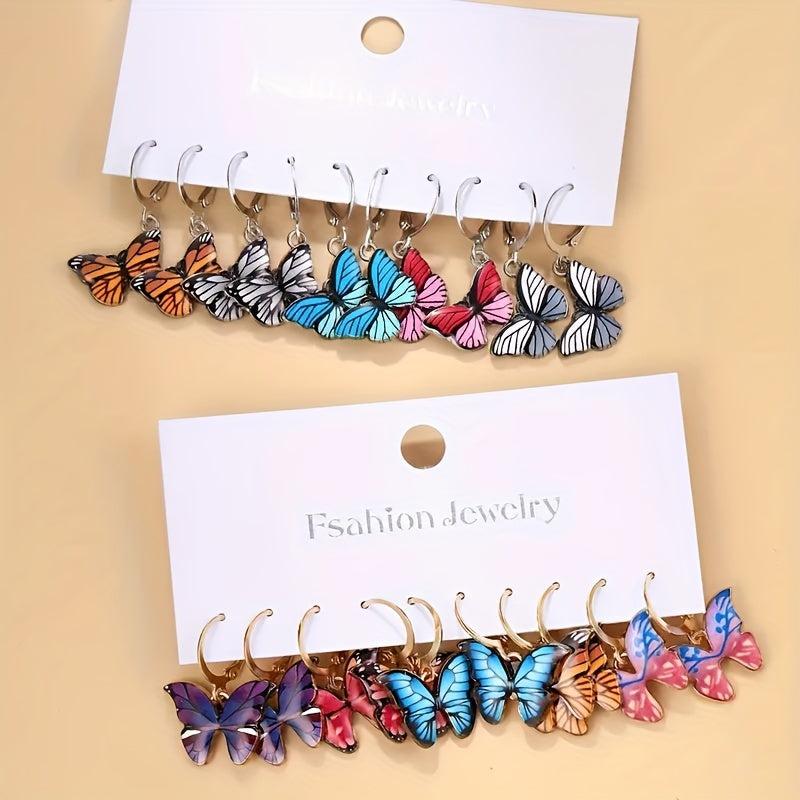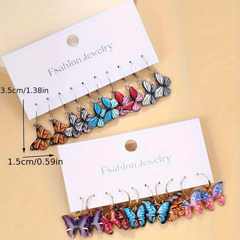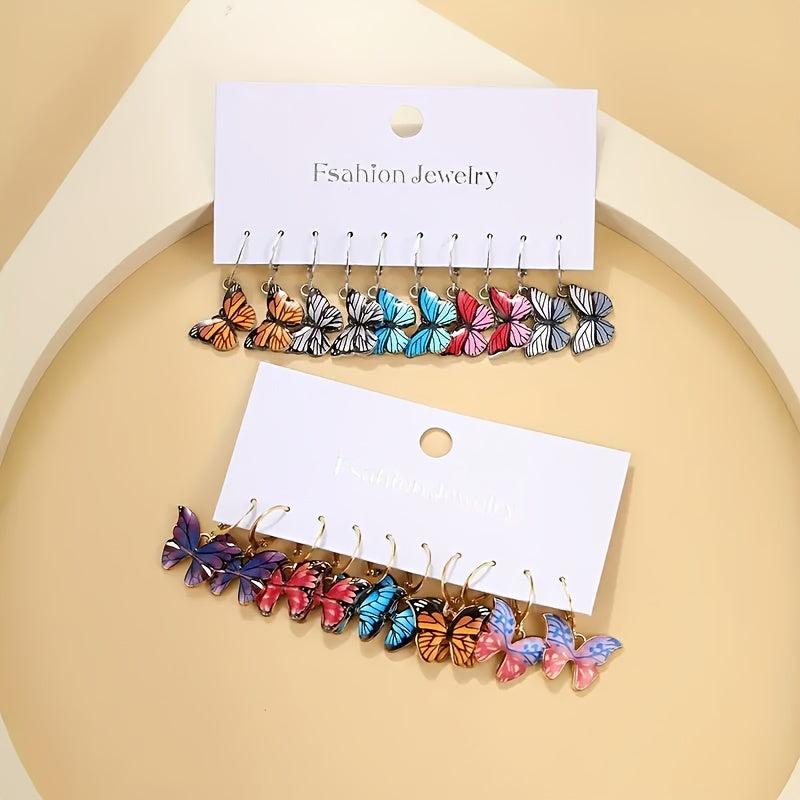 Add a touch of vintage bohemian style with this set of 10 pairs of colorful butterfly pendant hoop earrings. Made from zinc alloy, these earrings make a perfect gift for females who love unique and personality-filled jewelry.