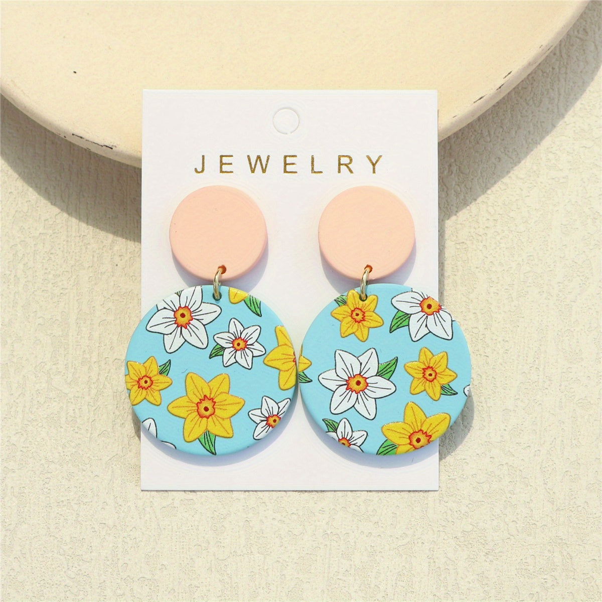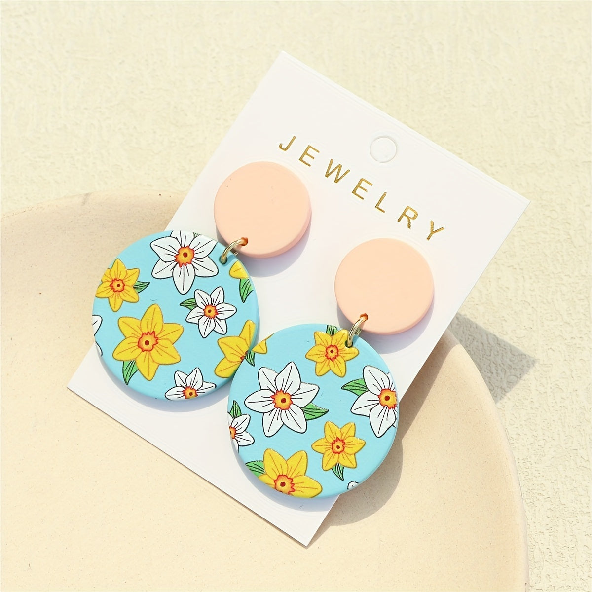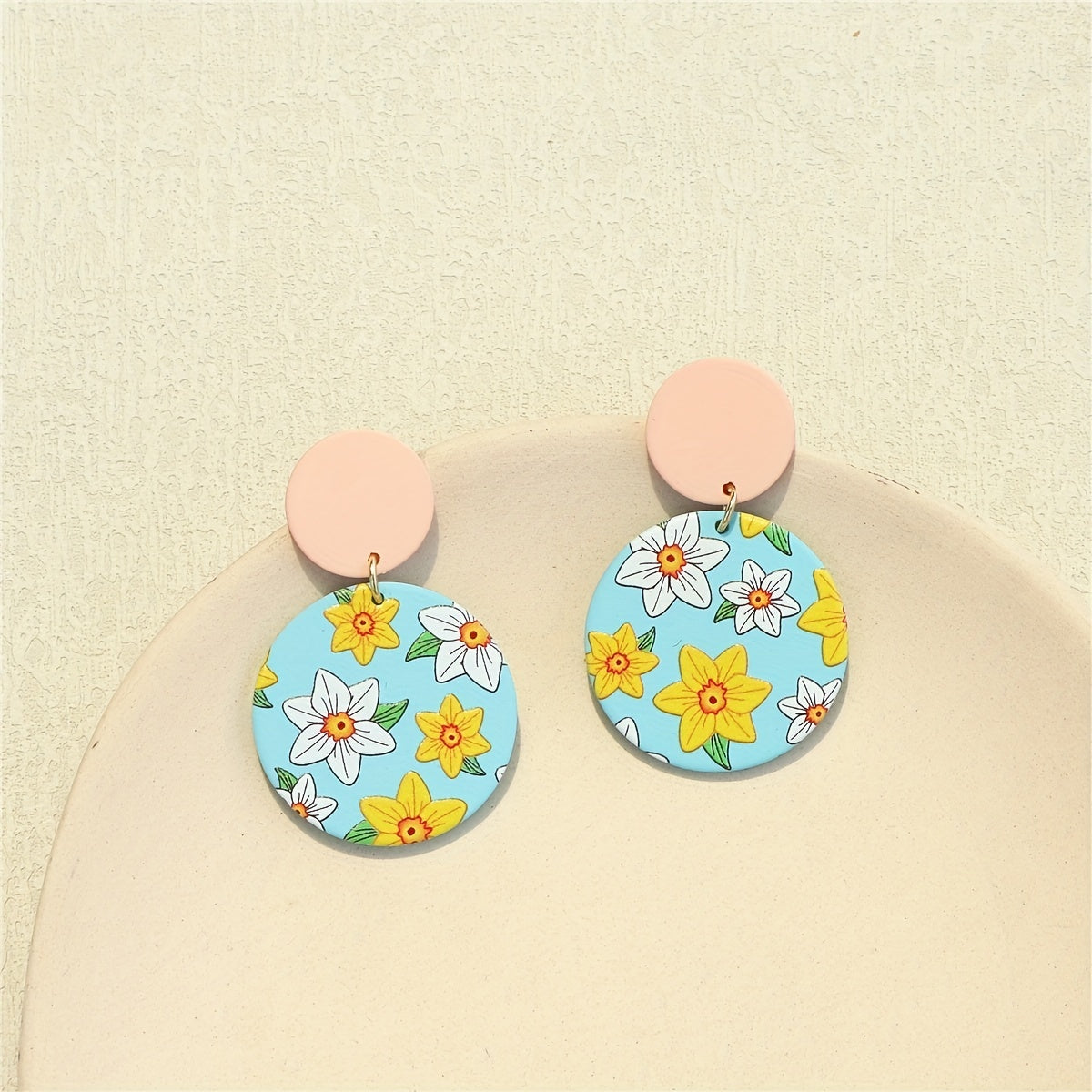 These charming dangle earrings feature a round shape with colorful flower patterns, perfect for adding a touch of pastoral style to any outfit. Made of acrylic, these earrings are delicate and make an excellent gift for females.