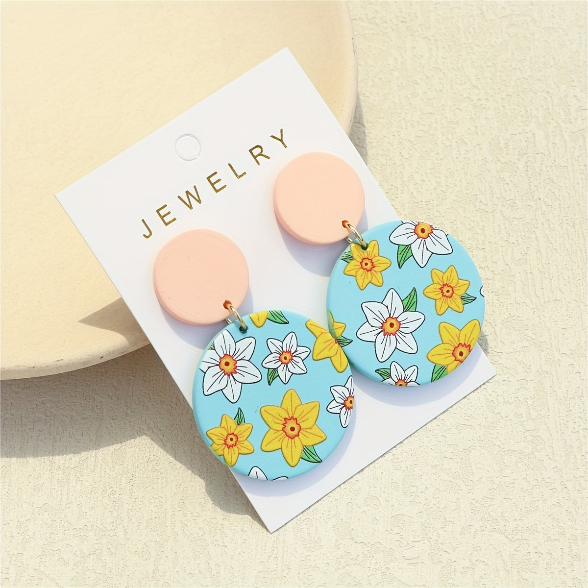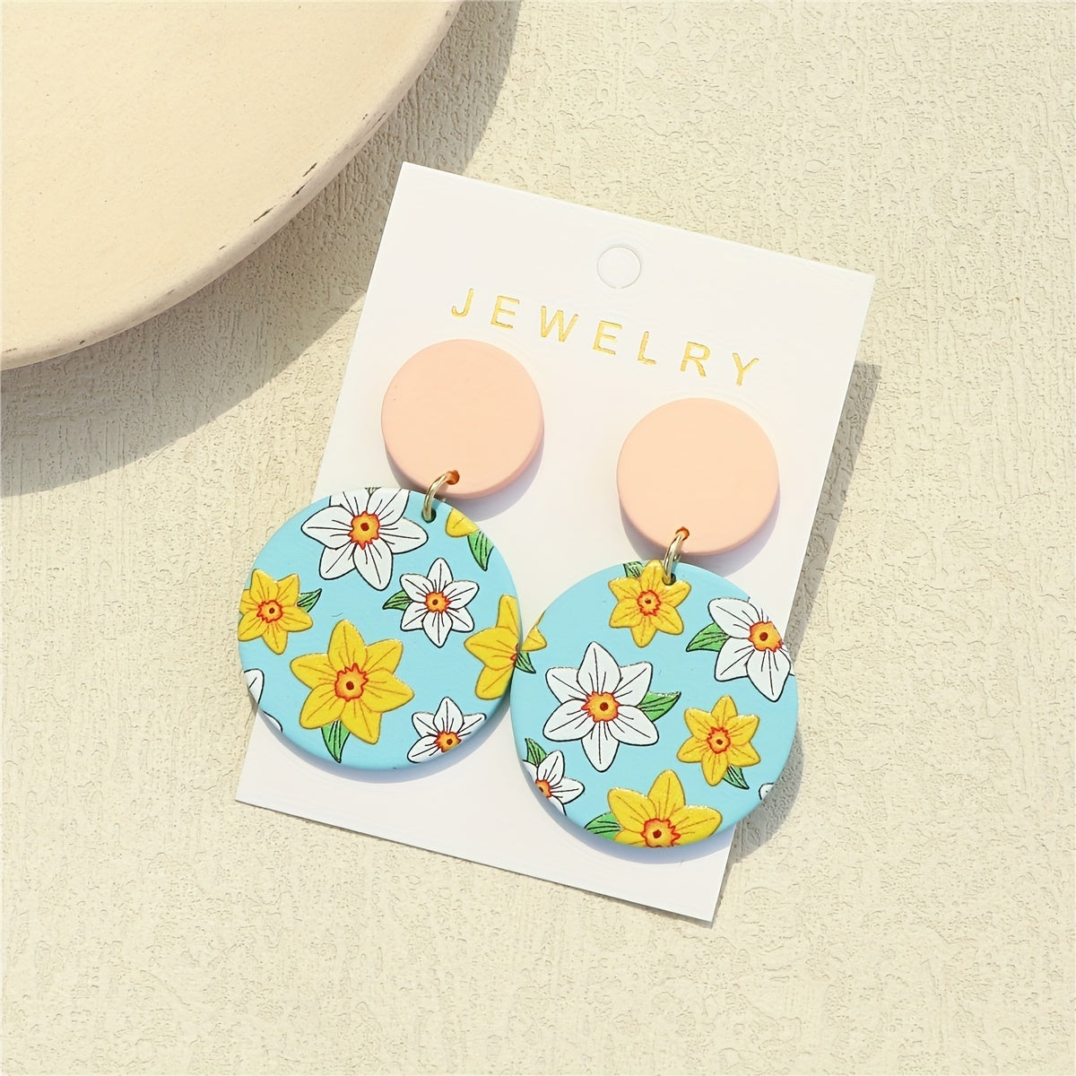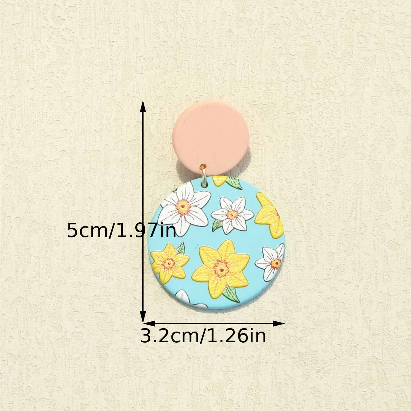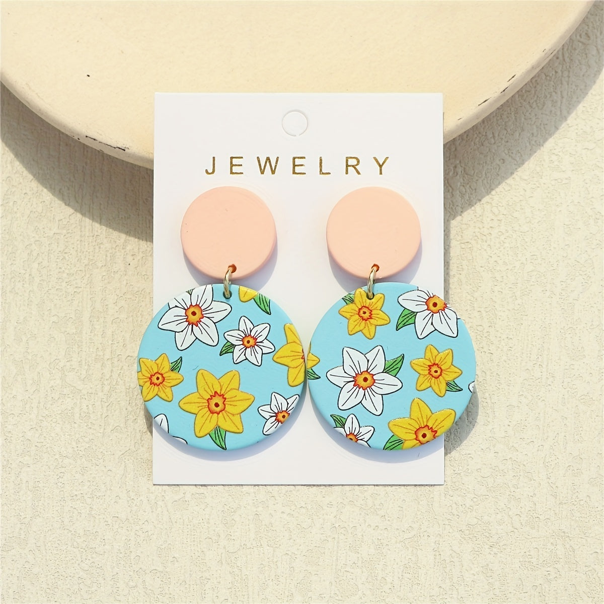 These charming dangle earrings feature a round shape with colorful flower patterns, perfect for adding a touch of pastoral style to any outfit. Made of acrylic, these earrings are delicate and make an excellent gift for females.