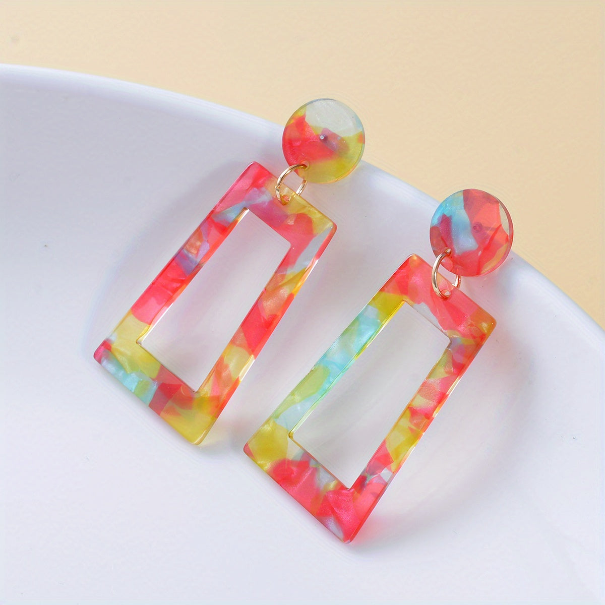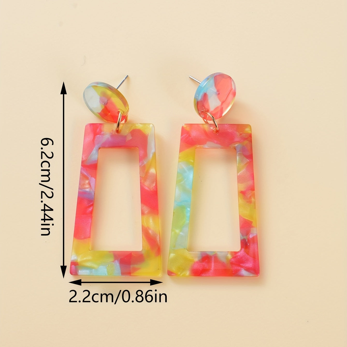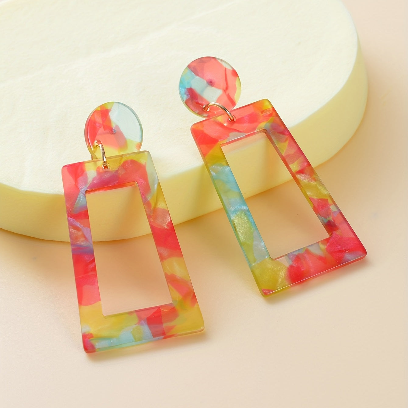 These colorful dangle earrings feature hollow geometric shapes in a Japanese style design. Made from acrylic, they make a great gift for females.