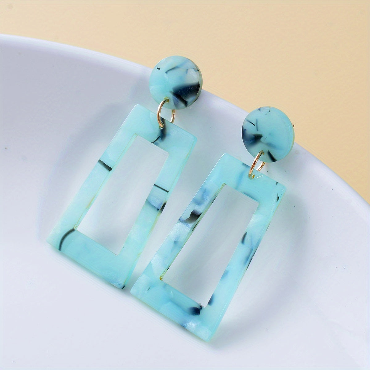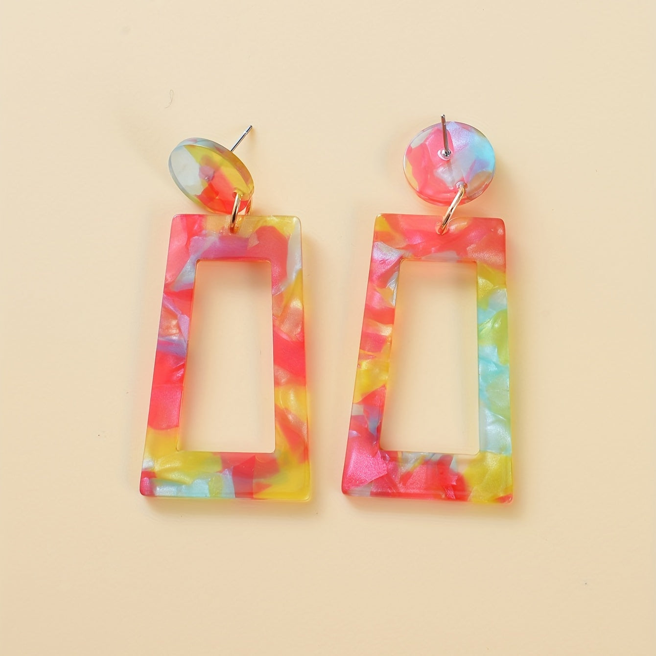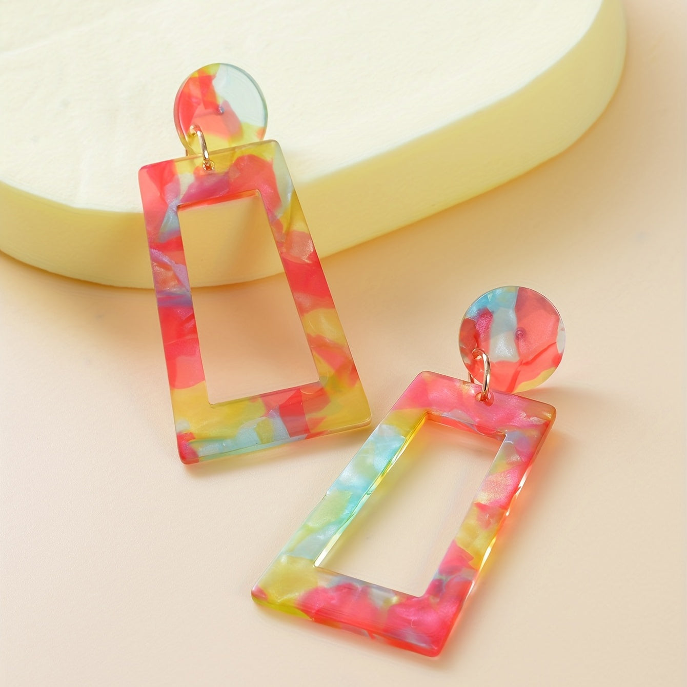 These colorful dangle earrings feature hollow geometric shapes in a Japanese style design. Made from acrylic, they make a great gift for females.