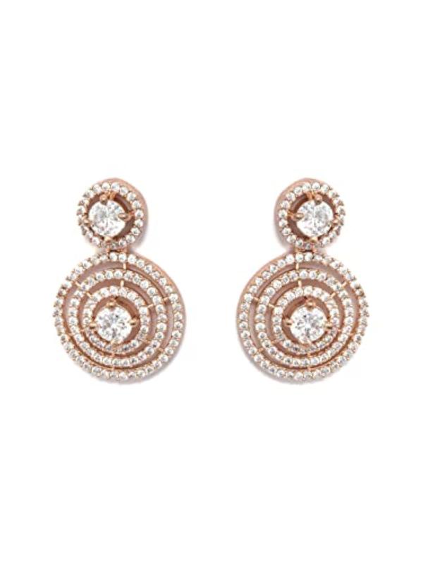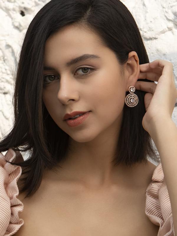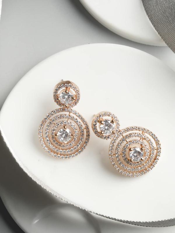 These elegant earrings feature round halo design with a modern touch, plated for a stylish look. Perfect for adding sparkle to any outfit.