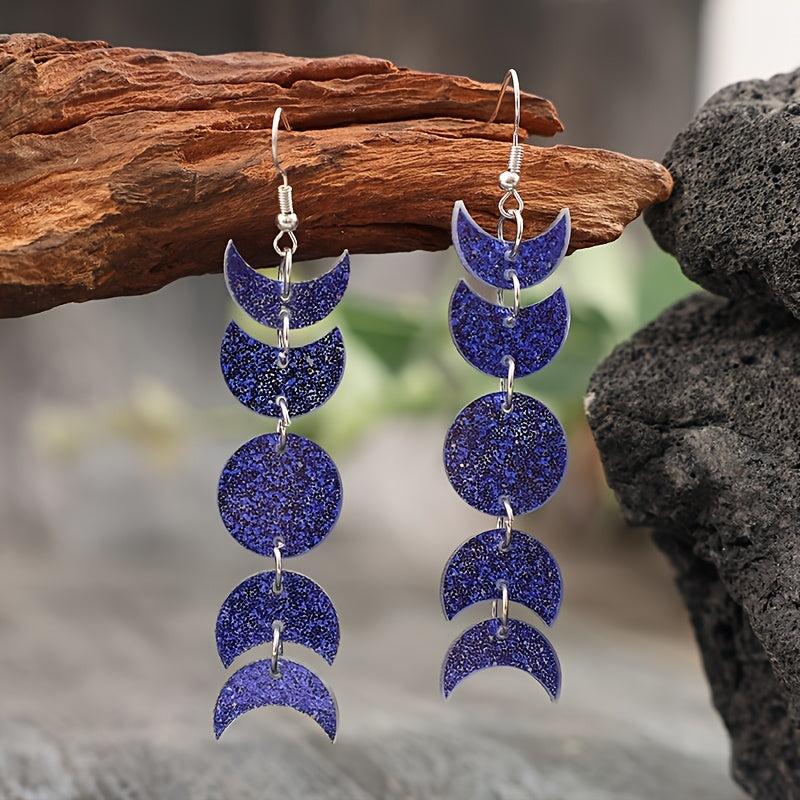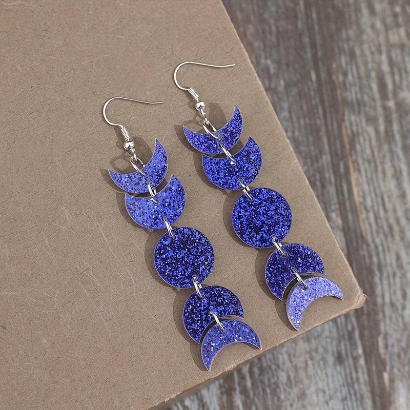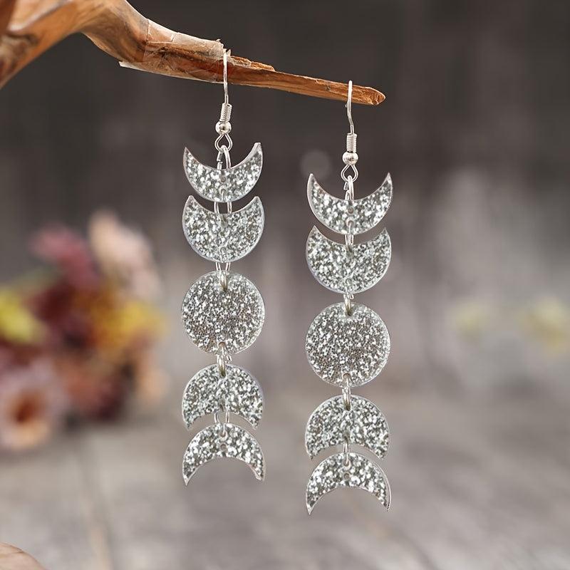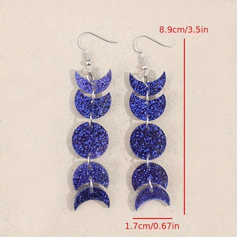 Add a touch of creativity to your outfit with these long earrings featuring crescent moon and circle sequins made of acrylic material.
