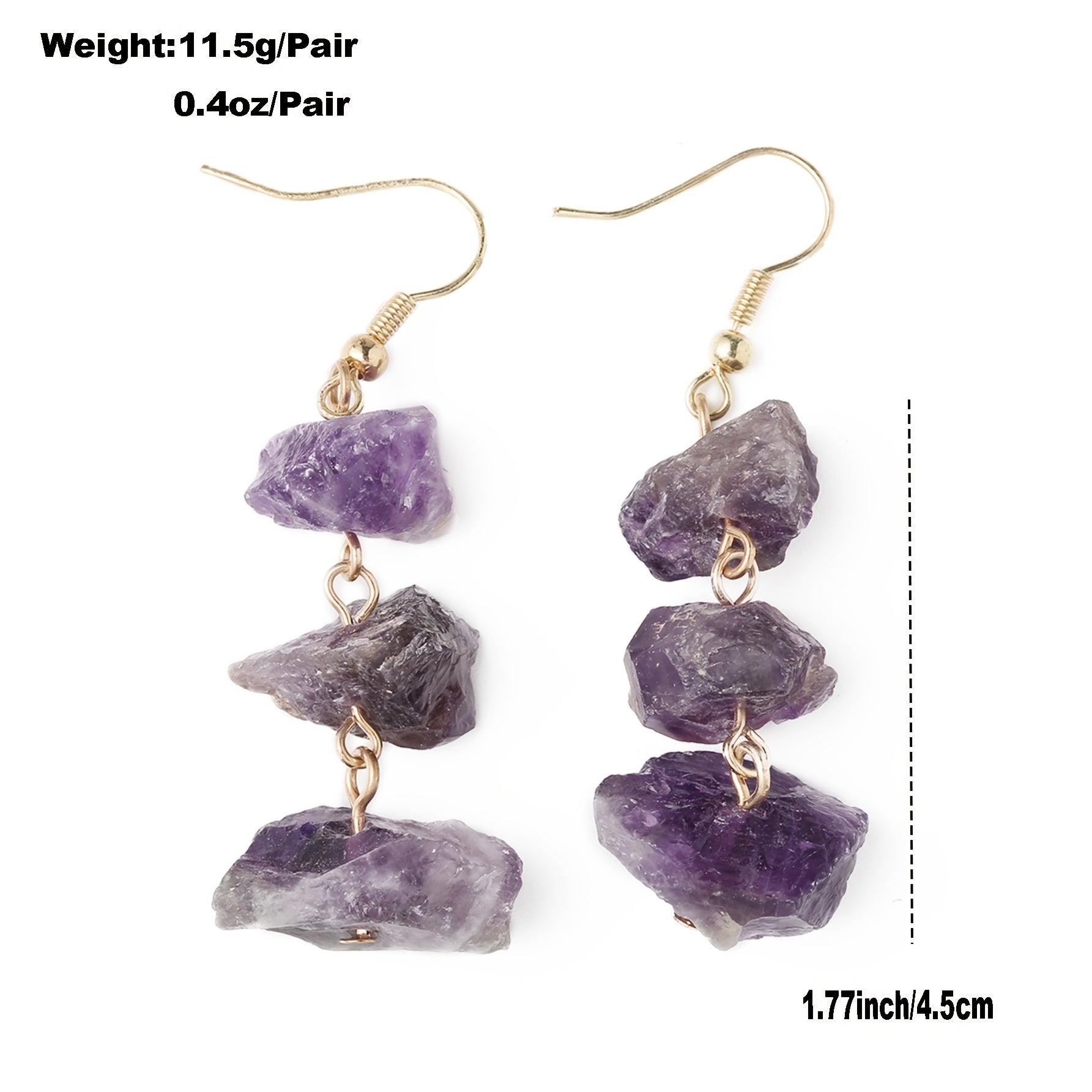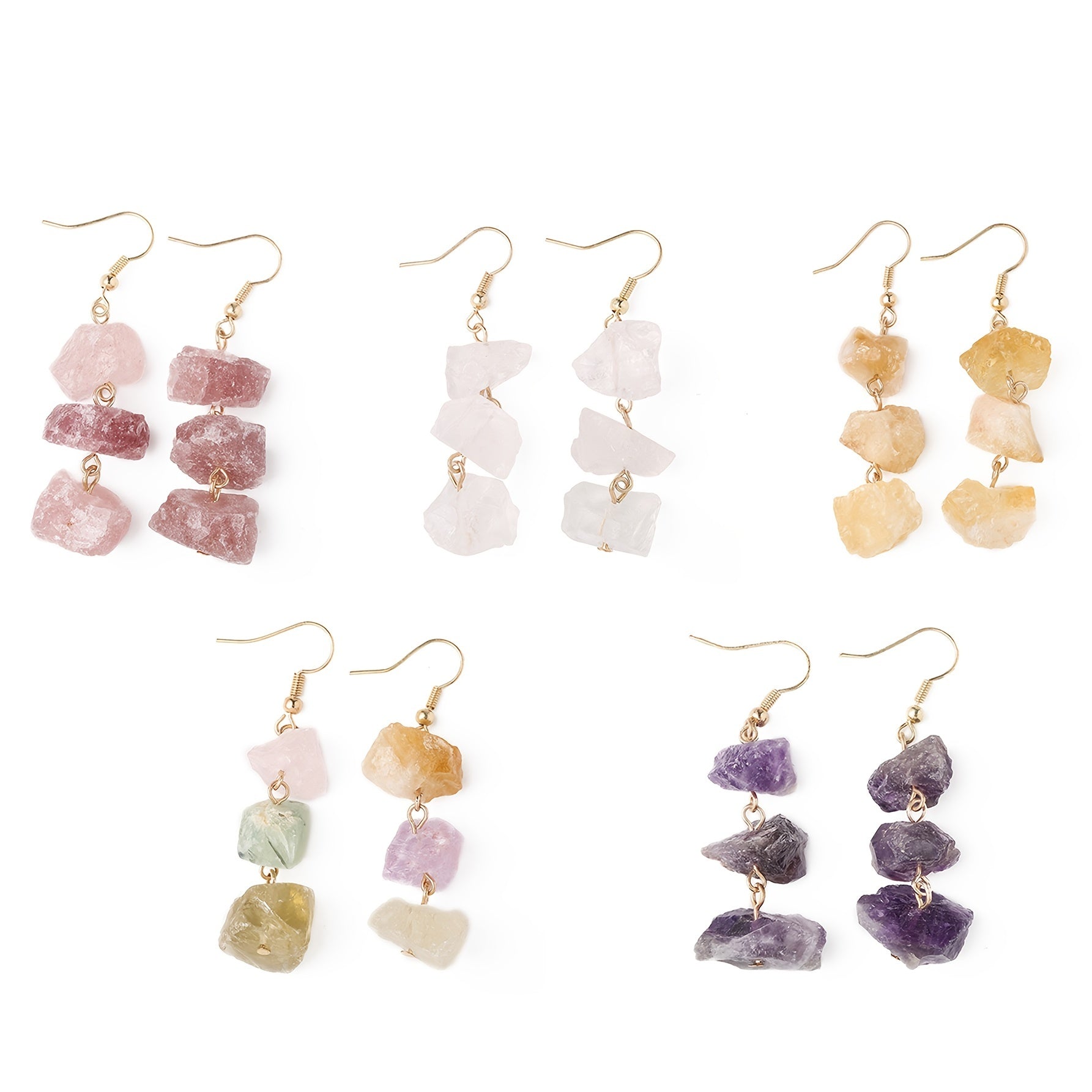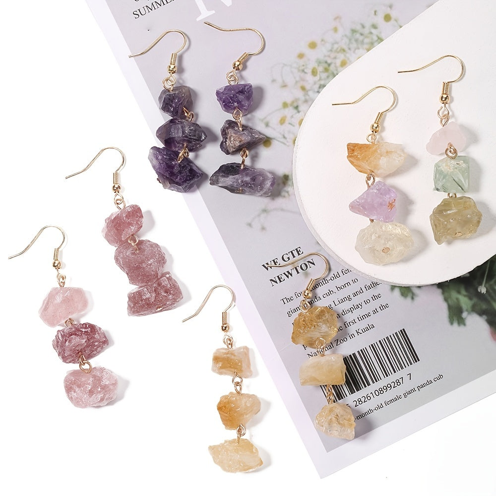These earrings feature irregular crystal beads with colorful stone pendants for energy healing and anxiety relief.
