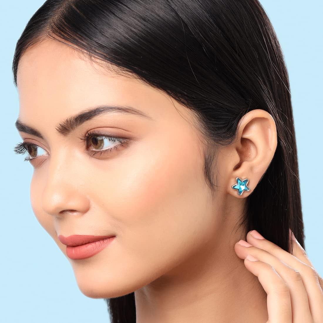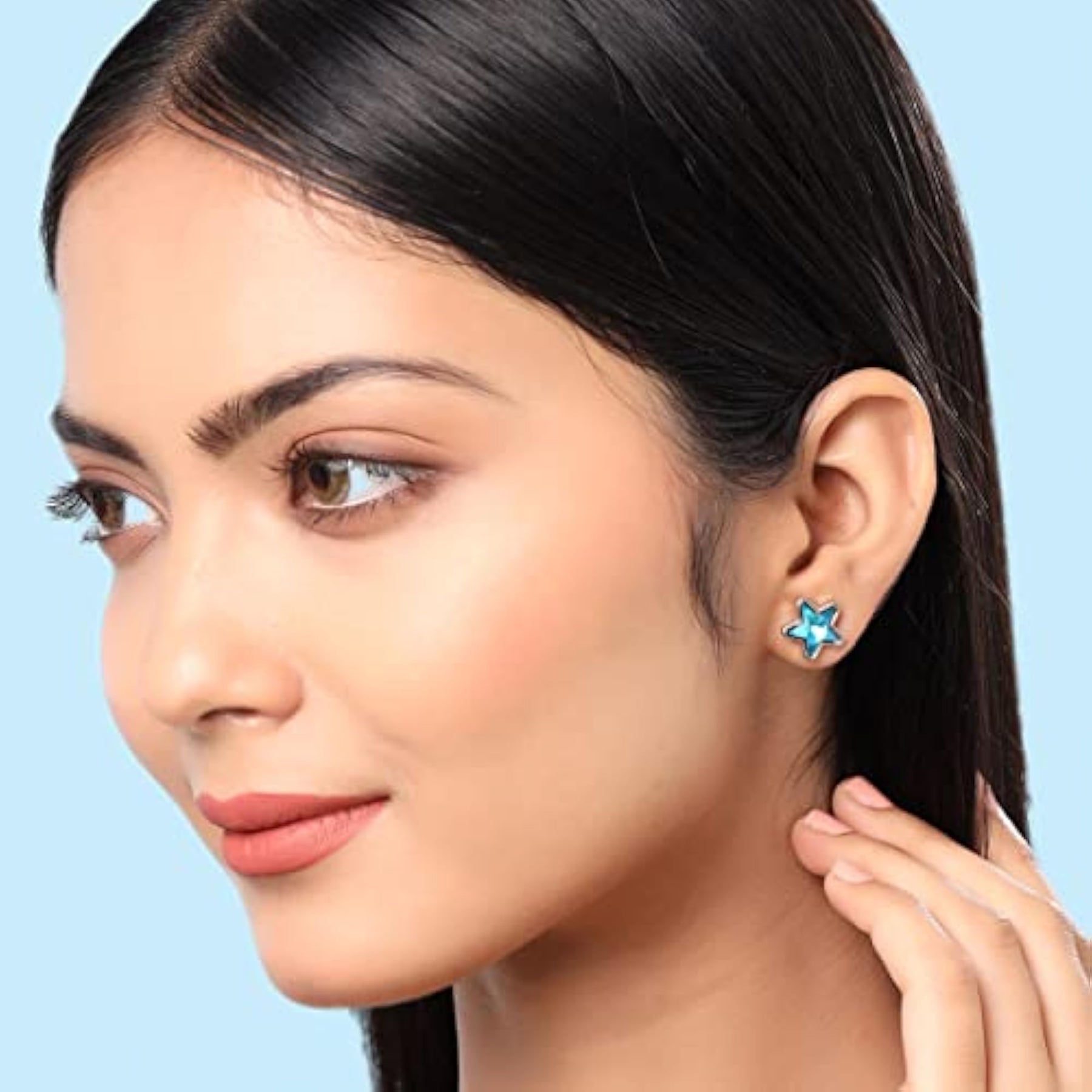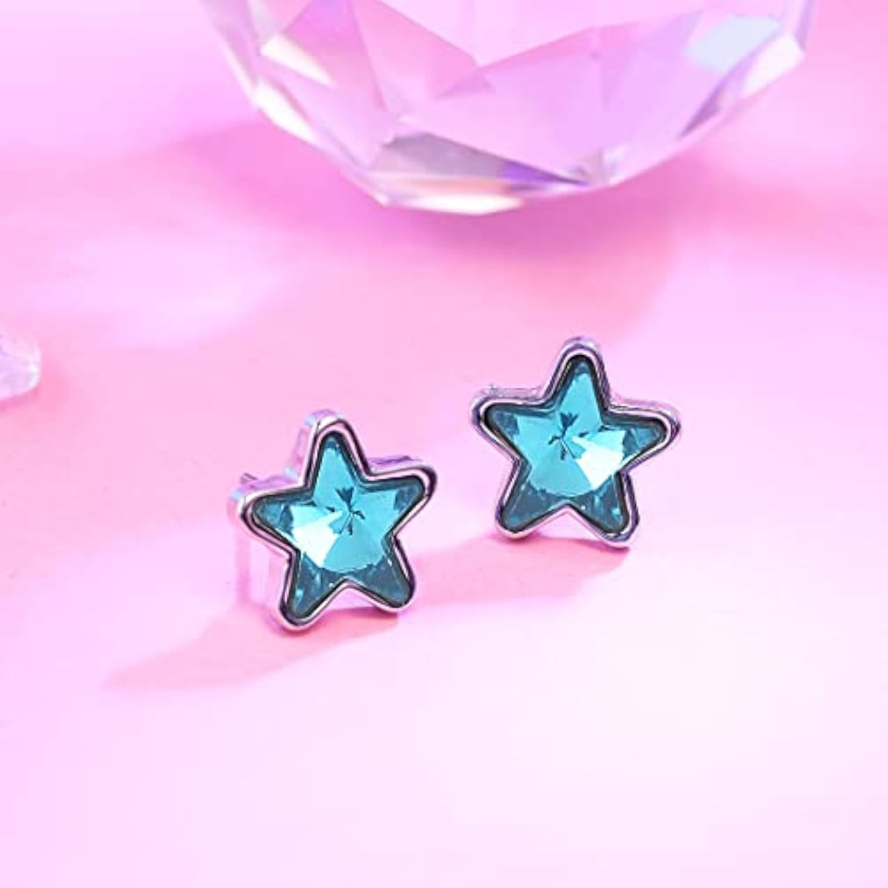 Beautiful silver tone star stud earrings with crystal accents. Perfect gift for girls and women on birthdays or anniversaries.