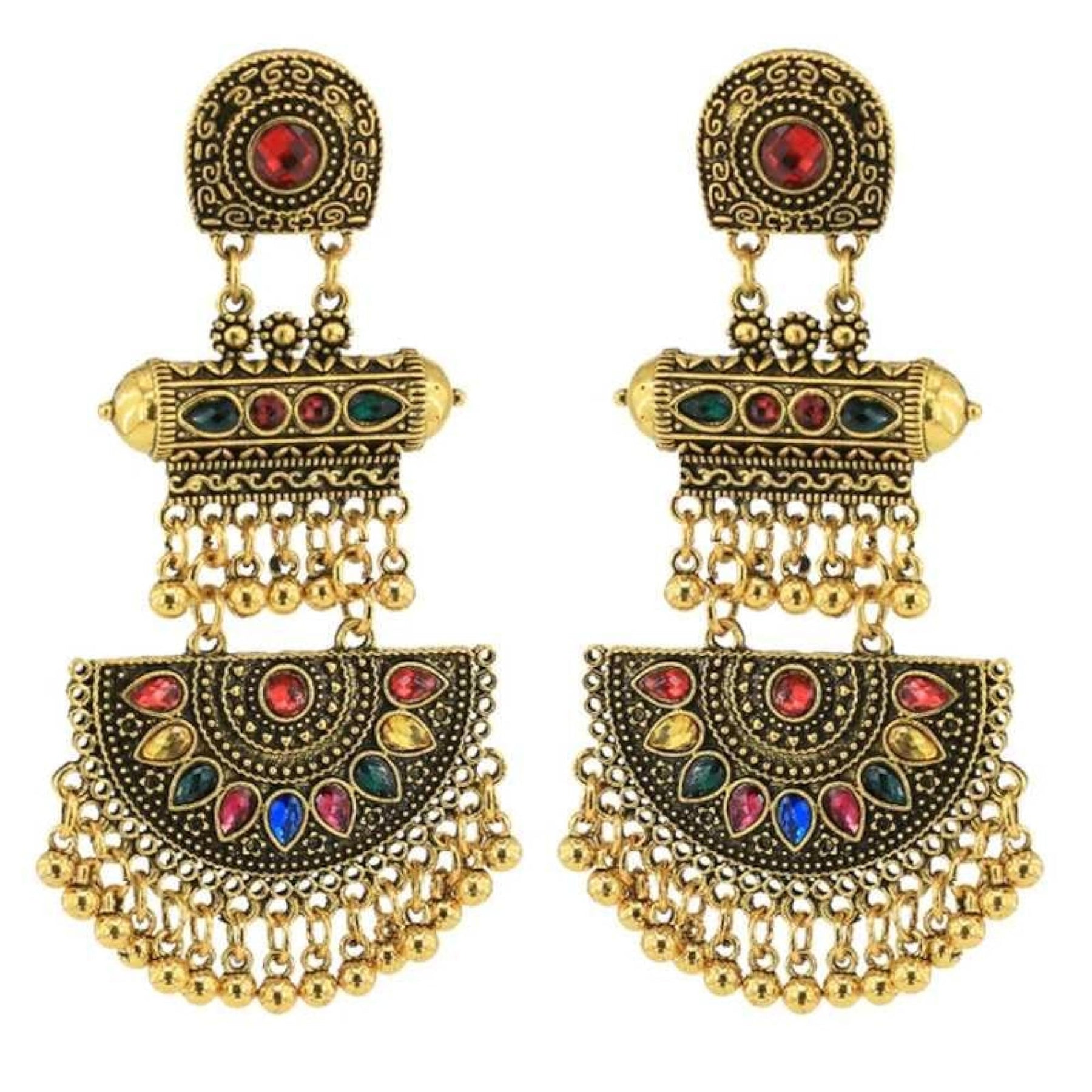 Elegant long dangle earrings featuring tassel bead drops with cubic zirconia stones in a golden oxidized finish. These statement earrings are perfect for adding a touch of glamour to any outfit.