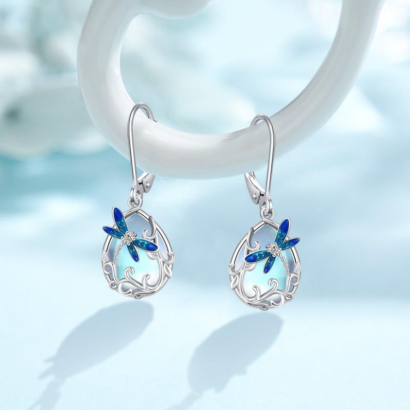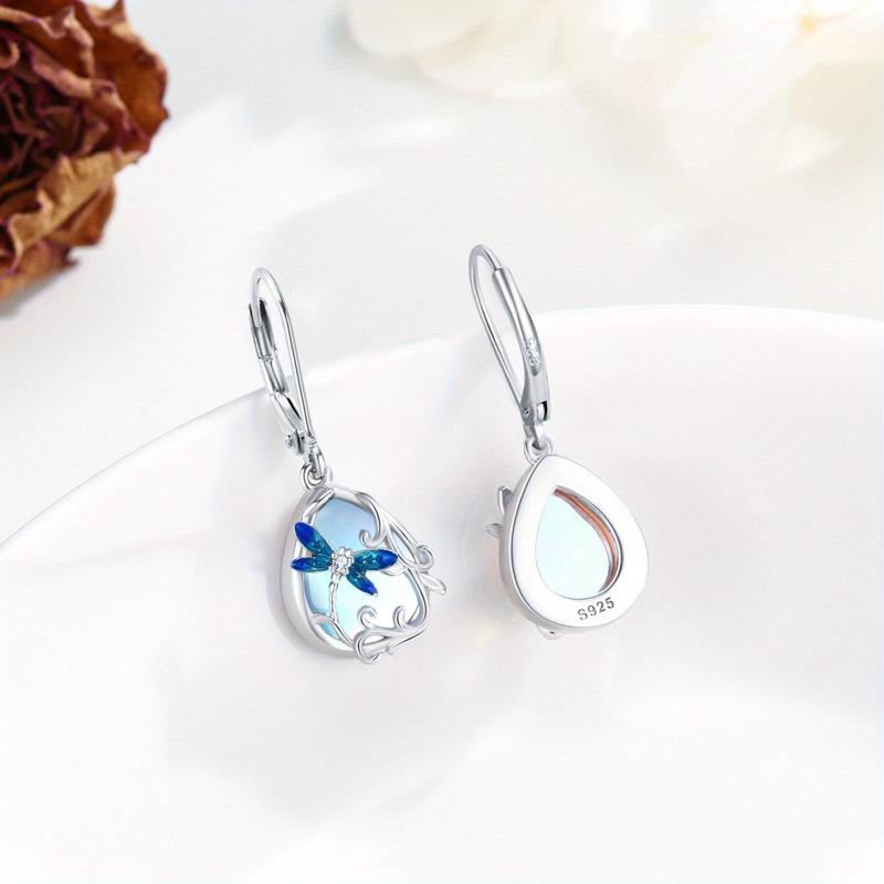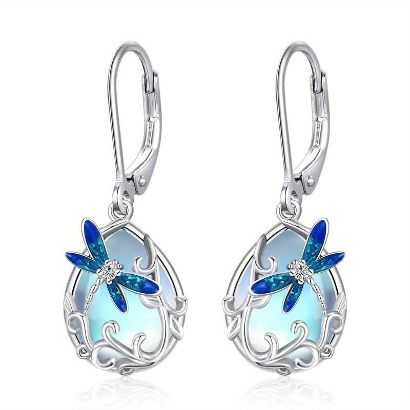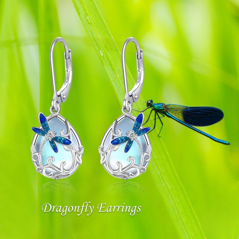 These stunning leverback earrings feature a dragonfly design with moonstone accents, perfect for birthdays, anniversaries, or any special occasion.