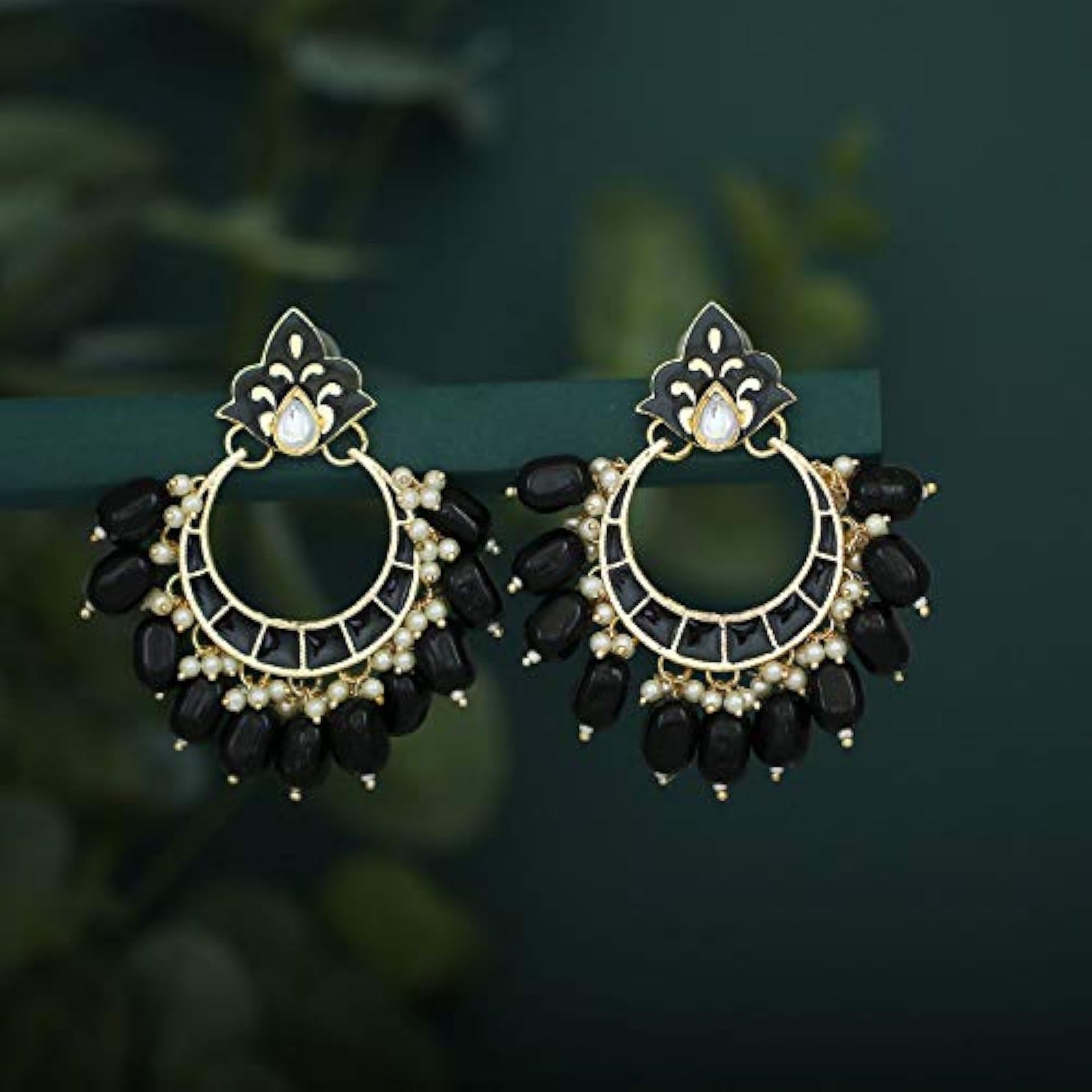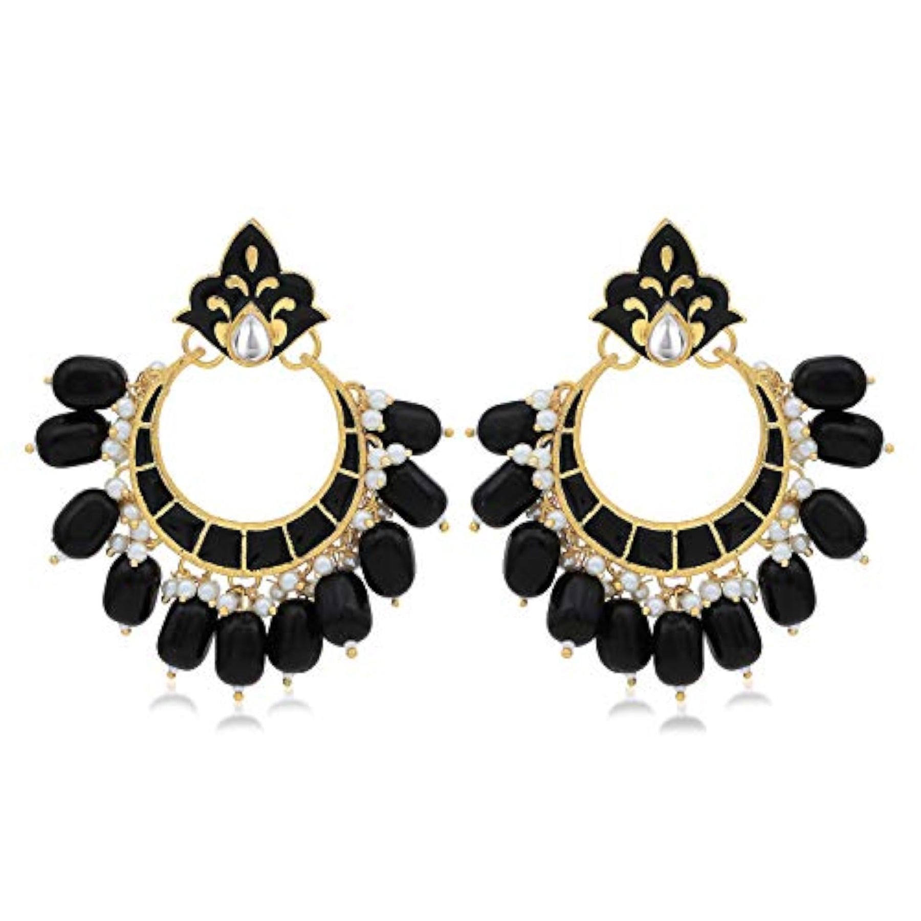 Add a touch of elegance with these stunning pearl plated chandbali earrings featuring kundan and meenakari work.