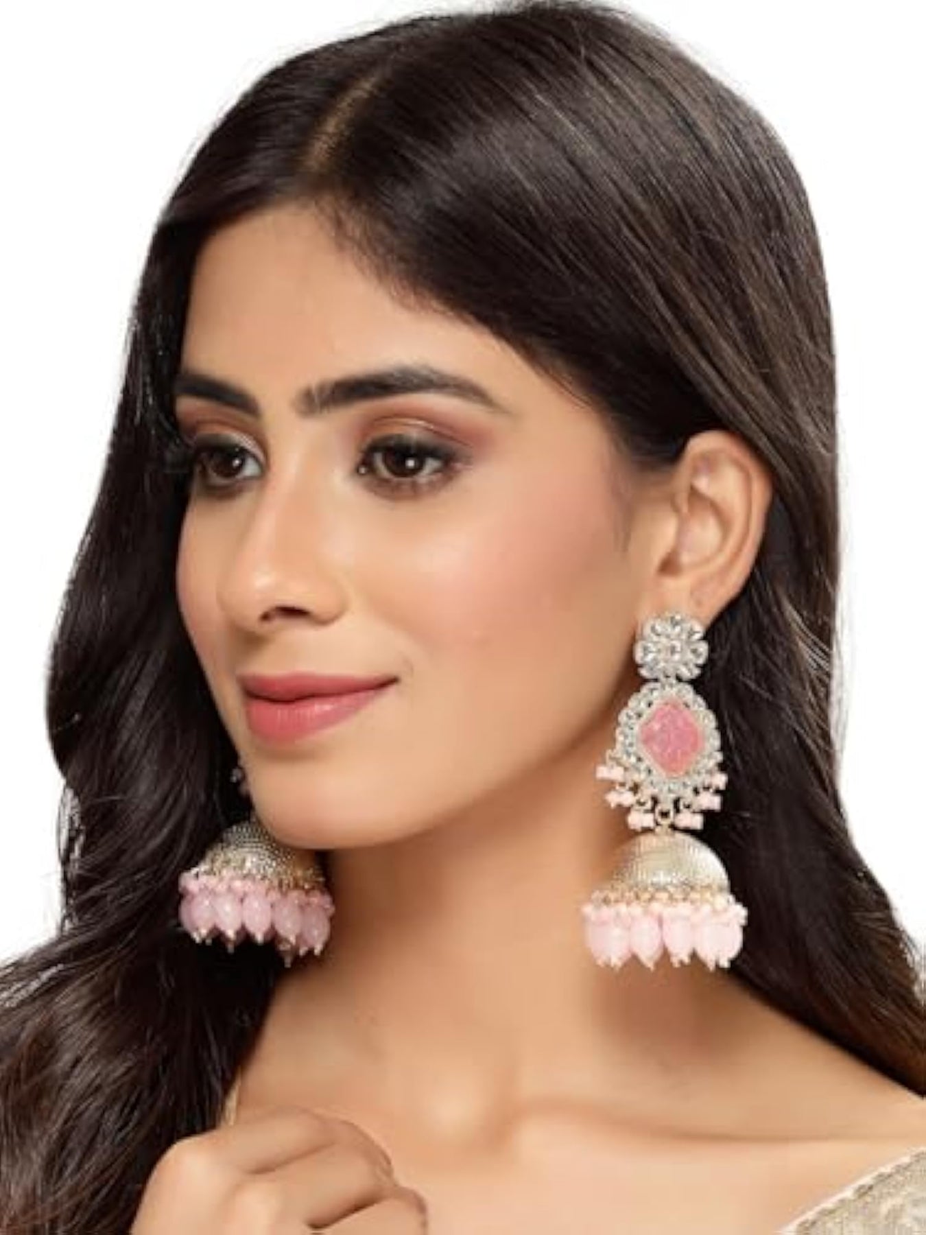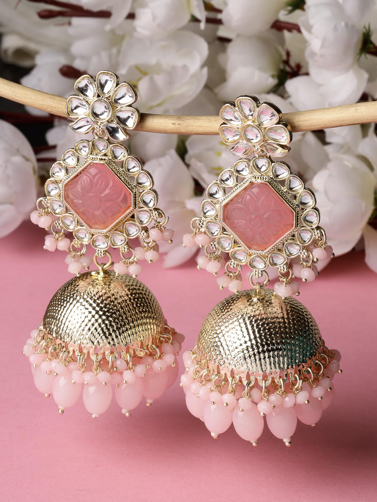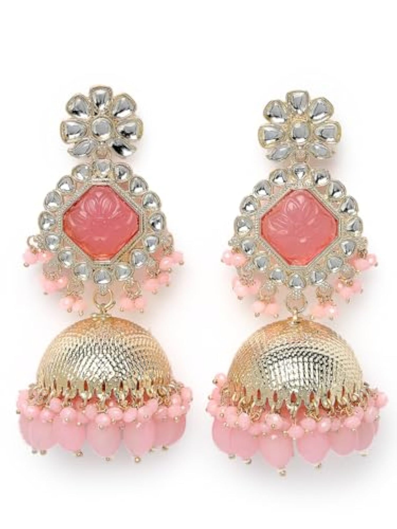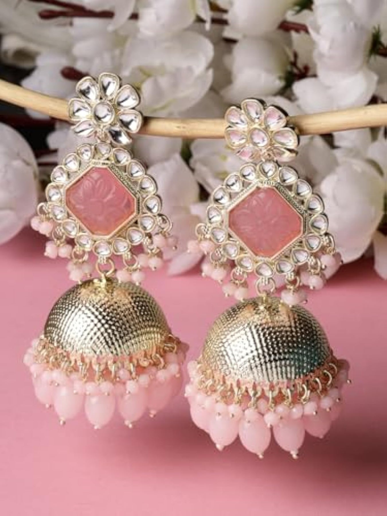 Add a touch of glamour with these beautiful Kundan jhumka earrings. Perfect for any occasion.