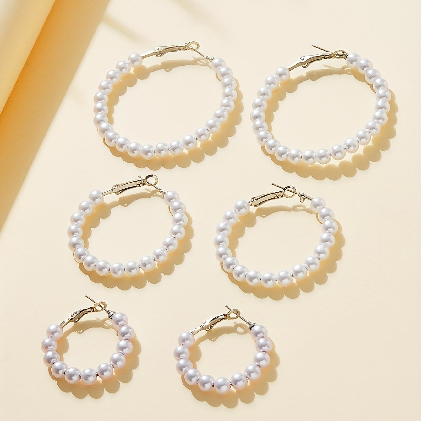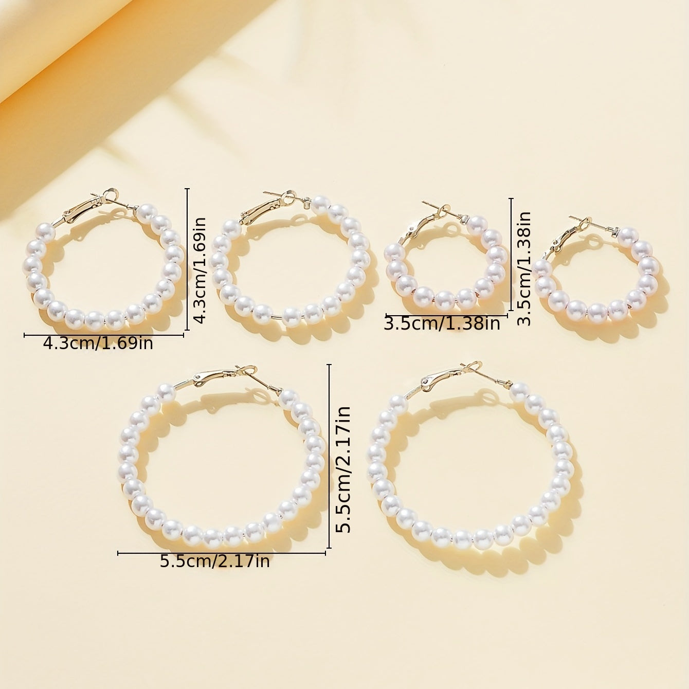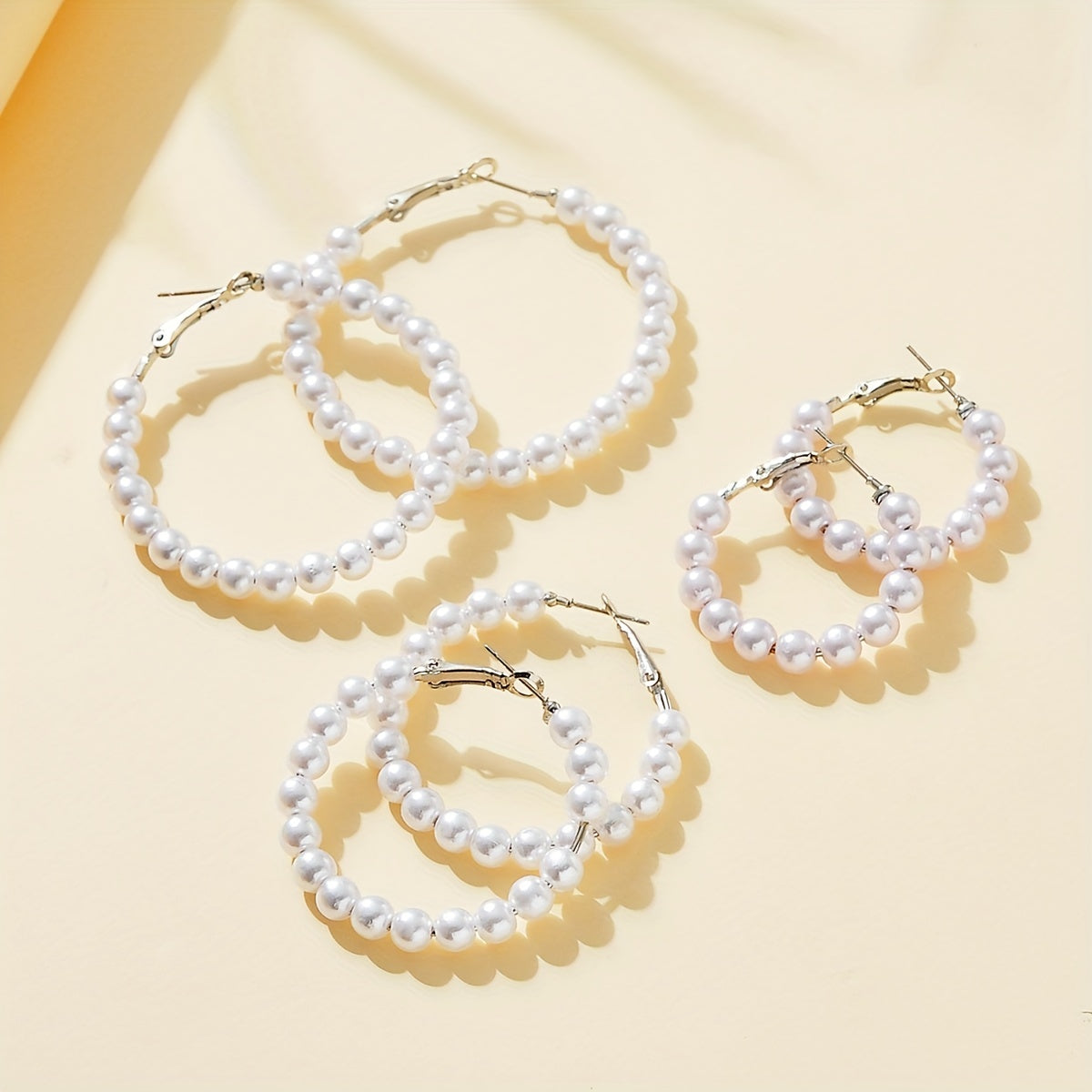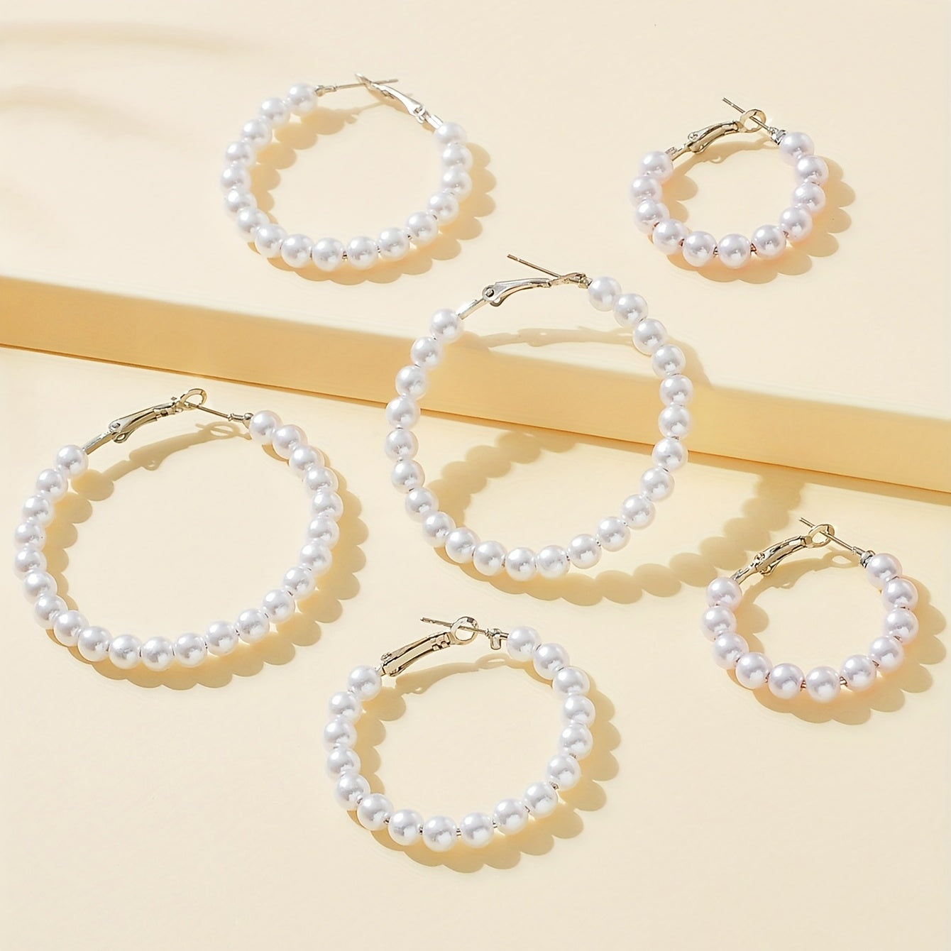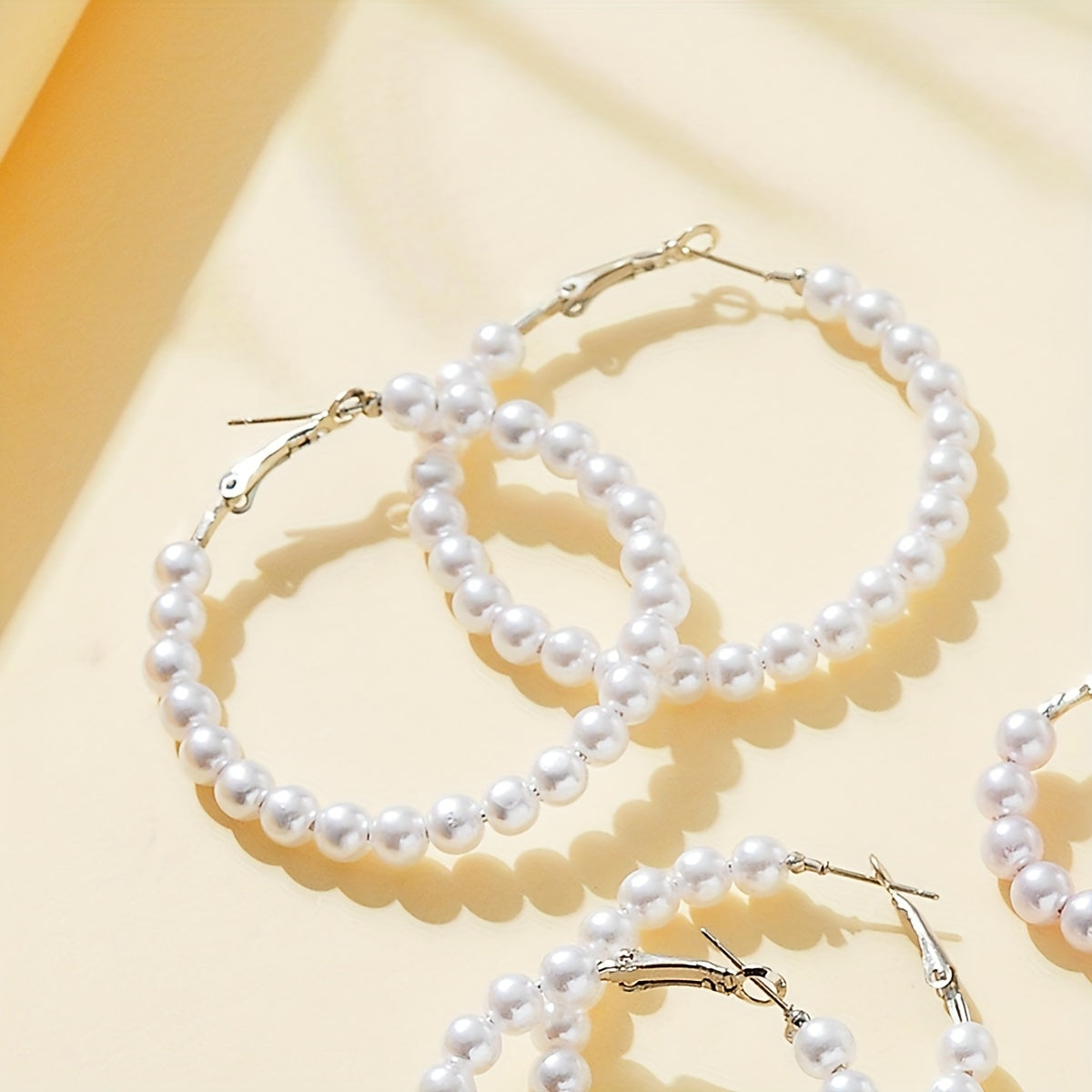 These delicate hoop earrings are adorned with faux pearls, making them perfect for weddings, banquets, or everyday wear.