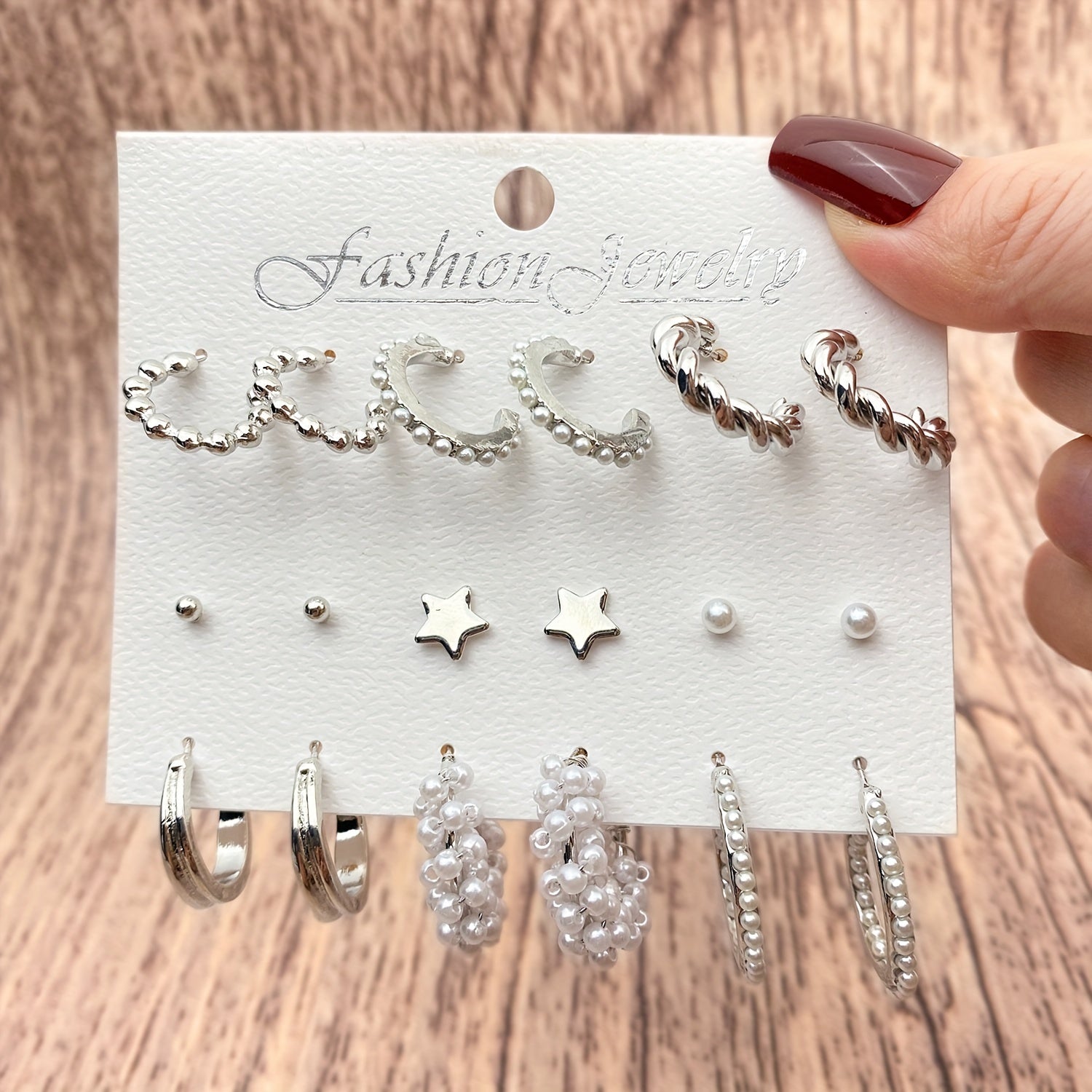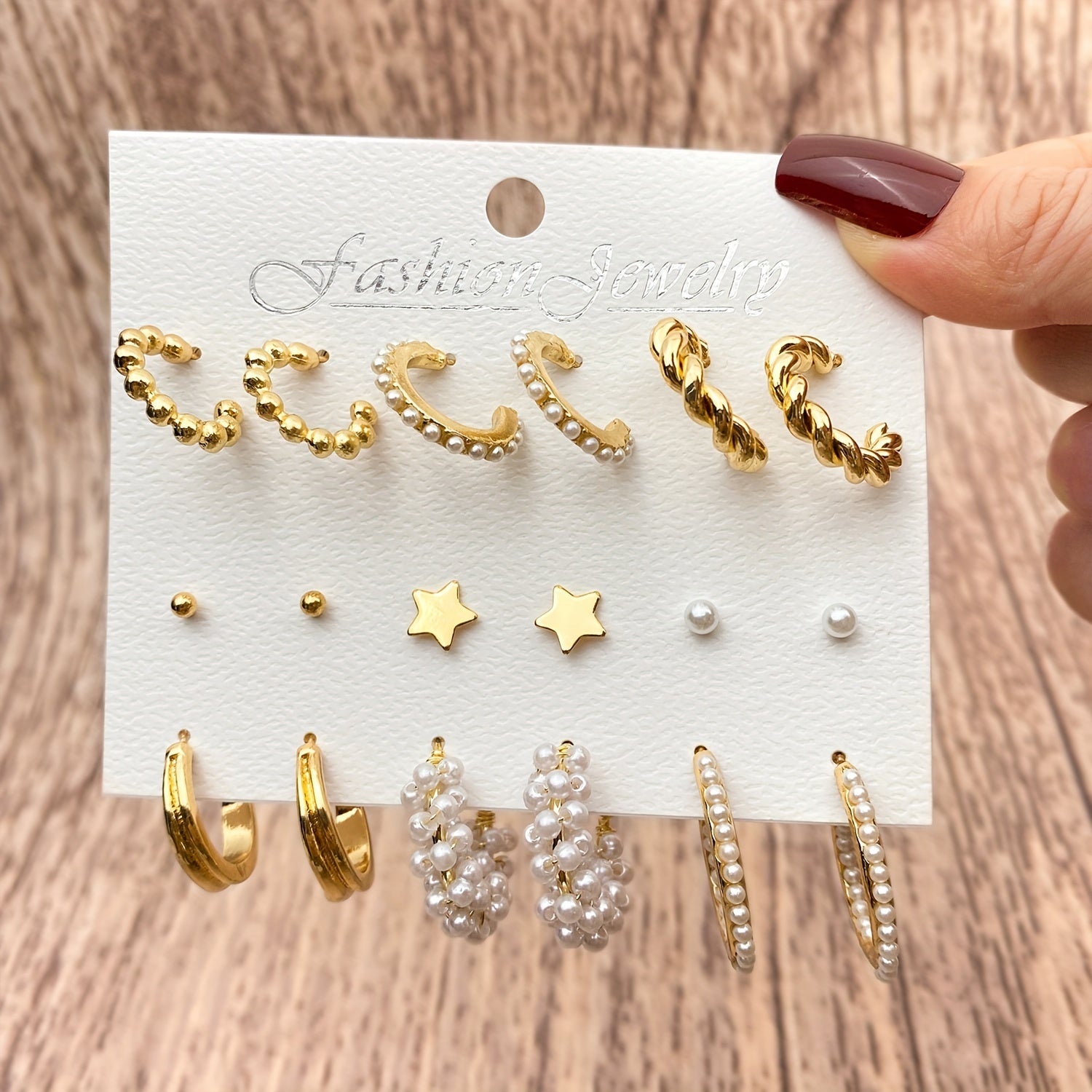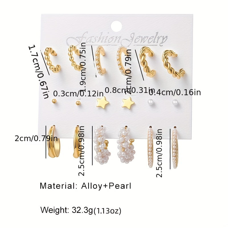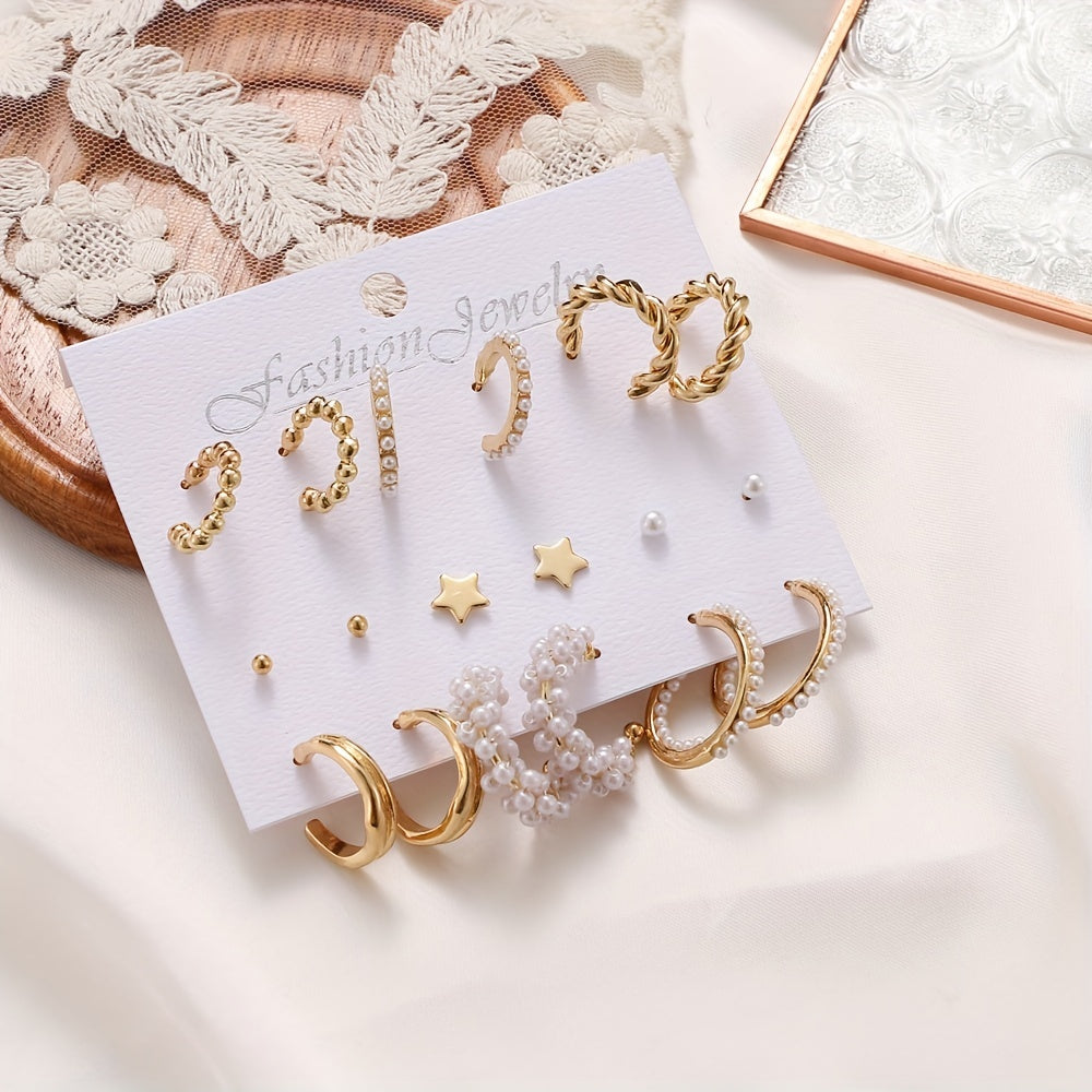 These C shape earrings feature faux pearl star and twist design, perfect for daily casual wear. Ideal gift for women who love retro-inspired accessories.