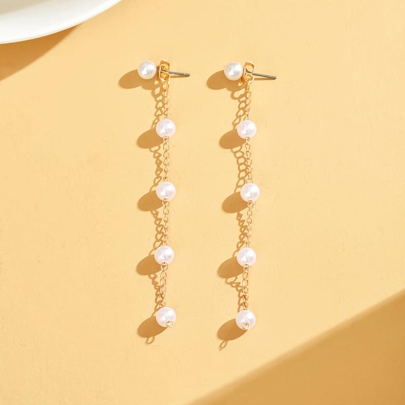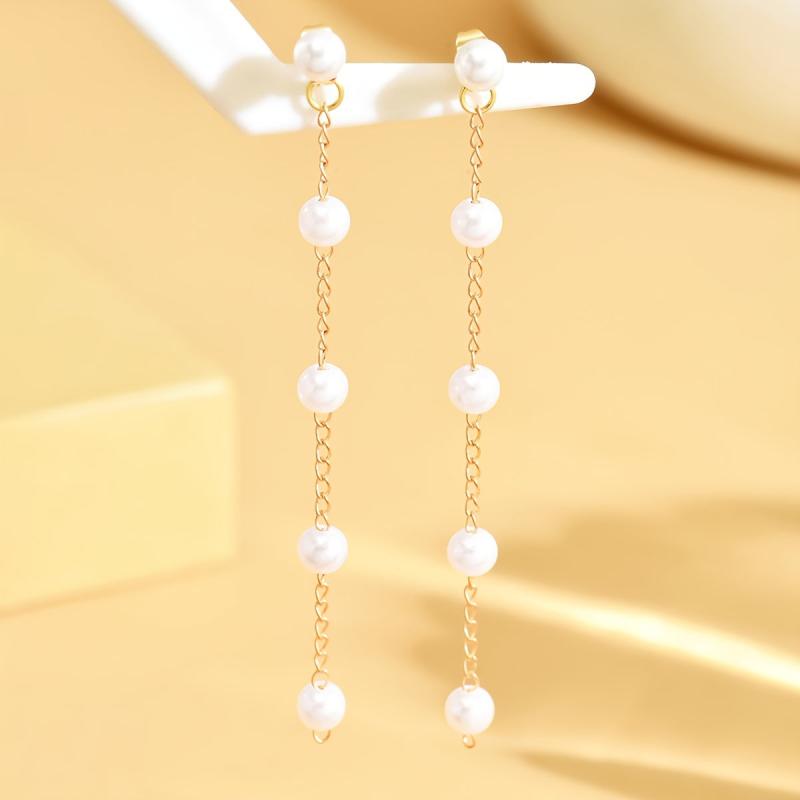 Elegant faux pearl tassel earrings with a long dangle design perfect for weddings and special occasions.