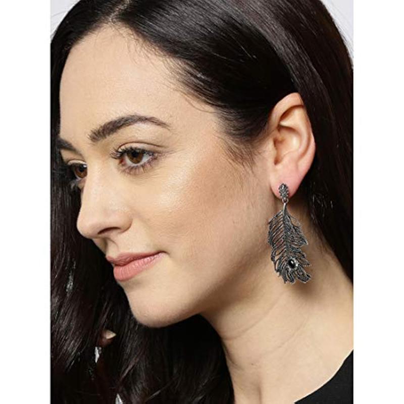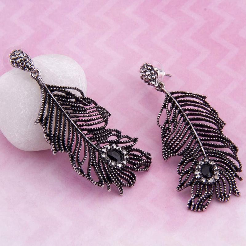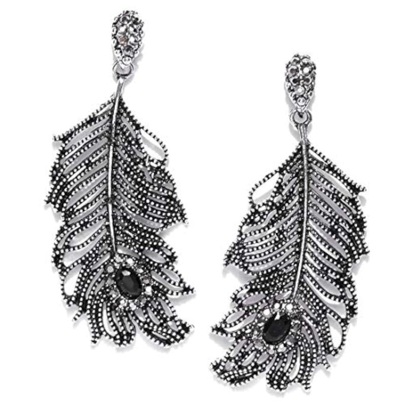 Add a touch of bohemian charm to your look with these feather-inspired drop earrings. The plushy design and oxidized finish make them a unique and stylish accessory.