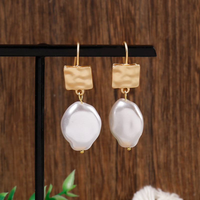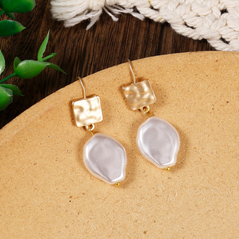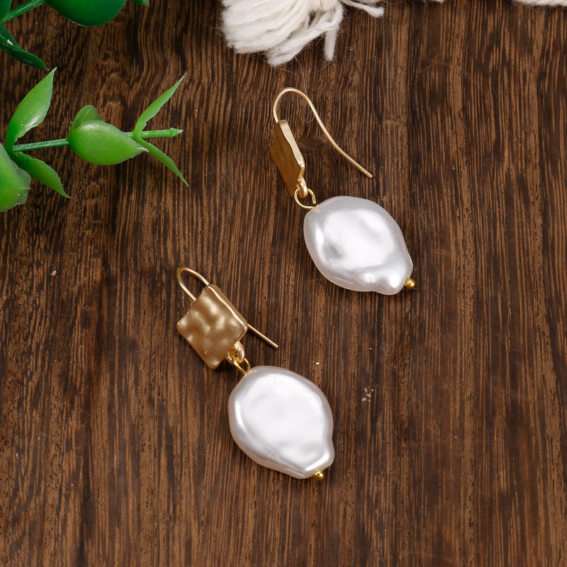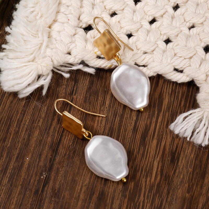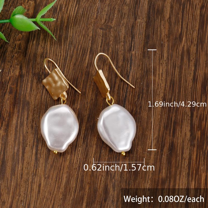 Add a touch of elegance with these stunning irregular flat faux pearl drop earrings. They are made with 14K plated zinc alloy hooks, perfect for any occasion.