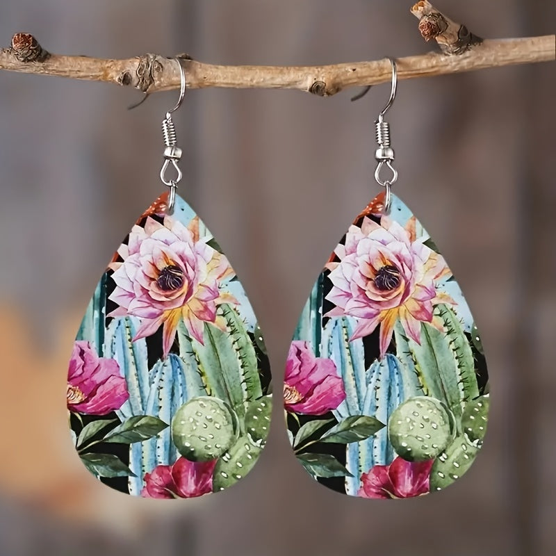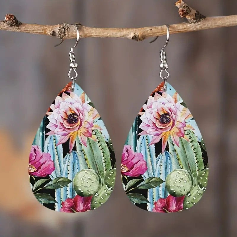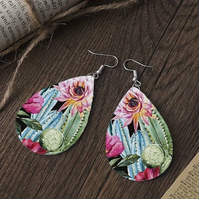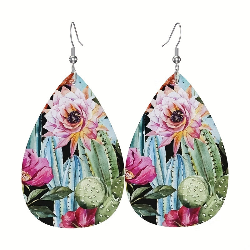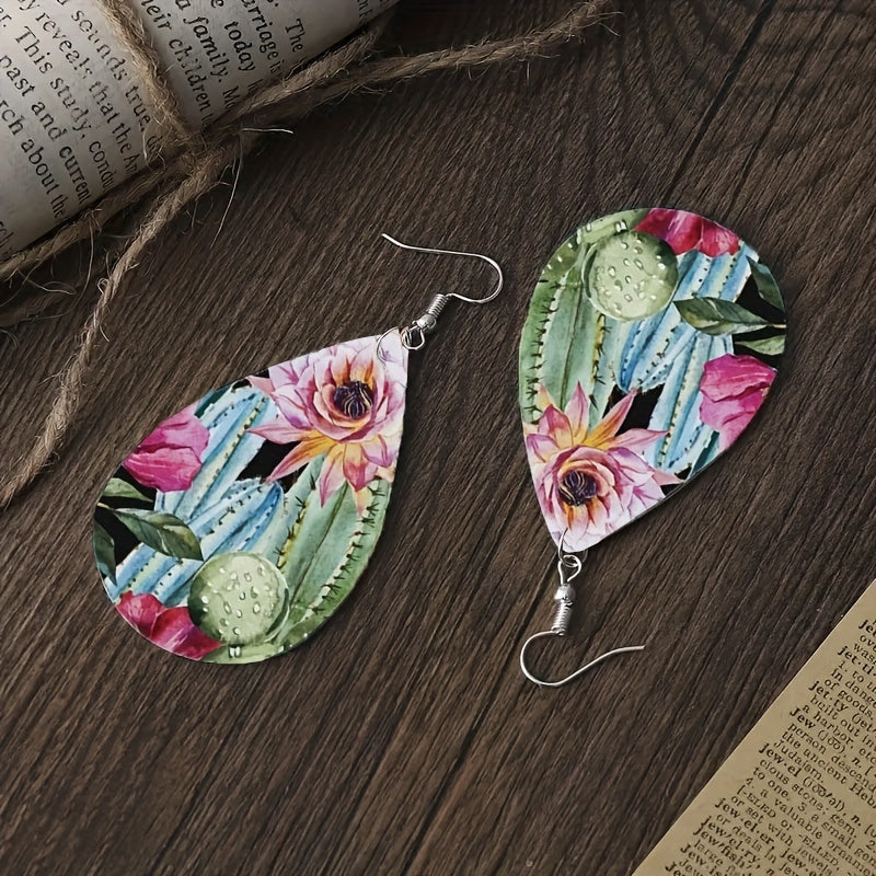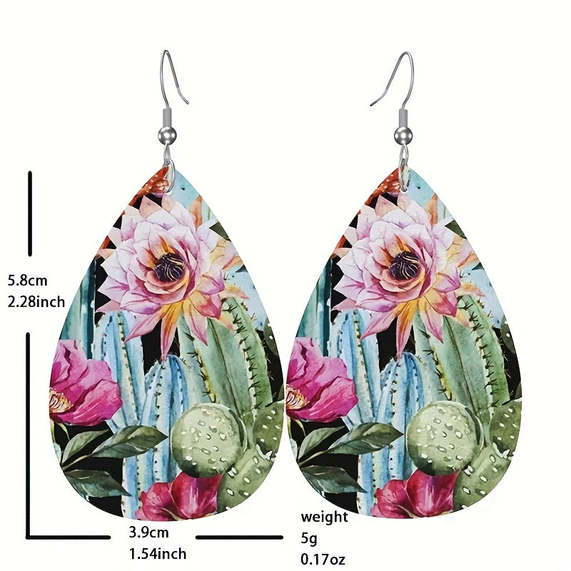 Add a touch of fun with these creative flower cactus earrings made of PU leather. Perfect for holiday parties or as a gift for men.