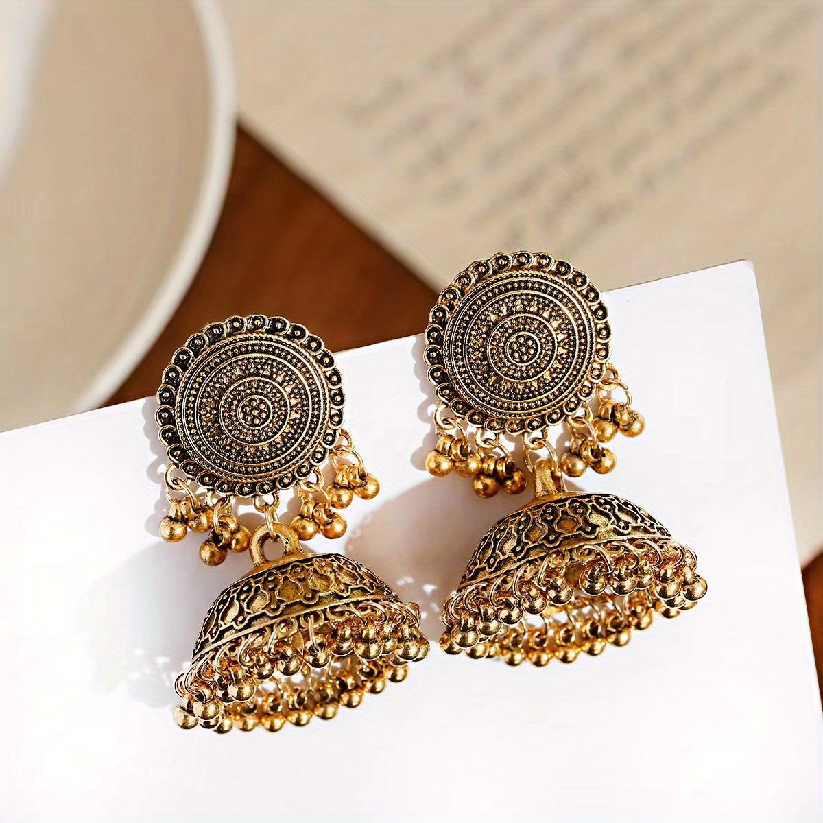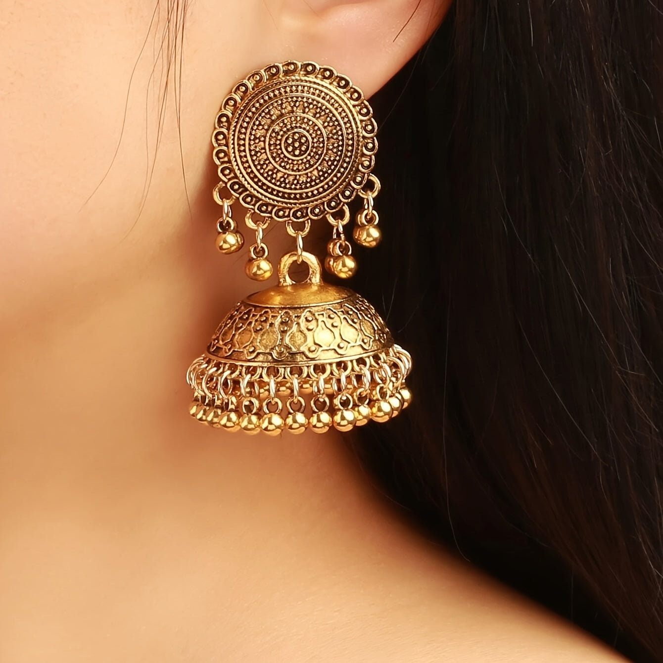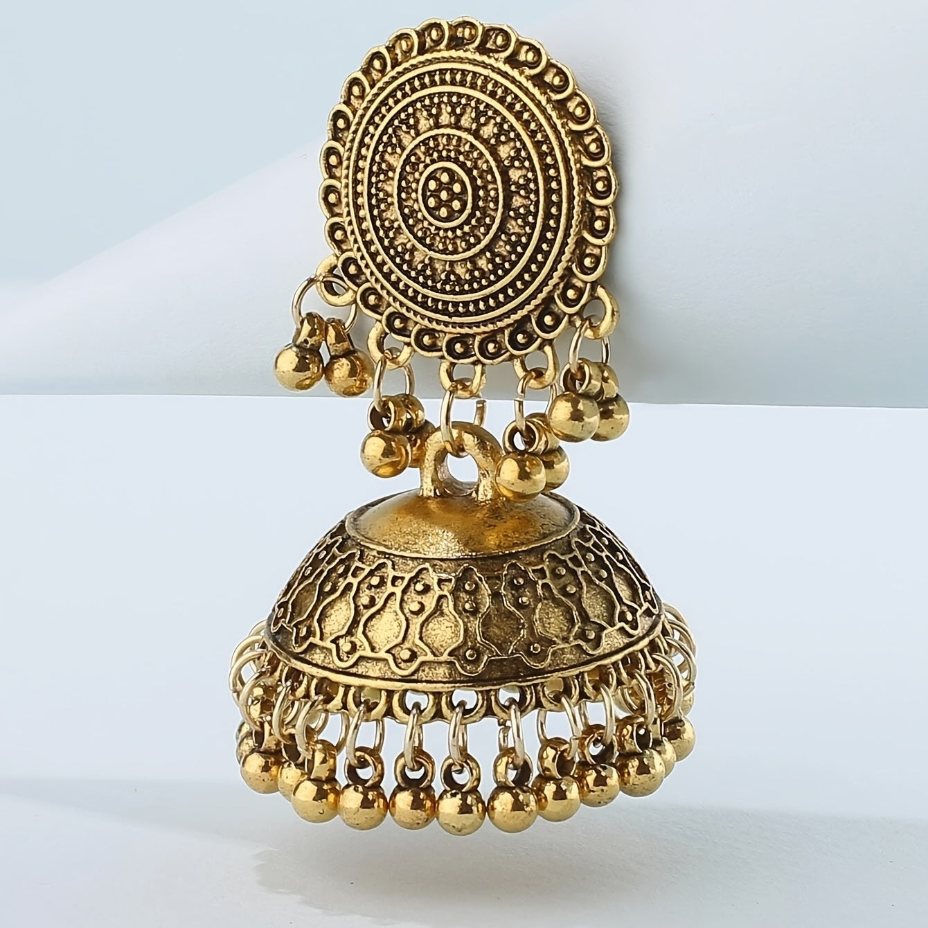 Add a touch of retro Bohemian style to your outfit with these dangle earrings featuring a flower pattern and big bell pendant. Made of high-quality alloy material.