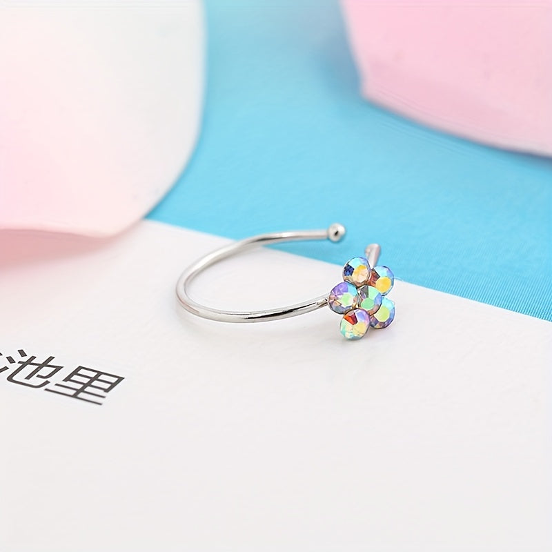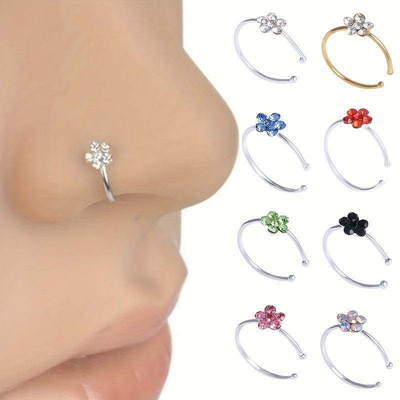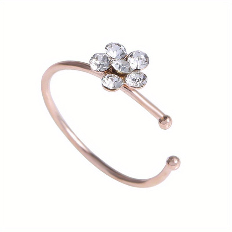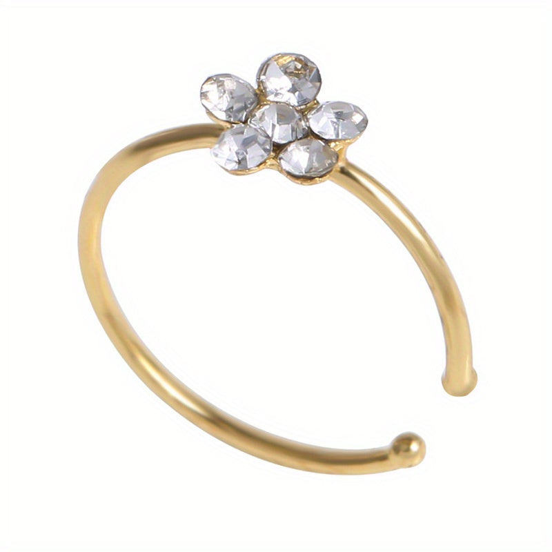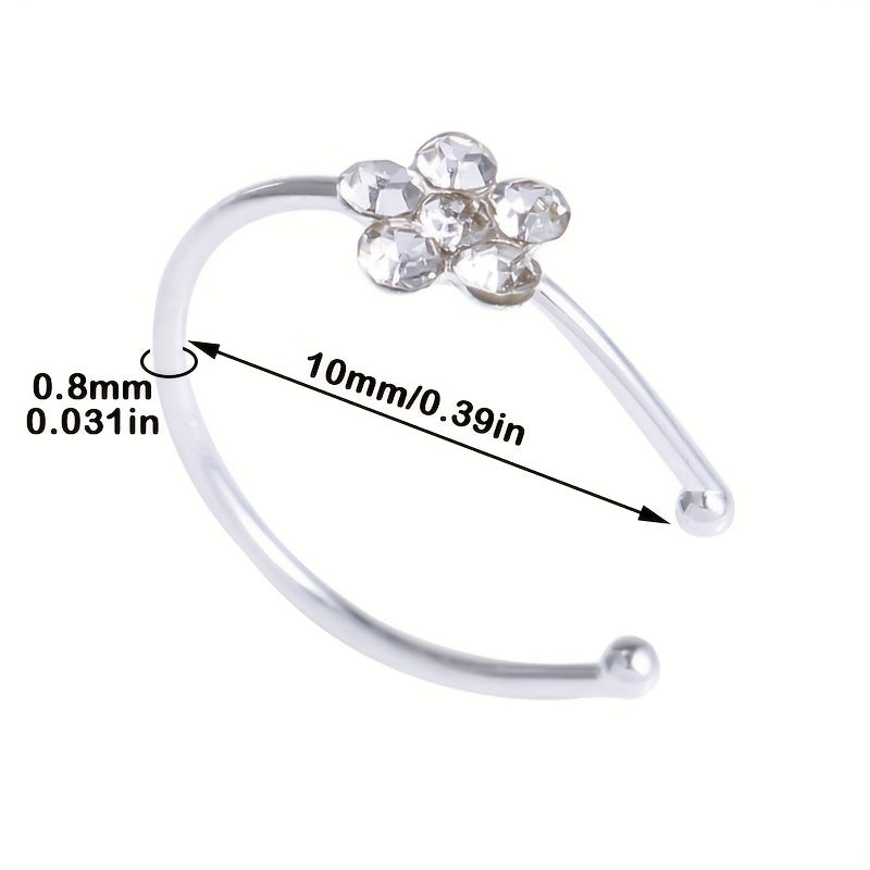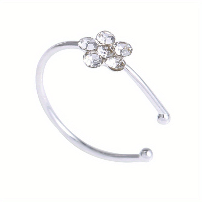 This elegant nose ring features a flower design with rhinestones for a stylish look. Can be used as a nose ring, hoop earring, nose stud, or ear cuff. Perfect for adding a touch of sparkle to your body jewelry collection.