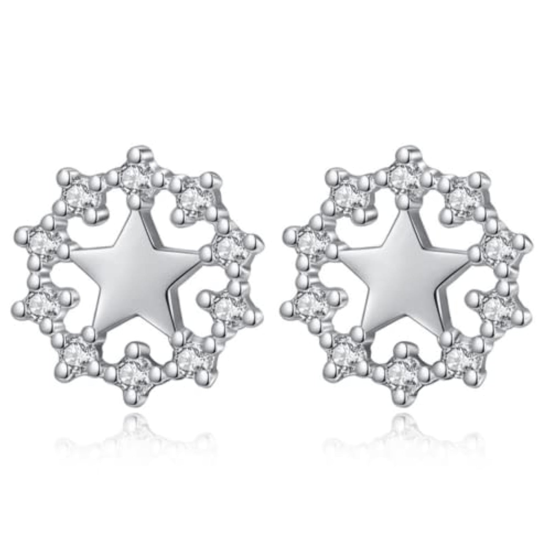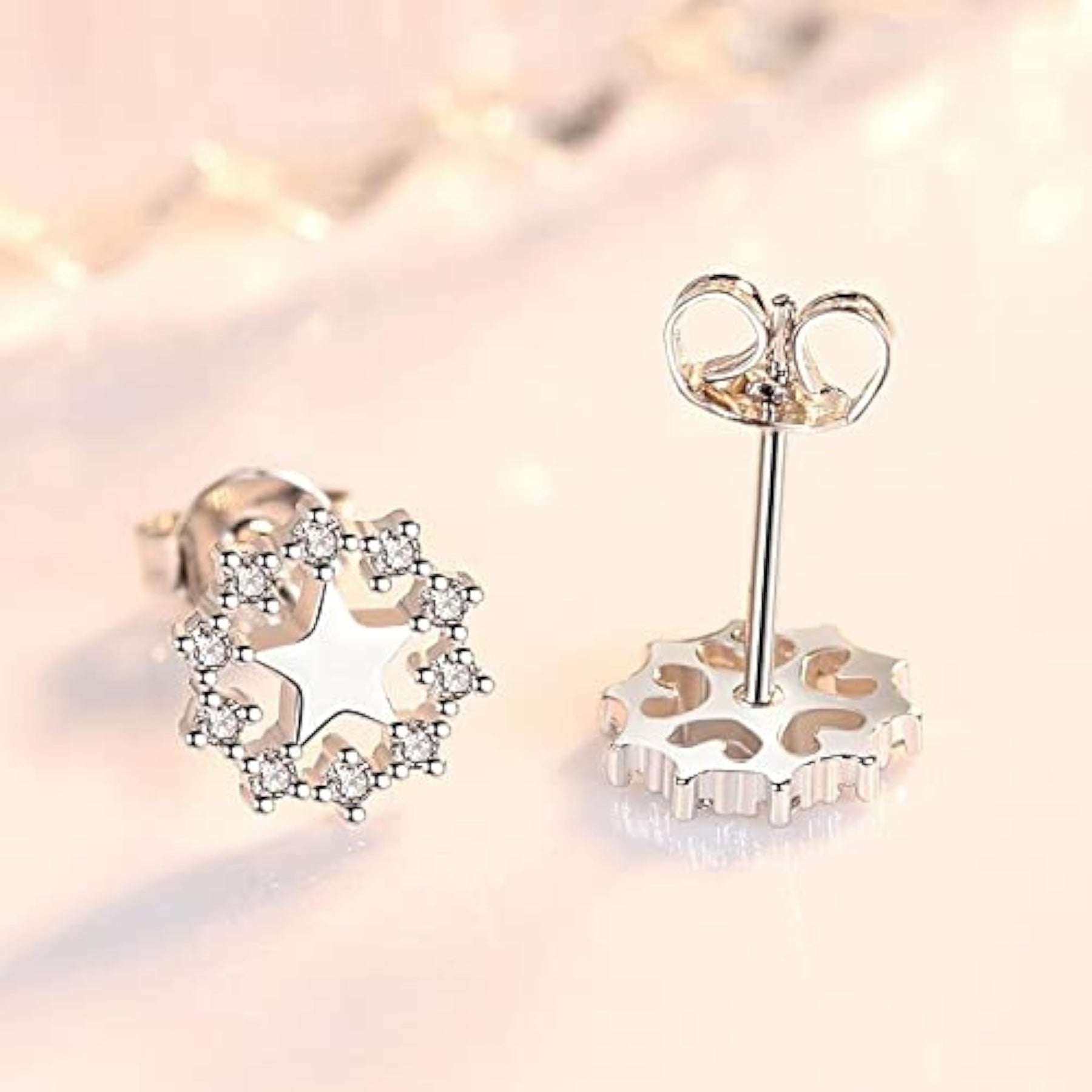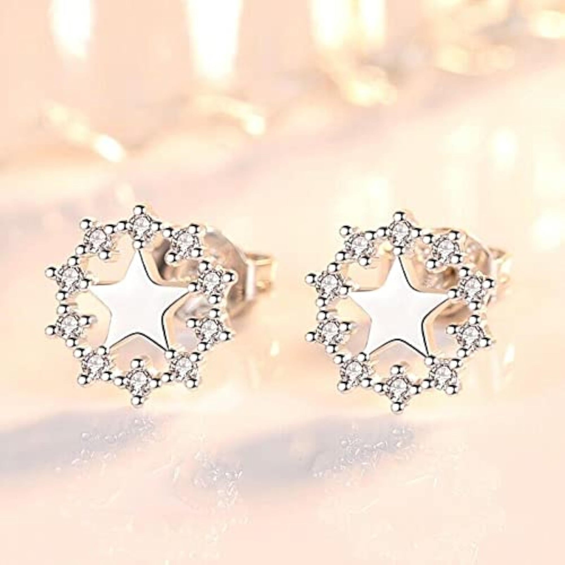Add a touch of elegance to your look with these stunning plated flower star stud earrings featuring tiny cubic zirconia stones. Perfect for any occasion.