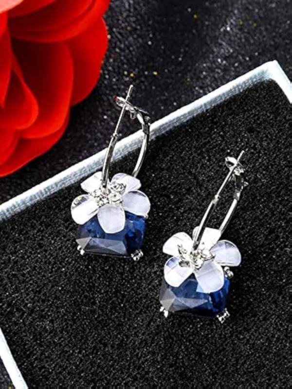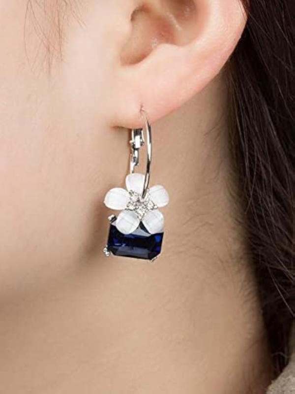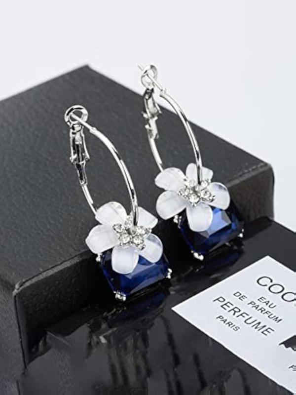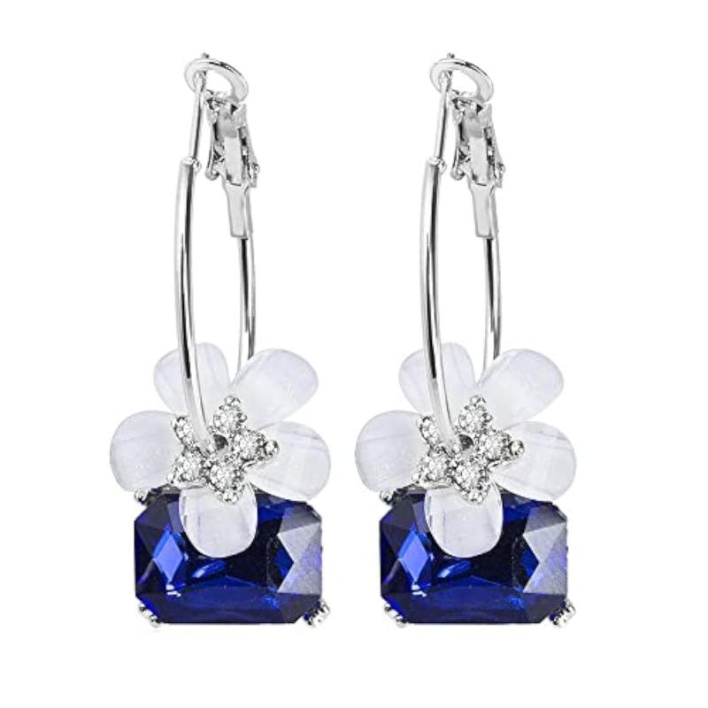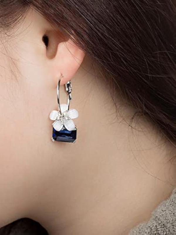 Add a touch of elegance with these stunning silver hoop earrings featuring flower and stone drop design.