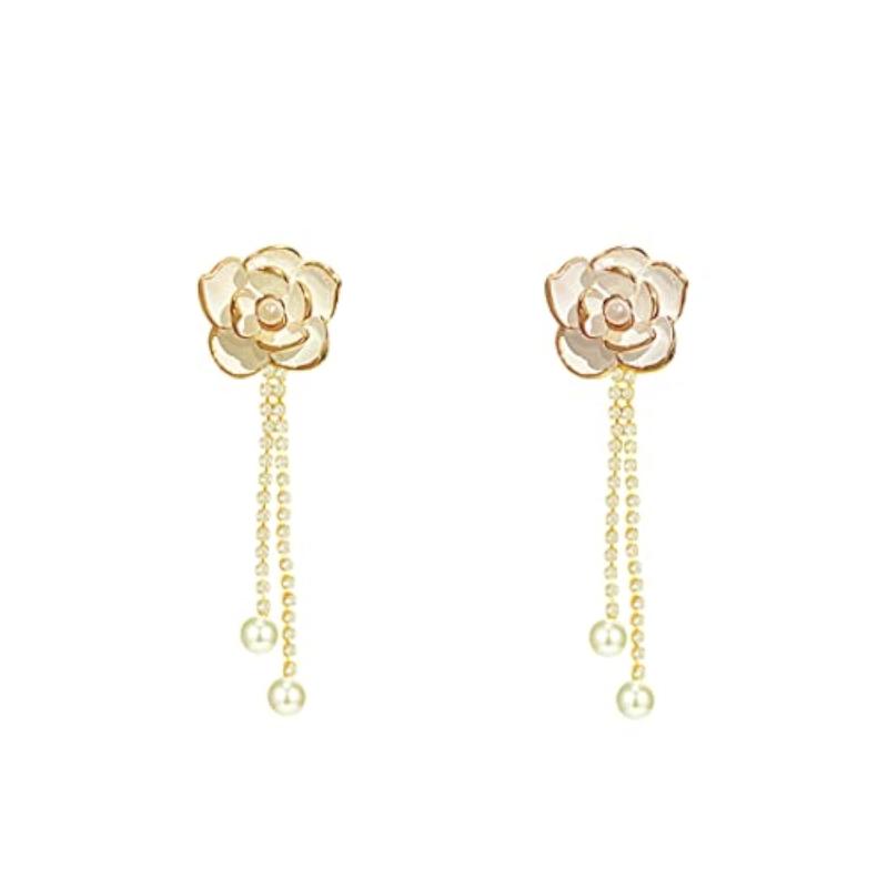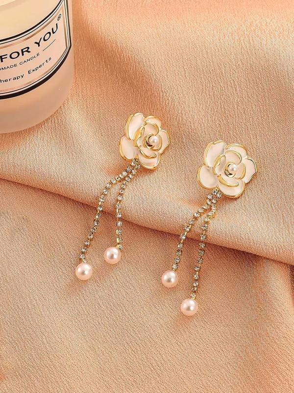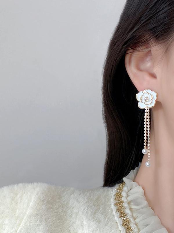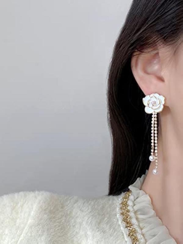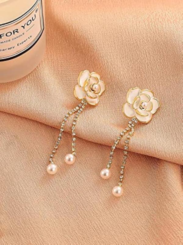Elegant earrings featuring flower stud design with linear chain and hanging pearl drop. Perfect for adding a touch of sophistication to any outfit.