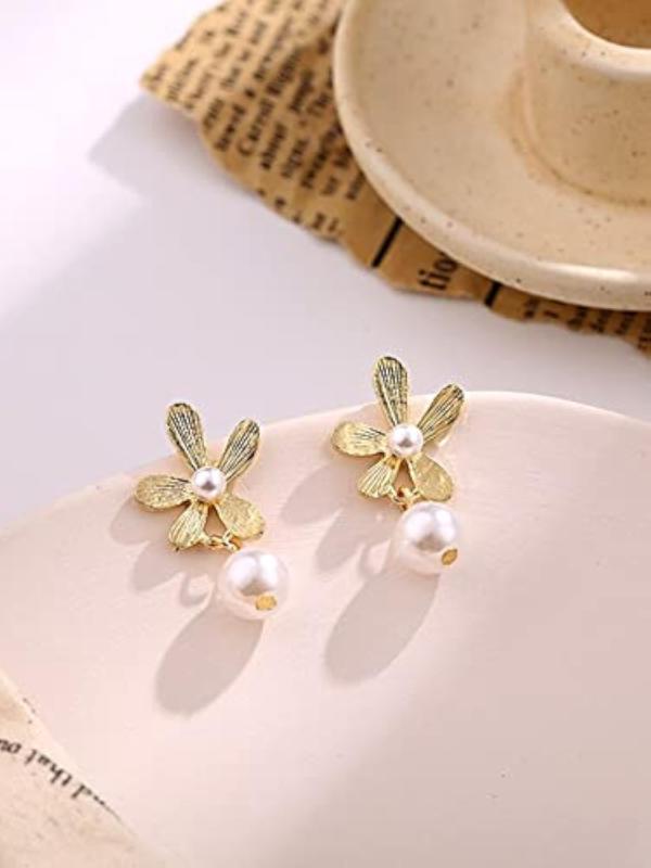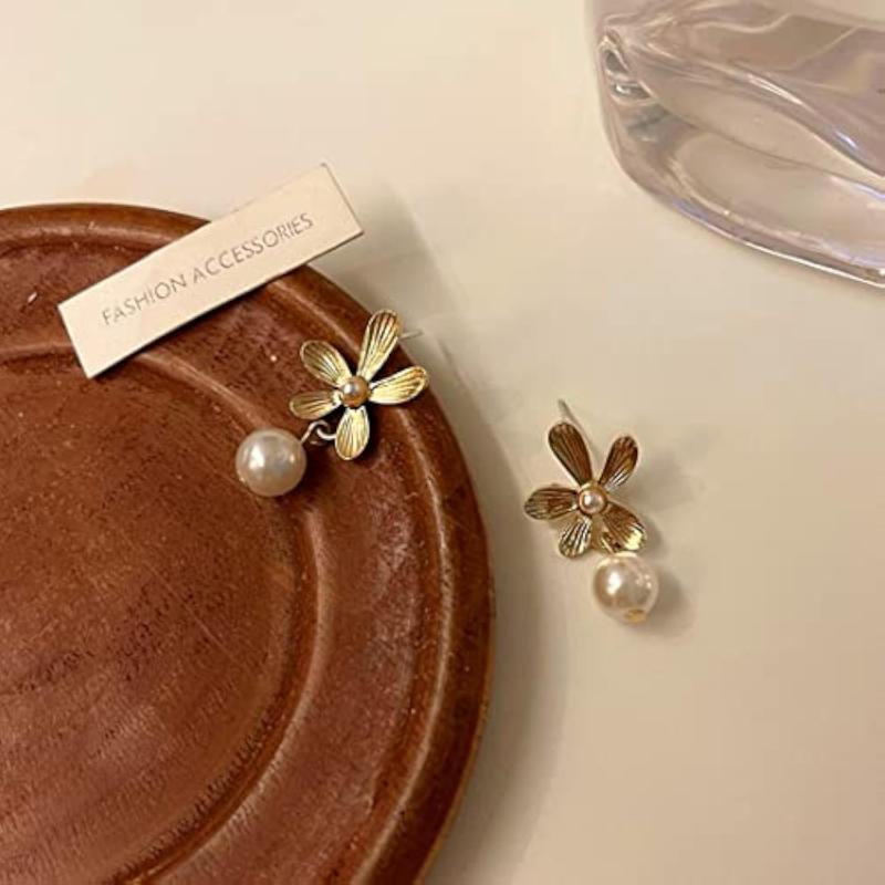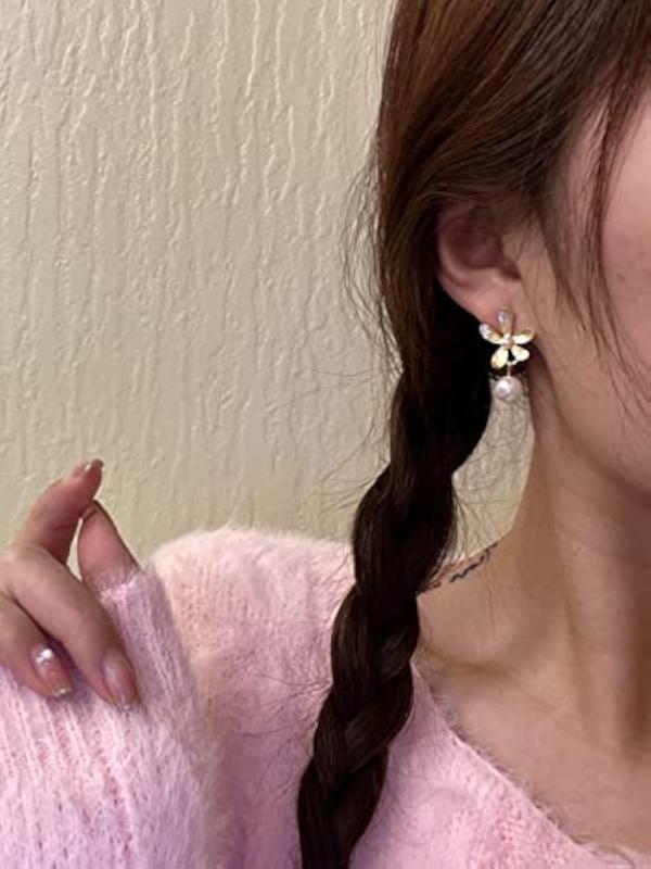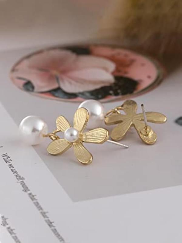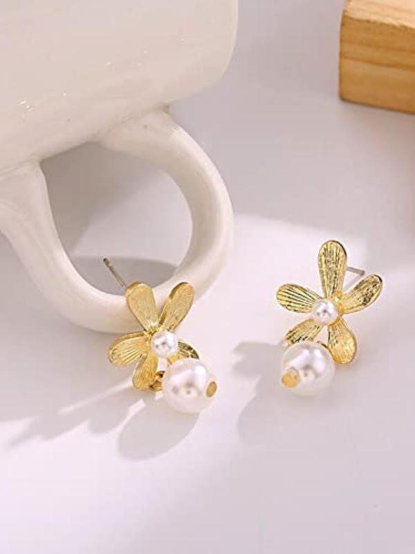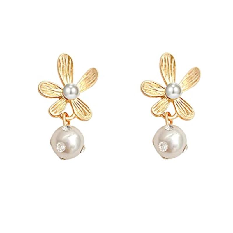 Elegant earrings featuring a flower stud design with hanging pearl drops, perfect for adding a touch of sophistication to any outfit.