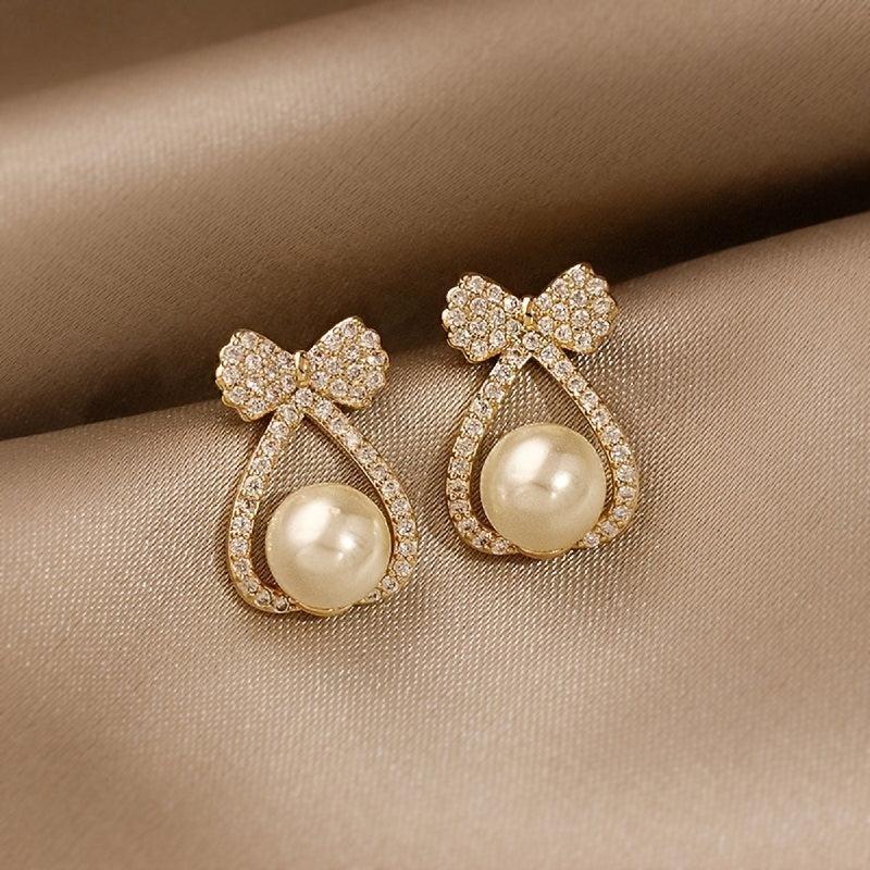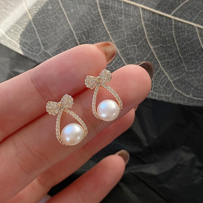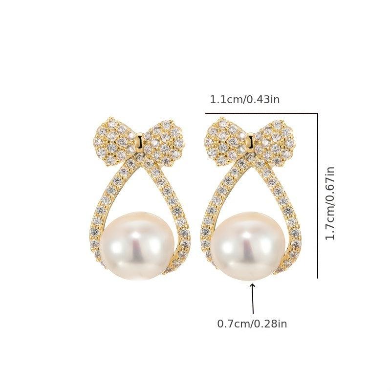 These small and elegant earrings feature a delicate bow design adorned with artificial pearls and crystals. They are perfect for adding a touch of sophistication to any outfit, making them ideal for birthdays or special occasions.