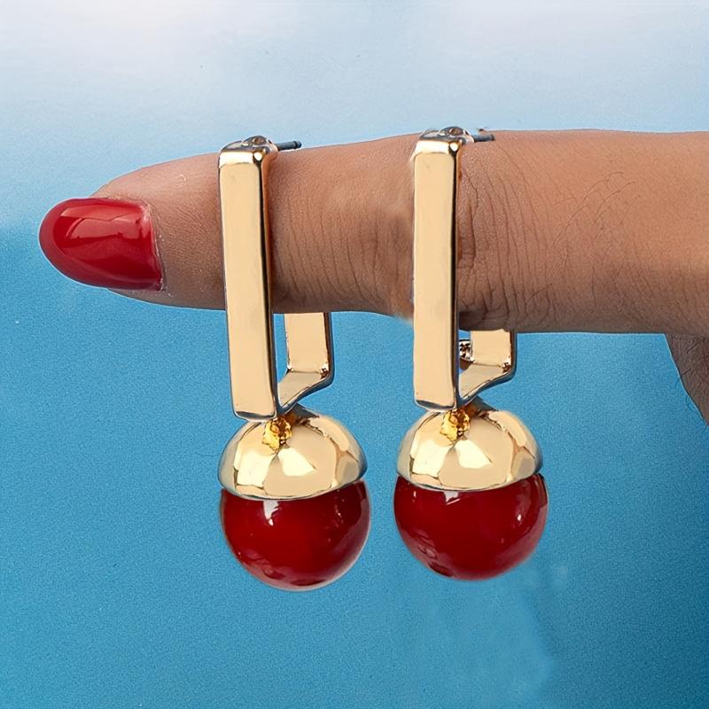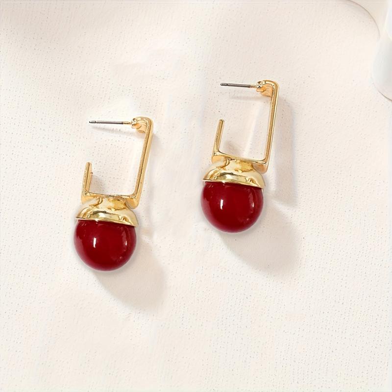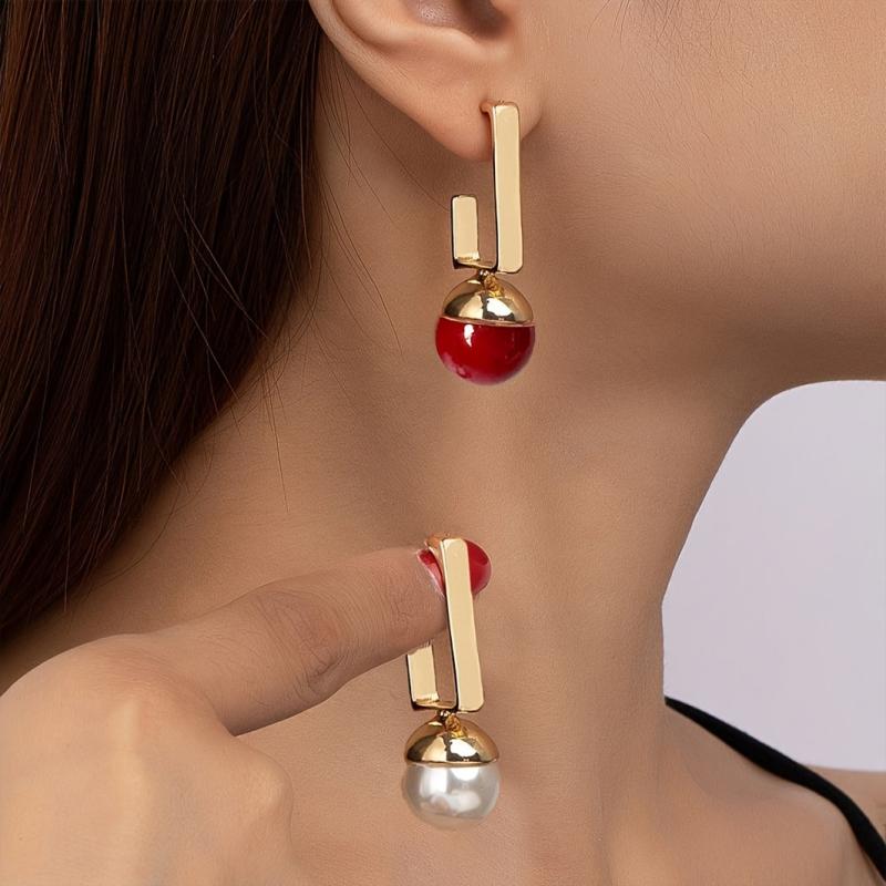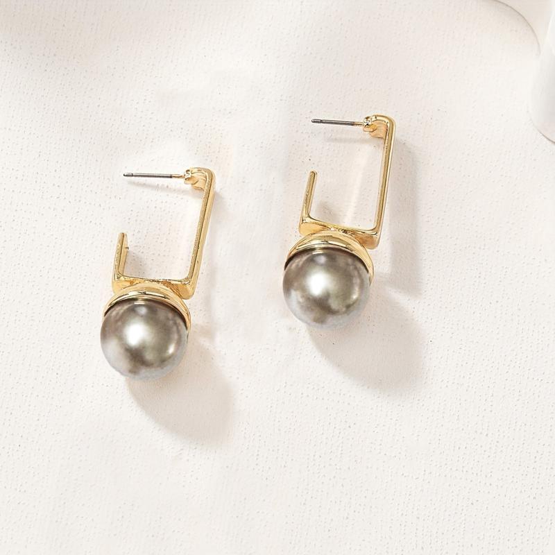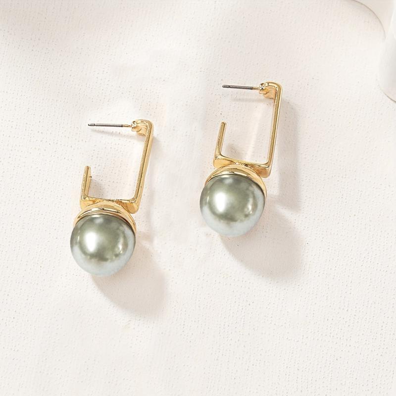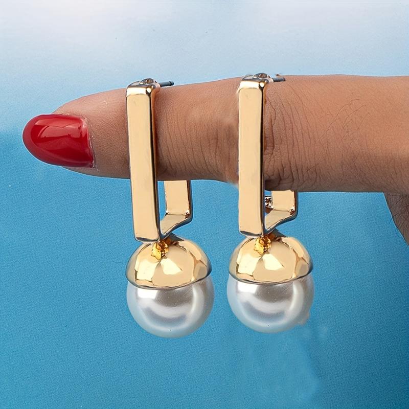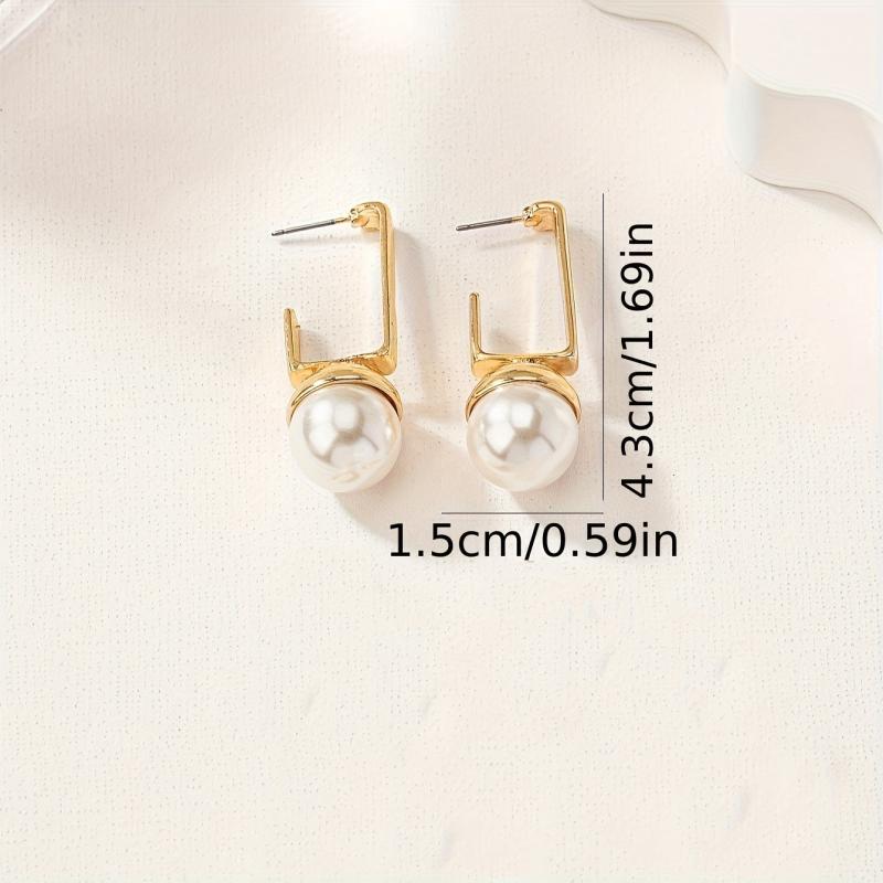 Elegant square stud earrings featuring faux pearl accents in a golden tone alloy, perfect for weddings and holidays.