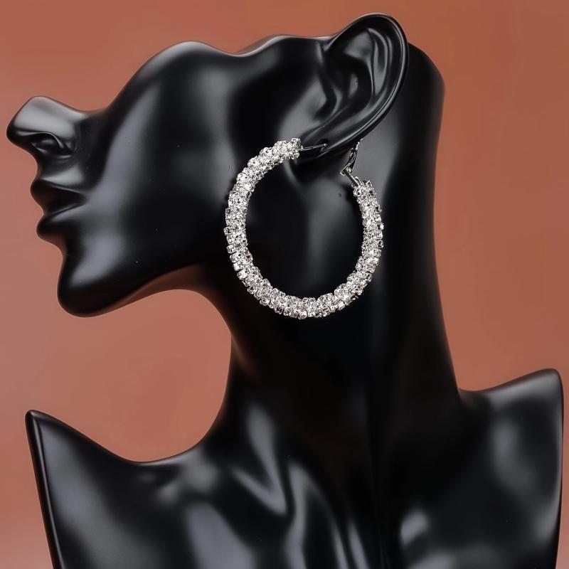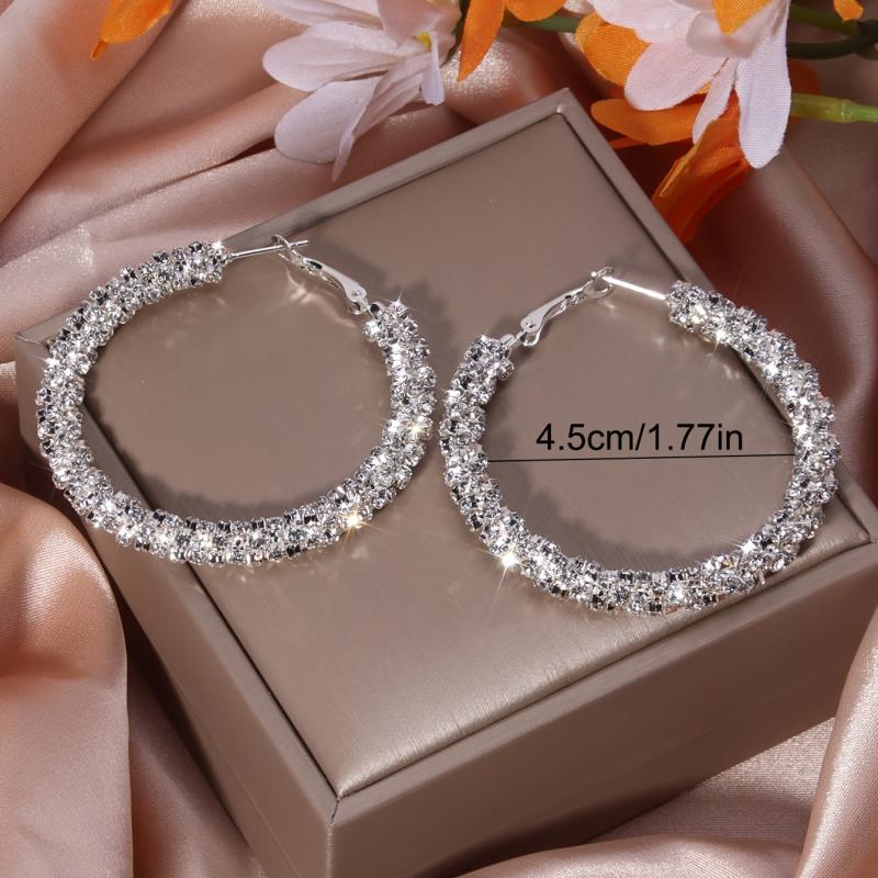 These large hoop earrings are adorned with sparkling rhinestones and plated in silver, making them the perfect accessory for parties or holidays. They make a great gift for women and girls.