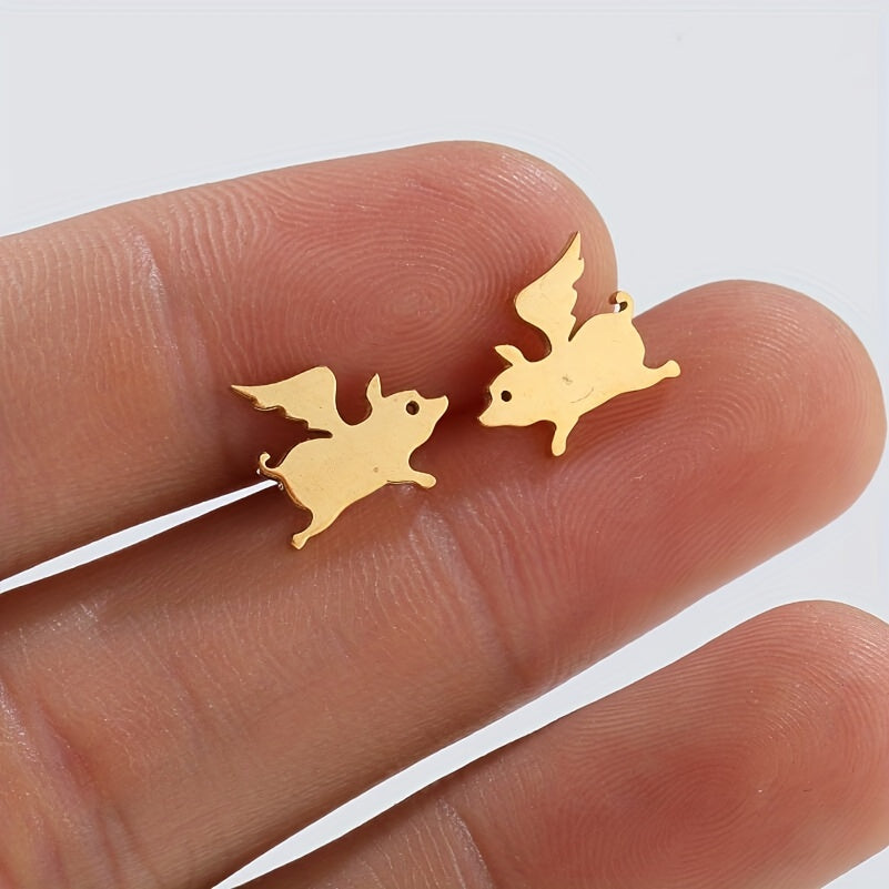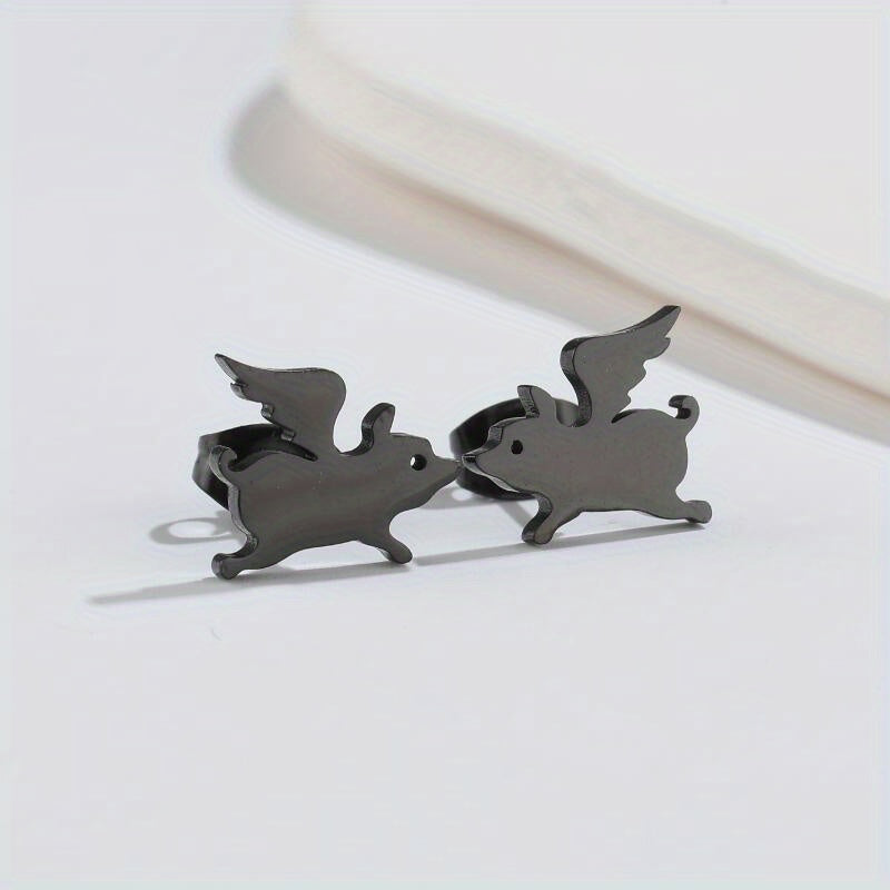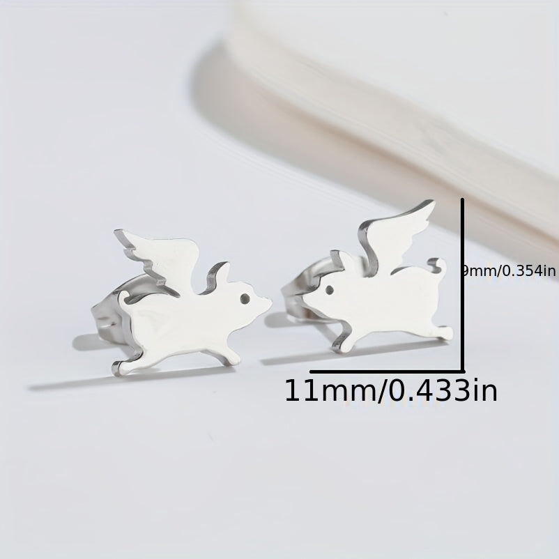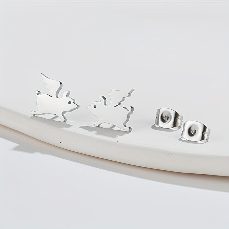 Adorable pair of stainless steel earrings featuring cartoon little pig angels. Perfect gift for men with a fun sense of style.