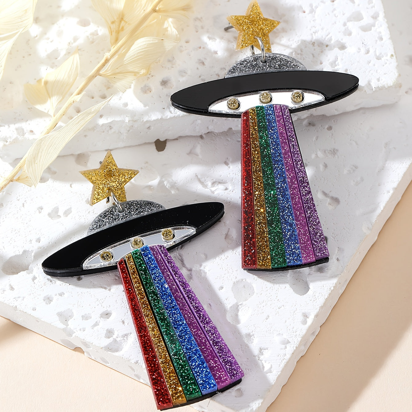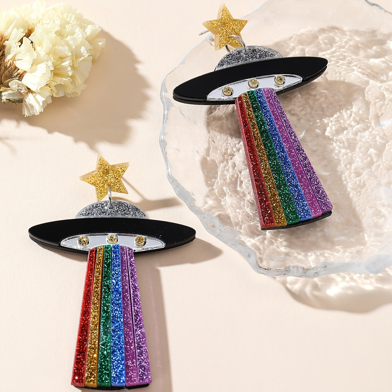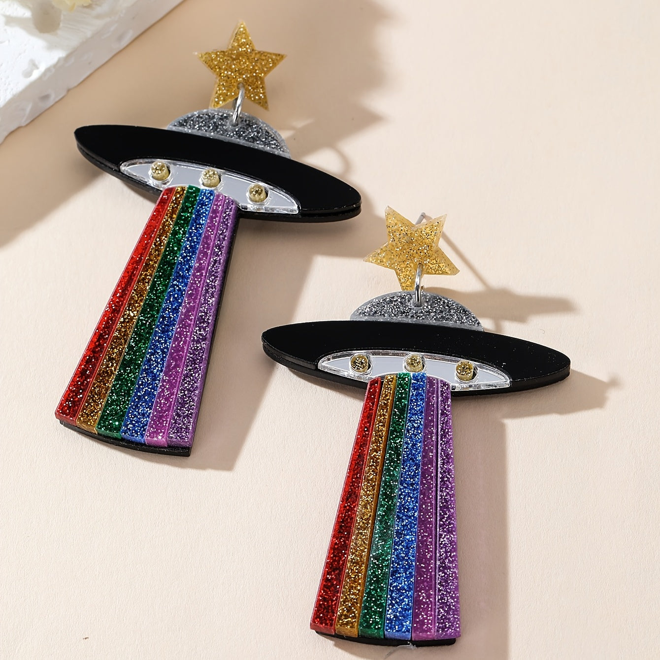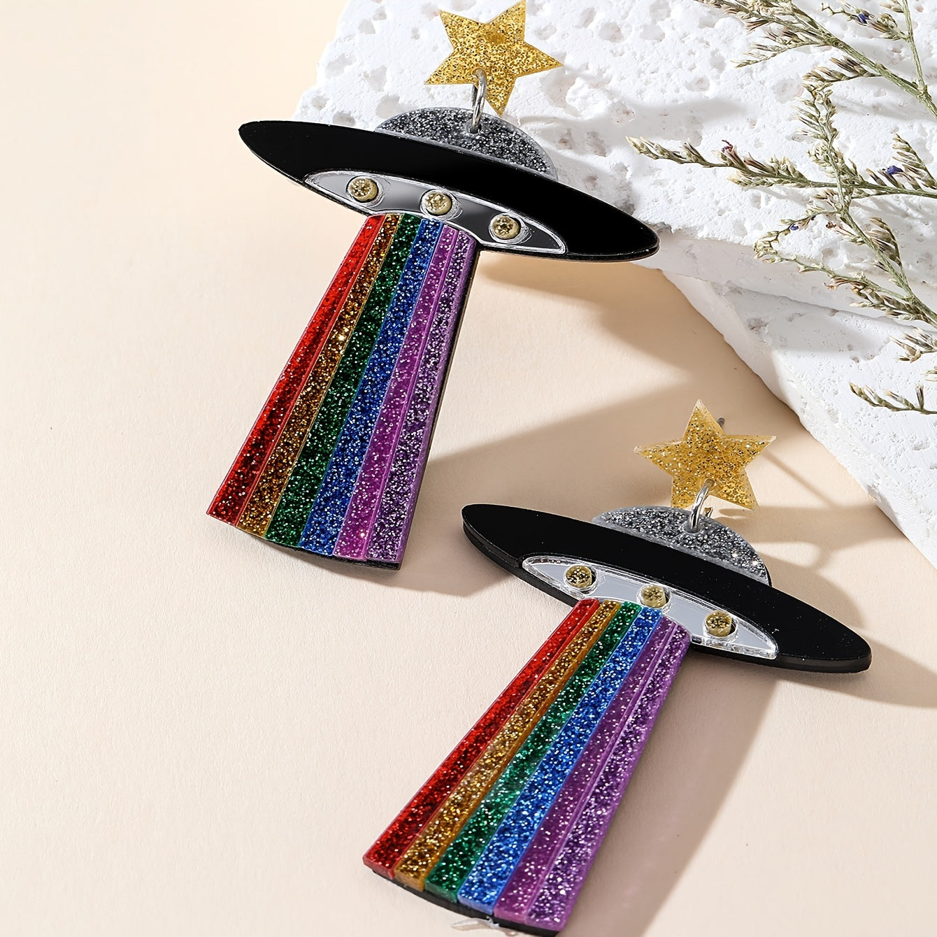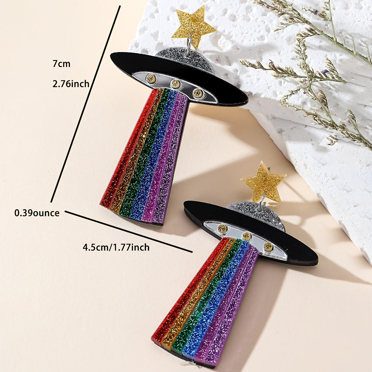 Add a touch of whimsical charm with these colorful alien spaceship earrings featuring stars and rainbows.