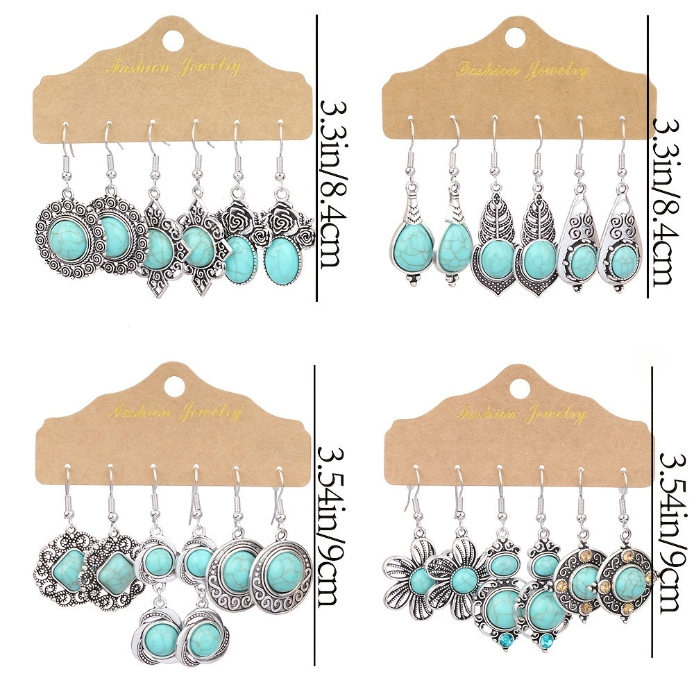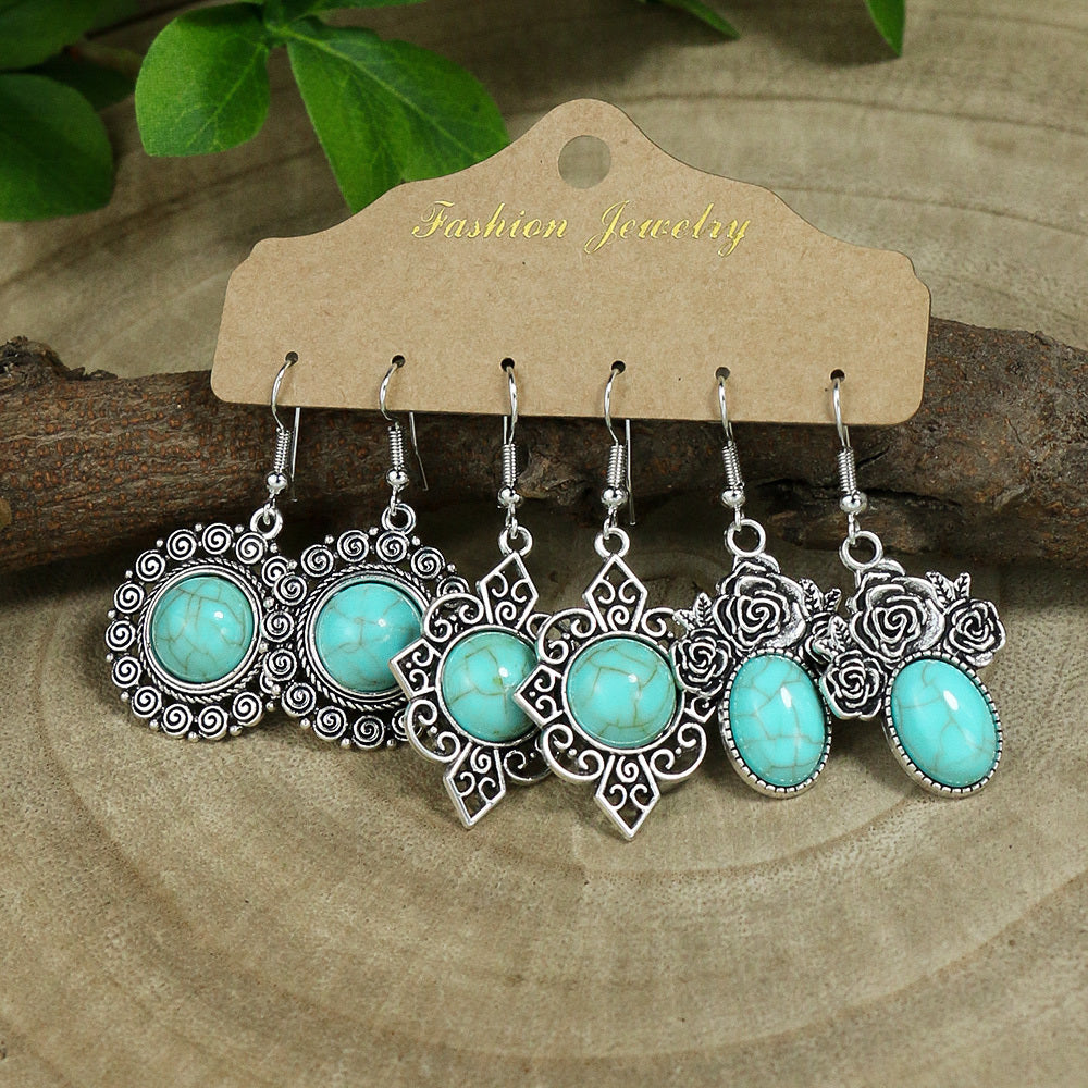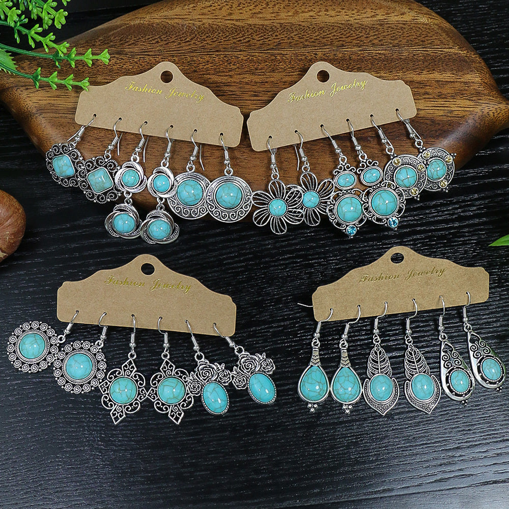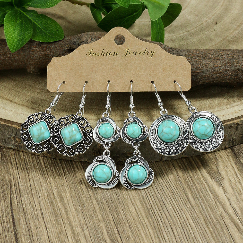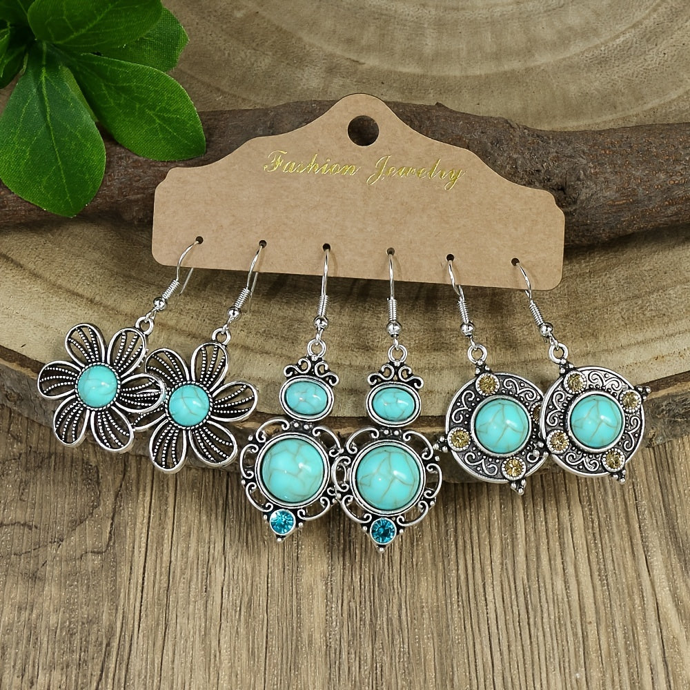 Vintage inspired women's earrings set featuring a geometric ancient silver pendant with a green pine stone rhinestone decoration.