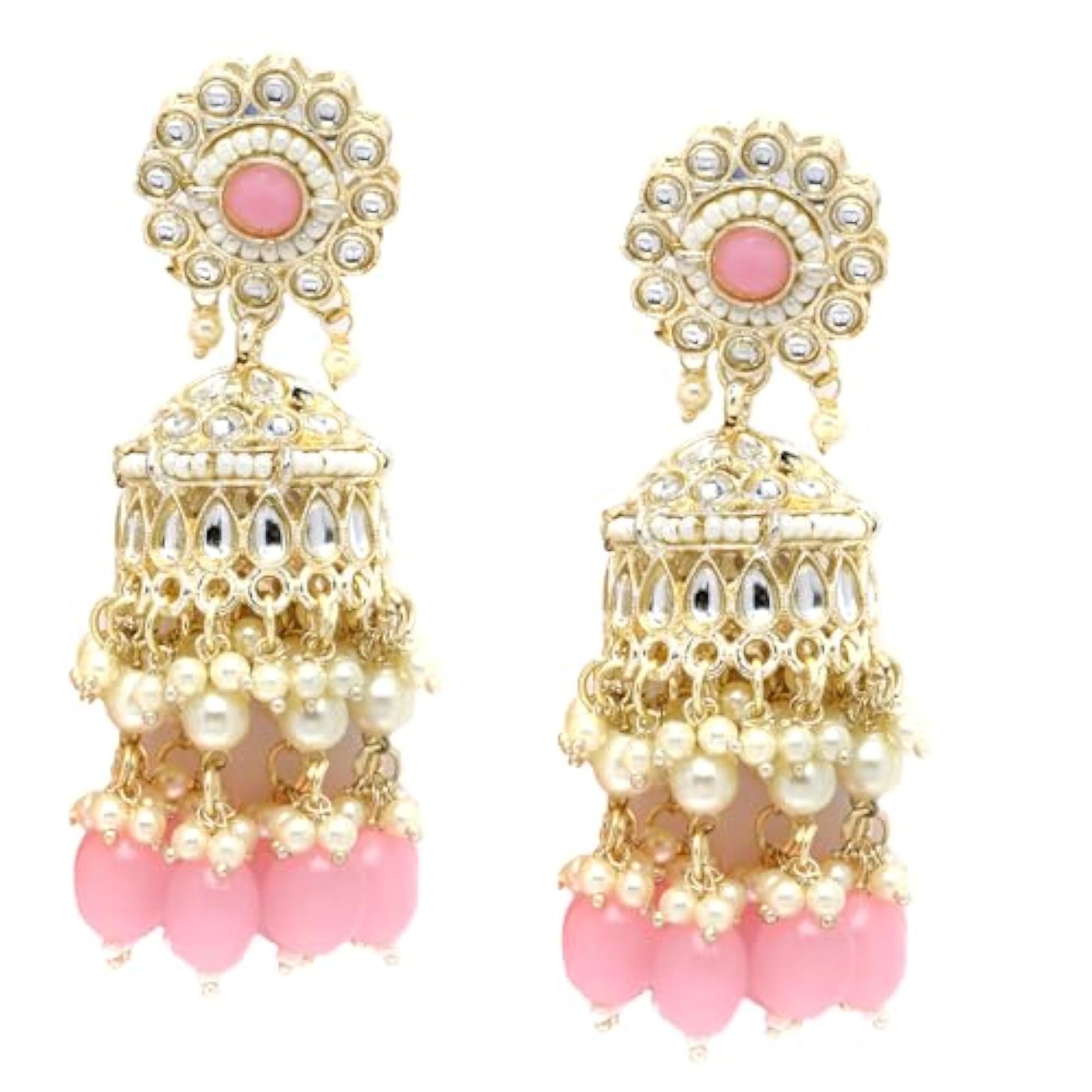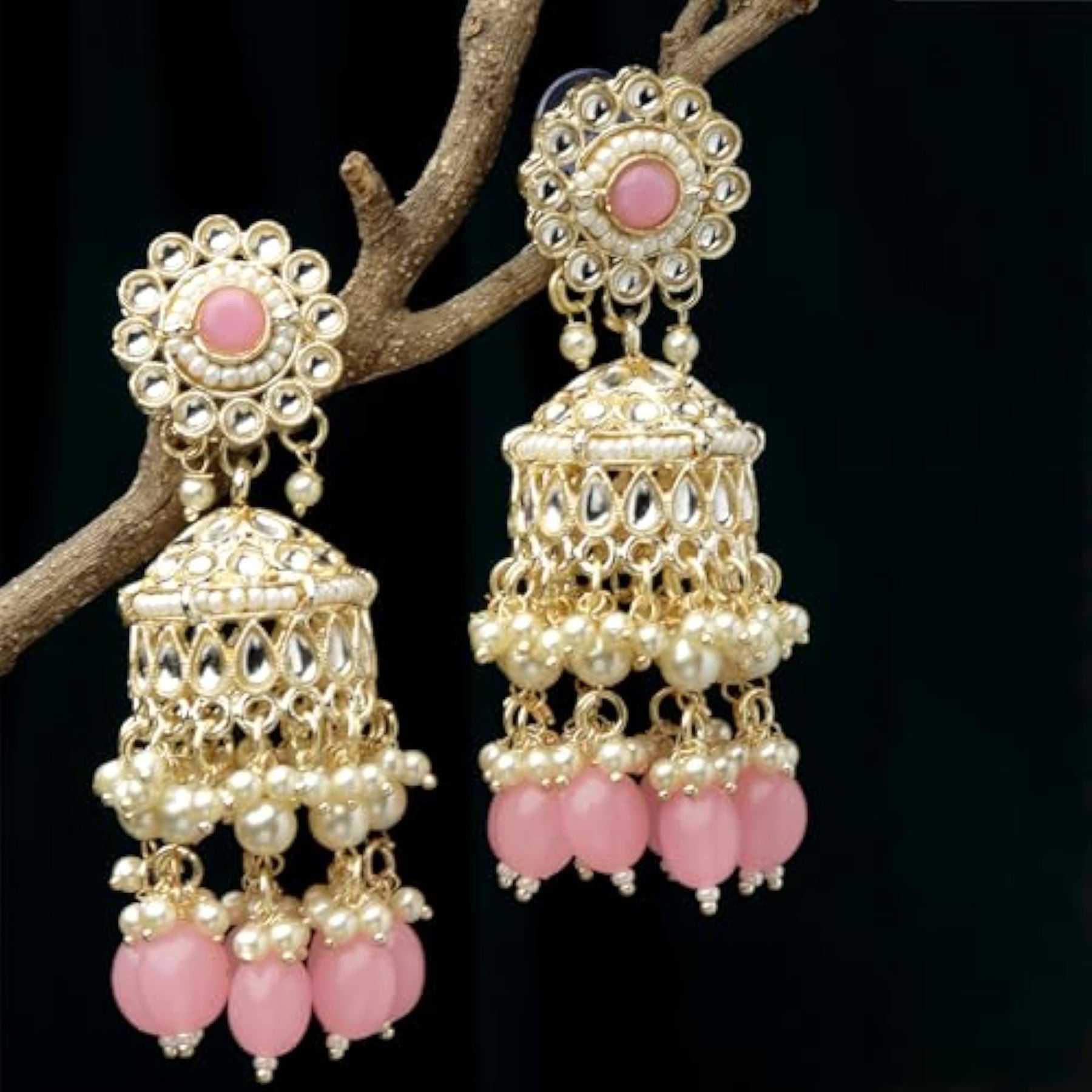 Exquisite gold-plated jhumka earrings with kundan and pearls in a flower shape design. Perfect for adding a touch of elegance to any outfit.