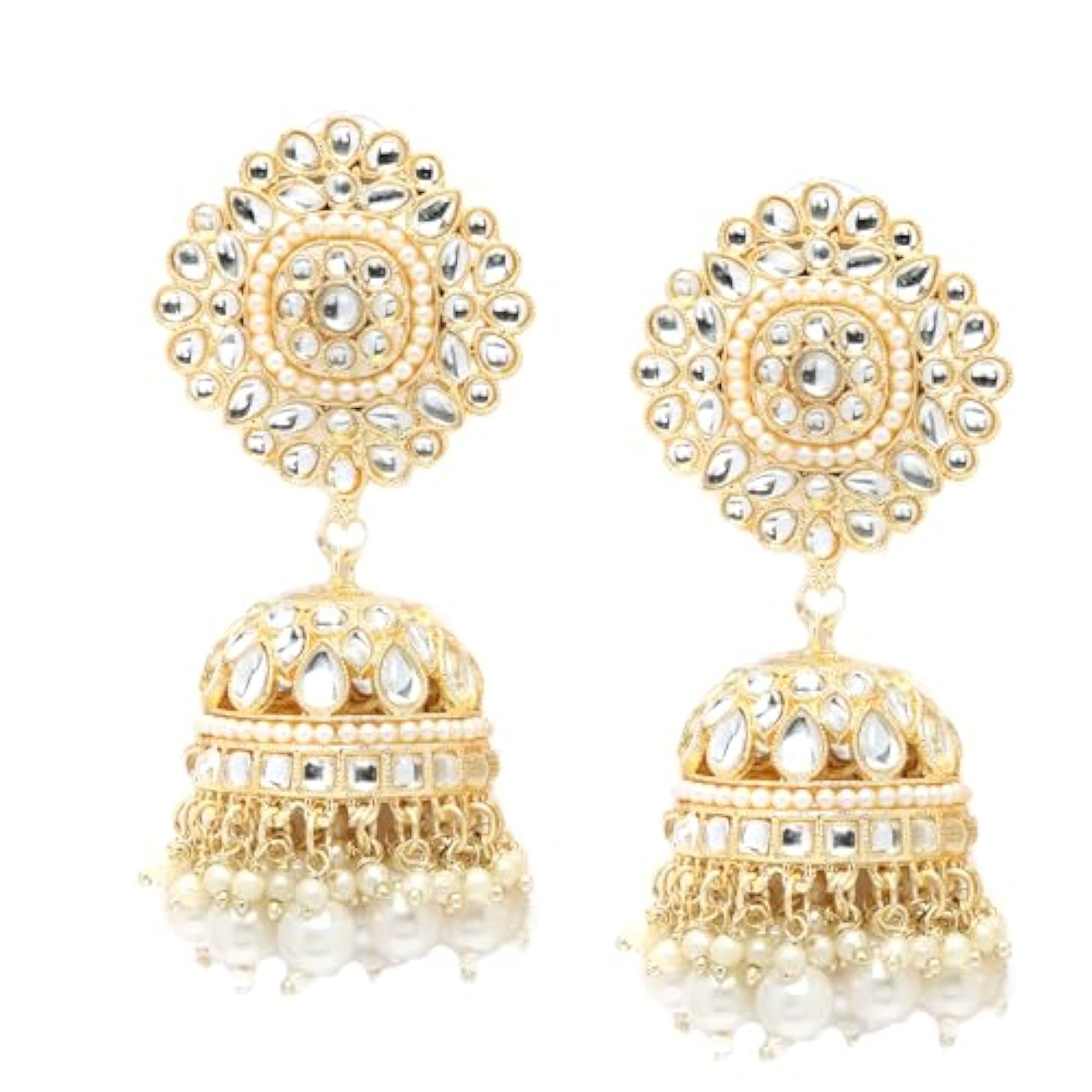These exquisite jhumka earrings are beautifully crafted with kundan stones and pearls, designed in a flower shape. Perfect for special occasions or traditional events.
