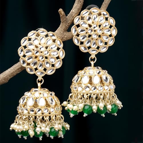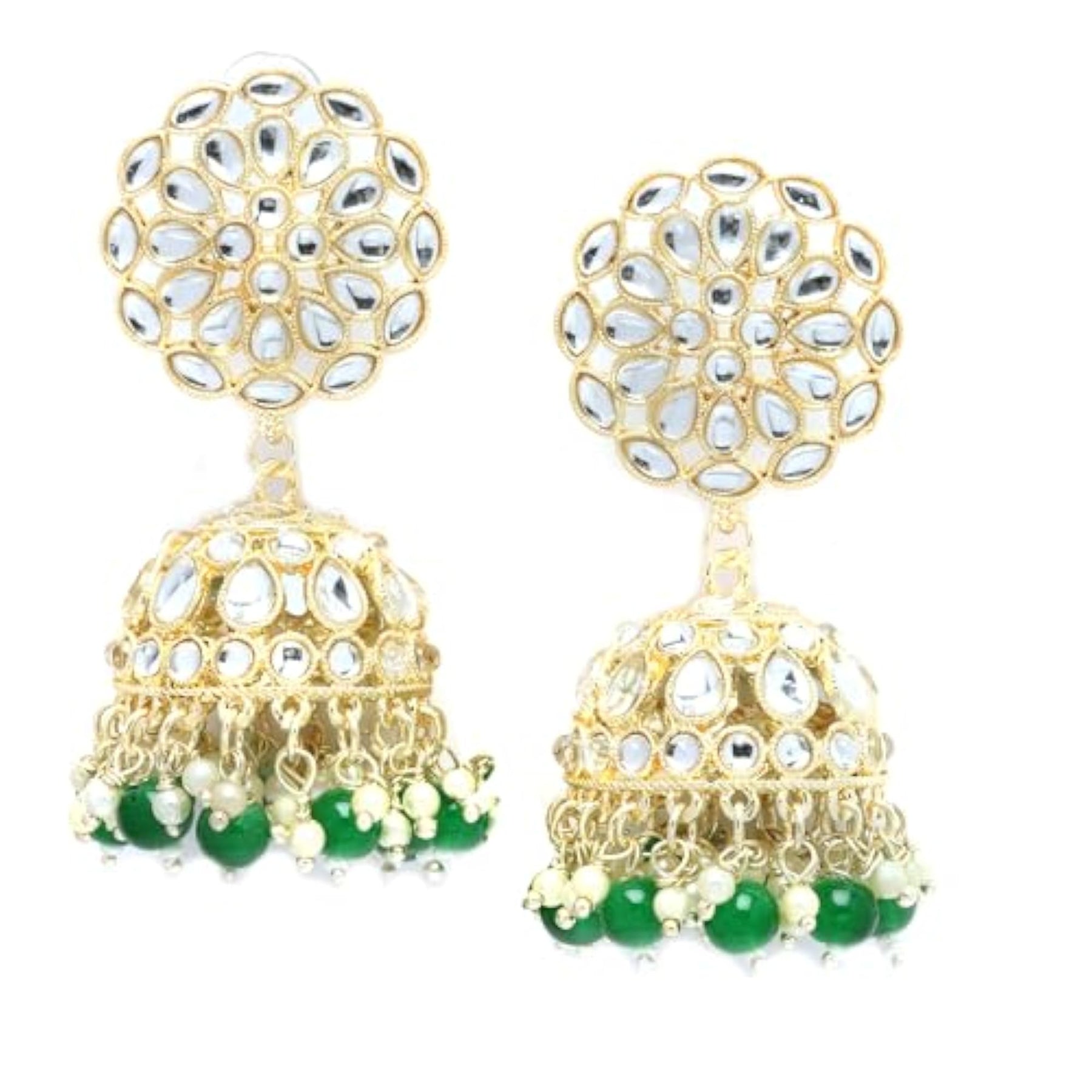 Dazzle in these exquisite flower-shaped jhumka earrings featuring gold-plated Kundan and pearls. Perfect accessory for special occasions.