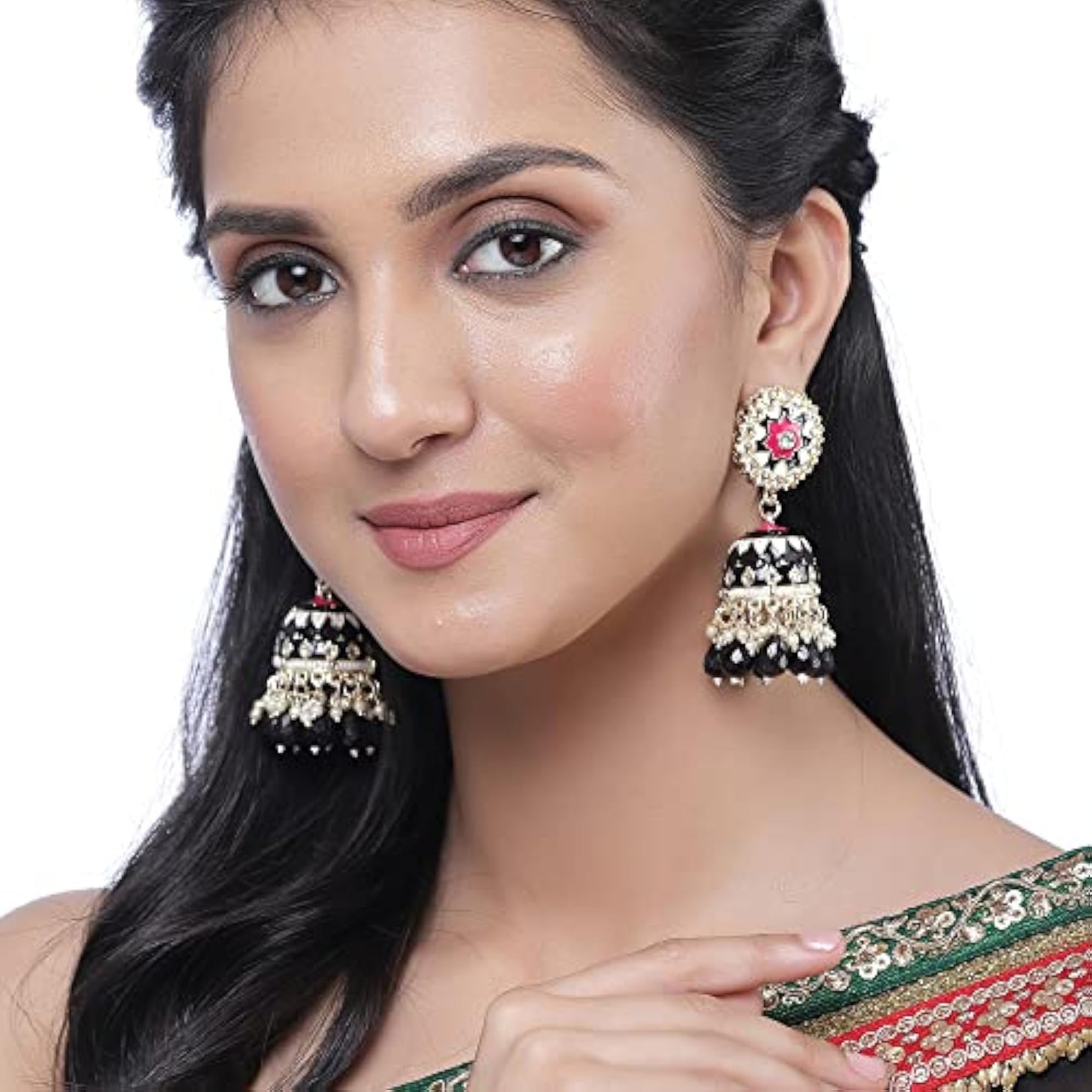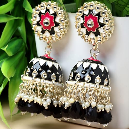 Exquisite handcrafted jhumka earrings featuring kundan and pearls in a dome shape design.