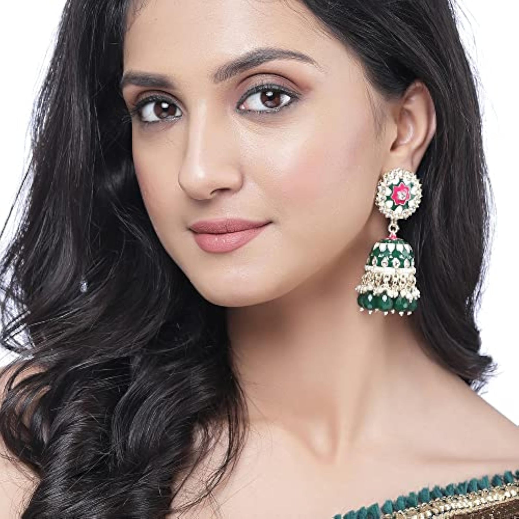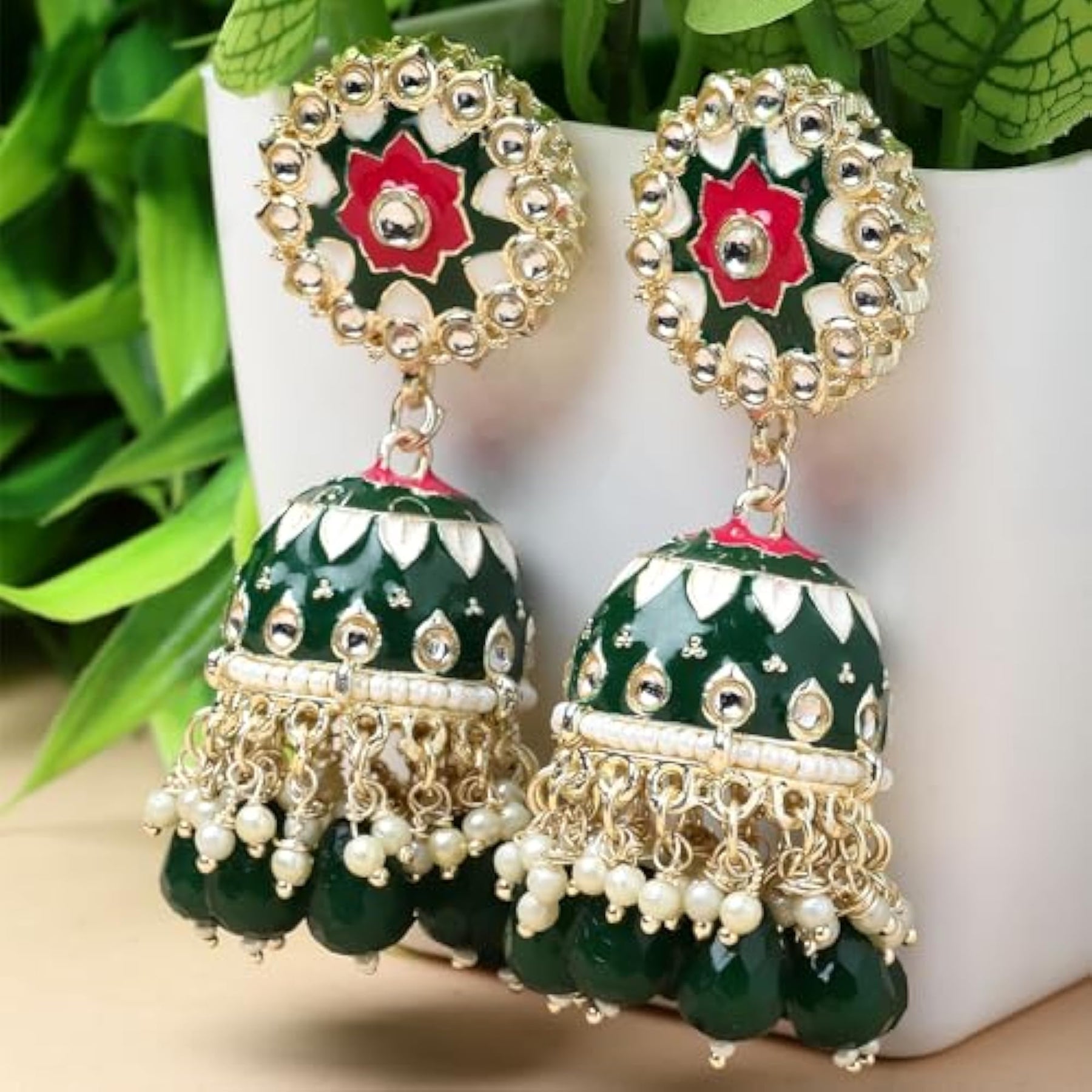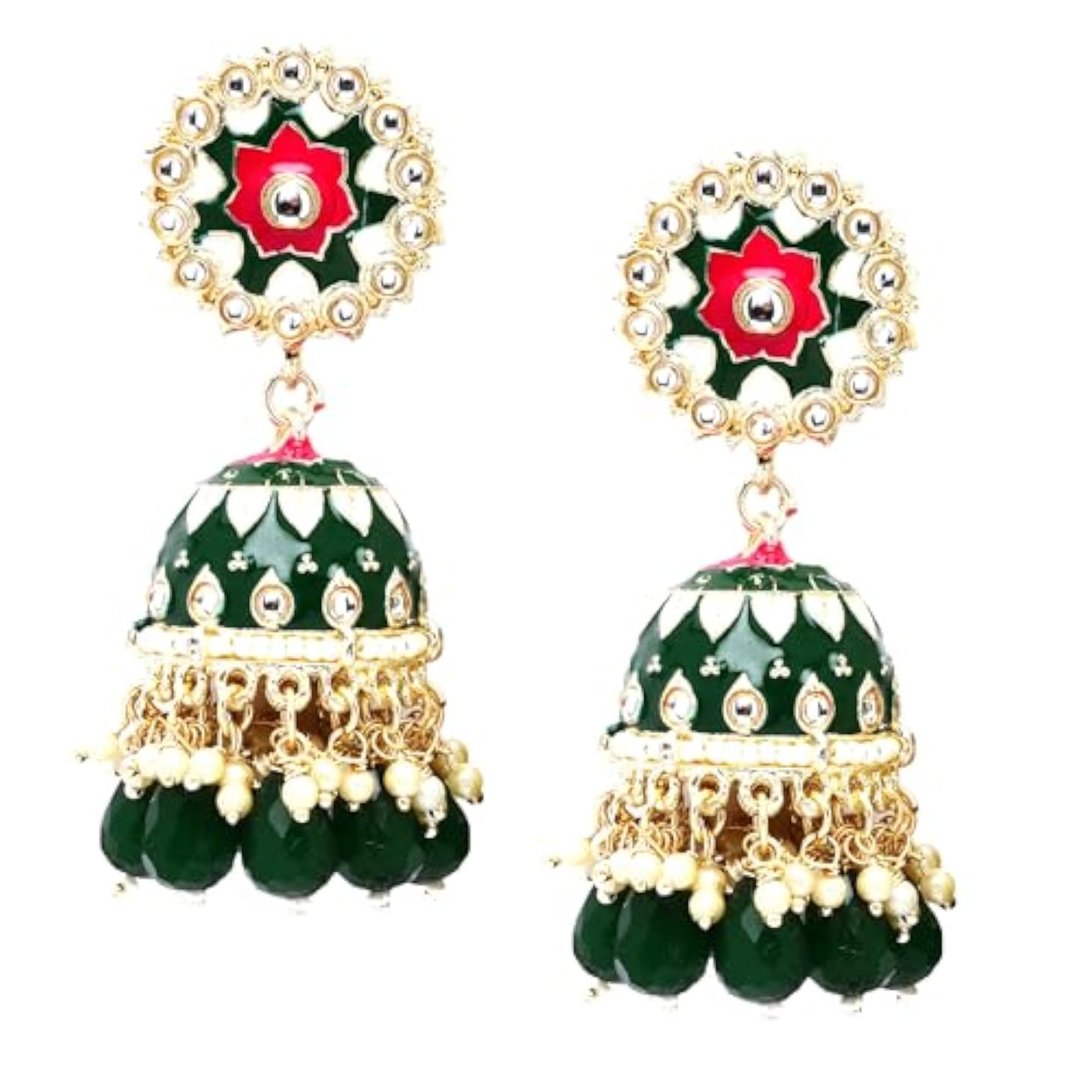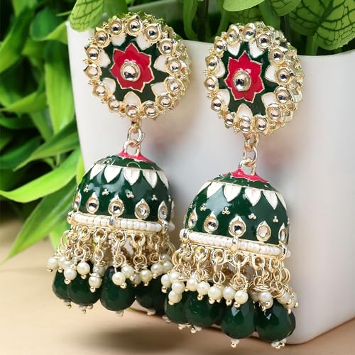 Elegant handcrafted jhumka earrings with gold plating, kundan, and pearl embellishments.