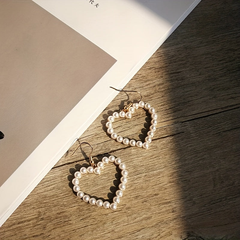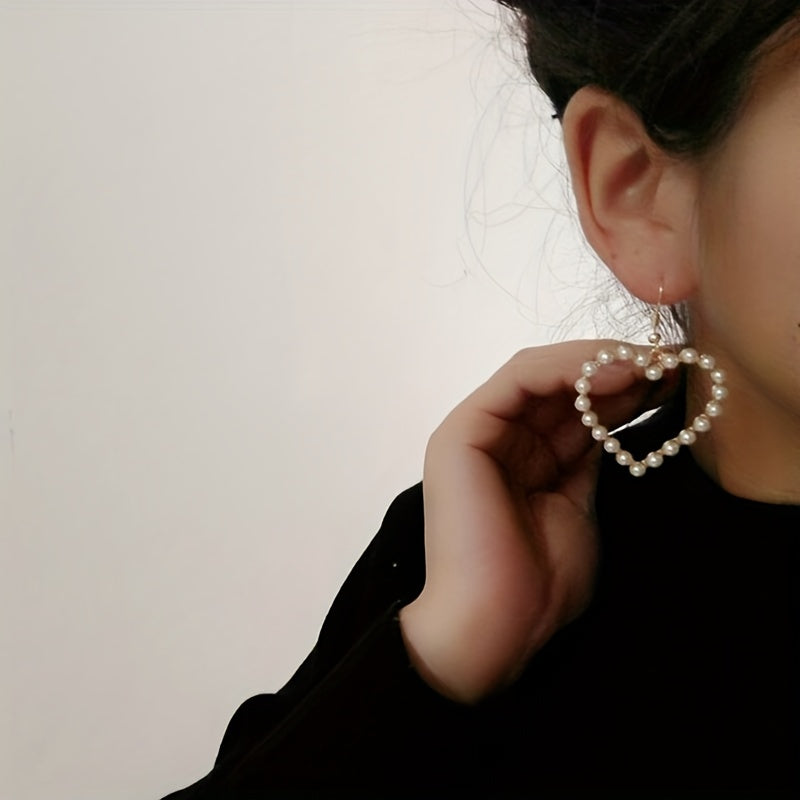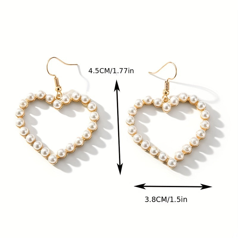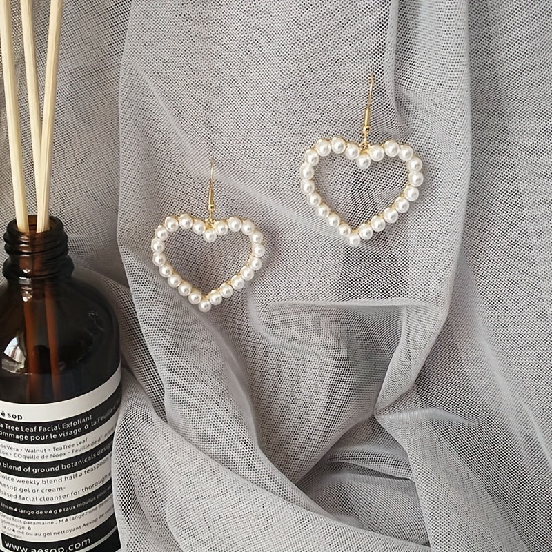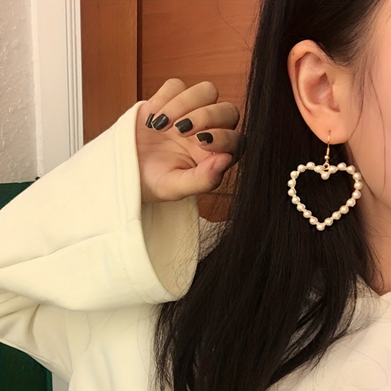 Elegant gold dangle earrings featuring hollow heart design with faux pearl. Inspired by retro Japanese style, these alloy earrings make a perfect gift for females.