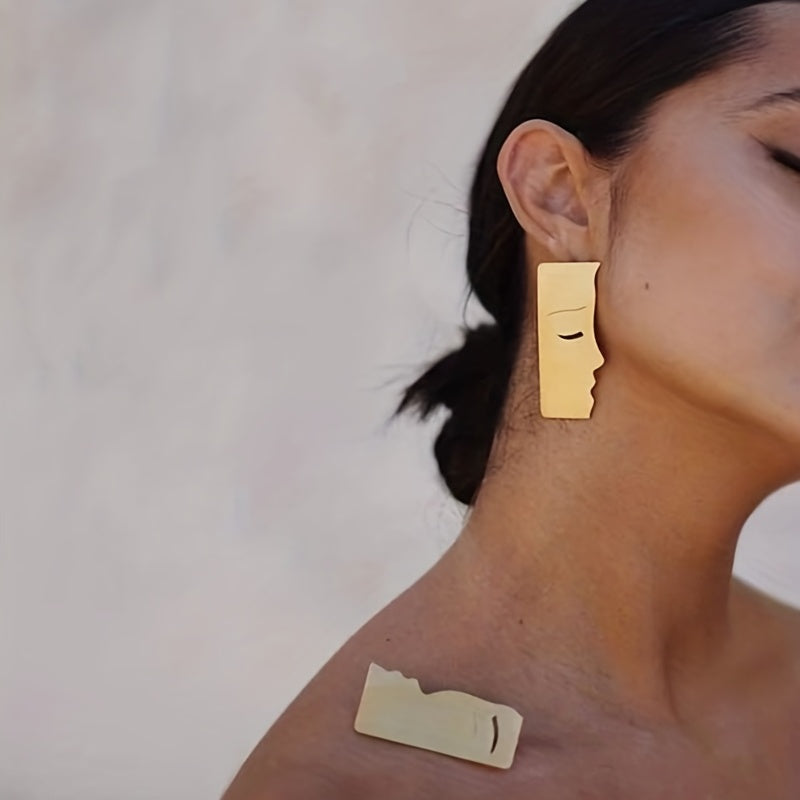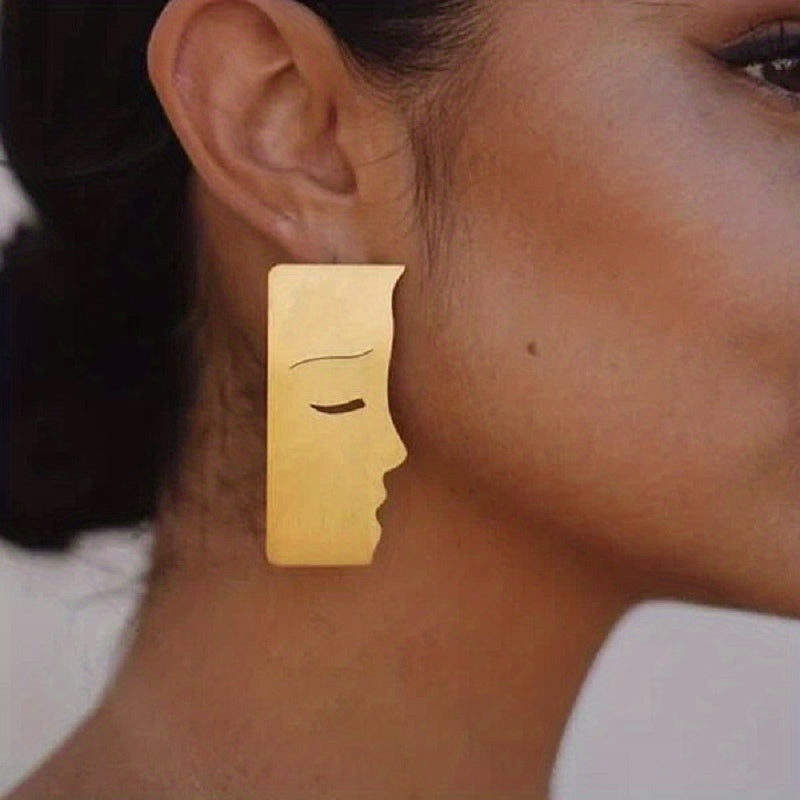 These creative dangle earrings feature a unique design with a golden and silvery human face pattern. They make a perfect jewelry gift for women.