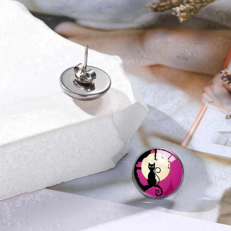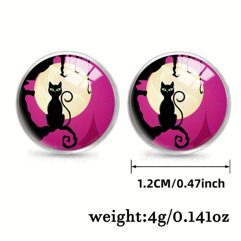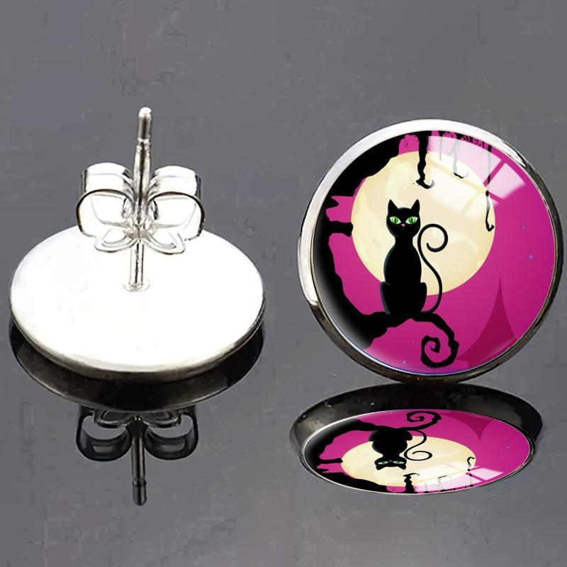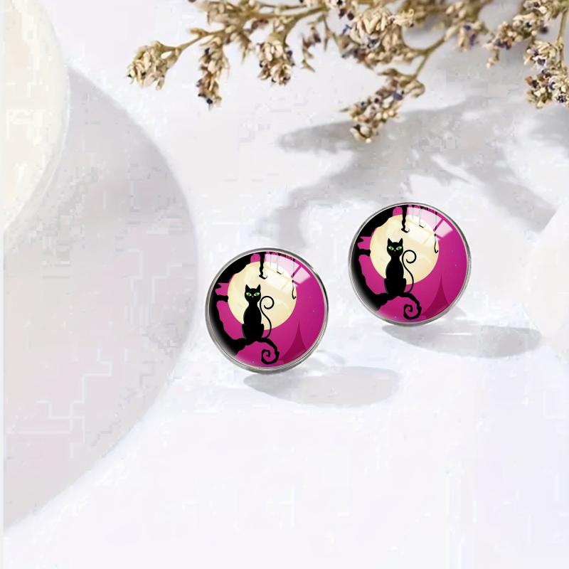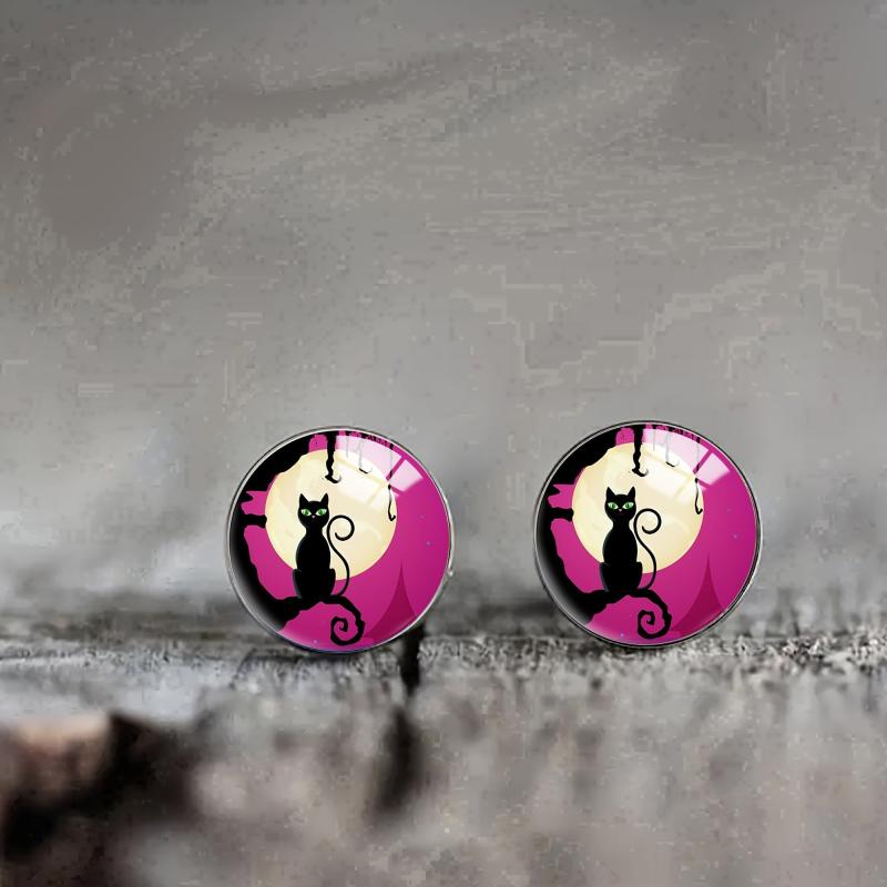 These Gothic and Sexy Cat on Tree earrings feature a cat silhouette with pink and purple swirls, full moon synthetic stones, perfect for Halloween parties. Unisex style.