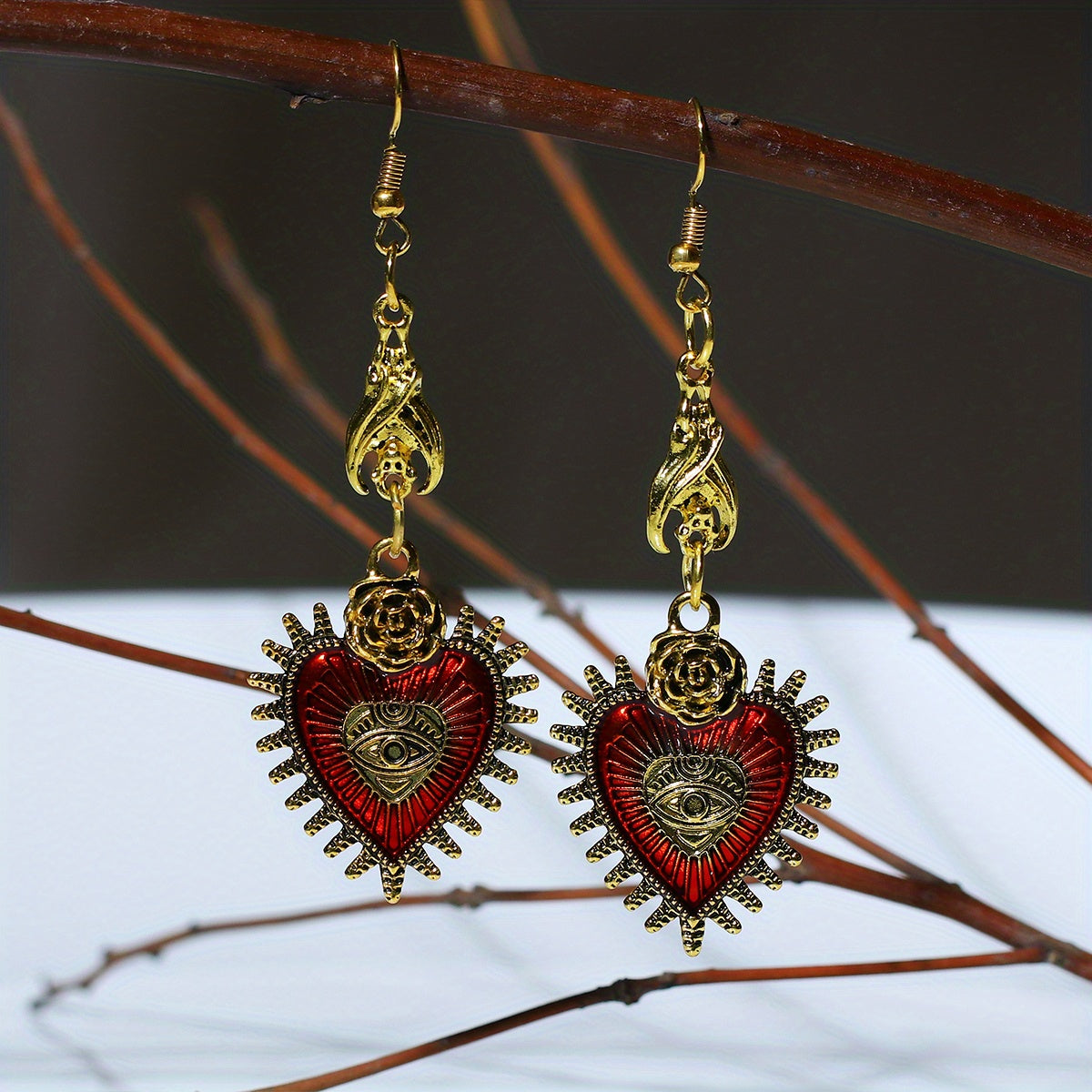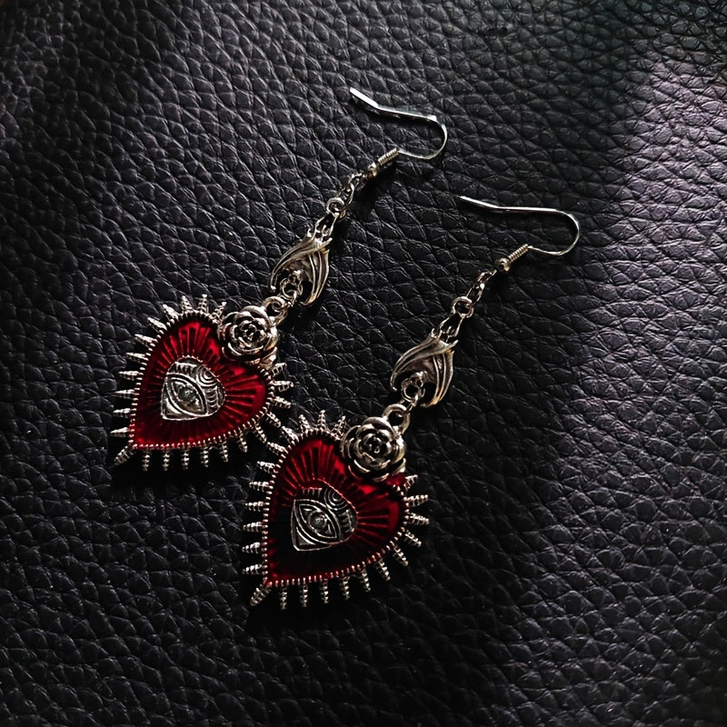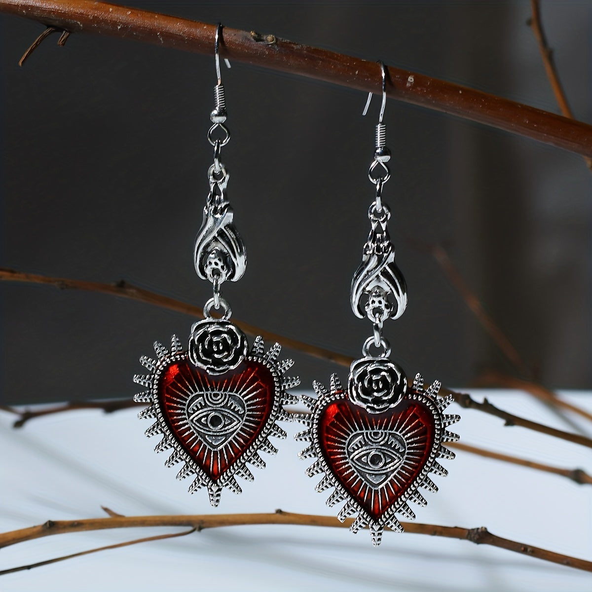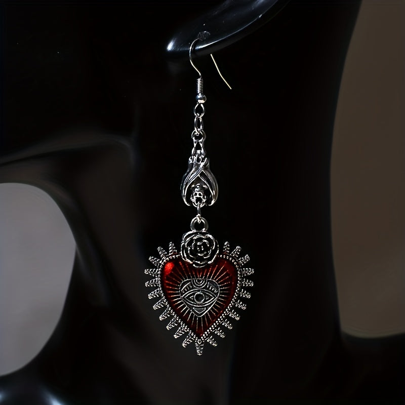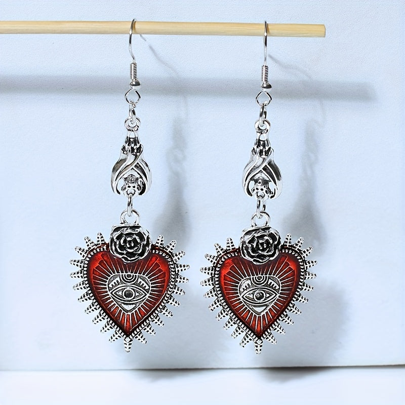 These gothic heart earrings feature an evil eye pattern, perfect for punk style ornamentation. Ideal for women and girls with edgy fashion taste.