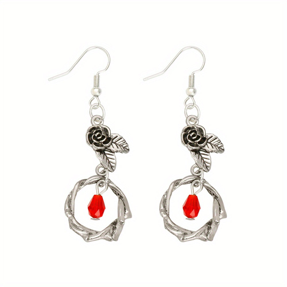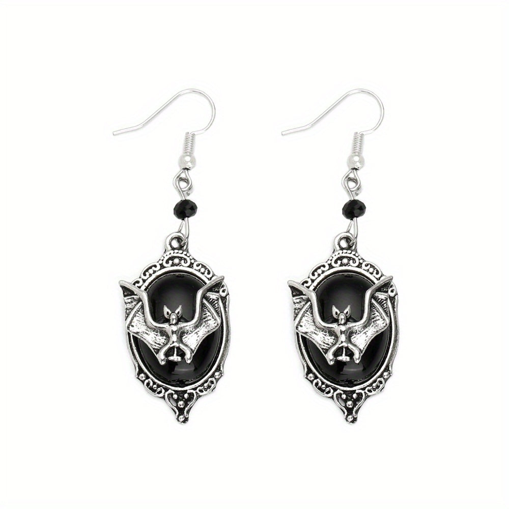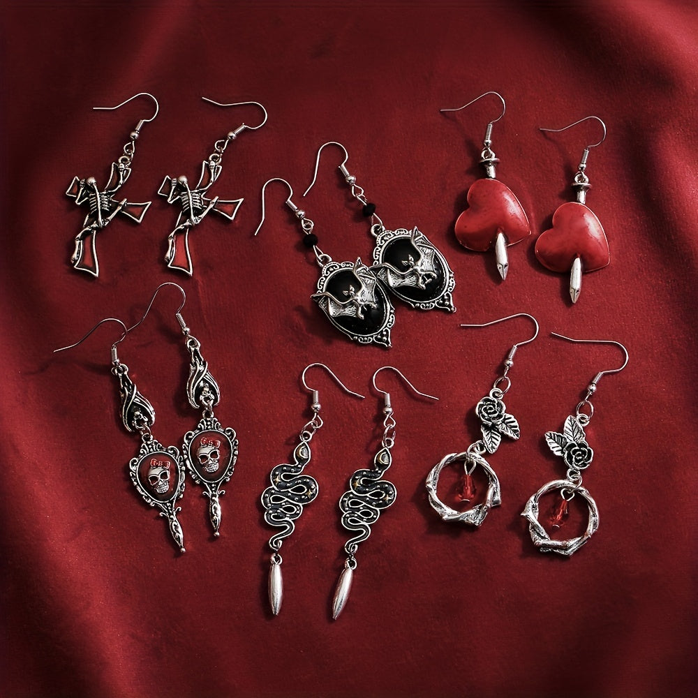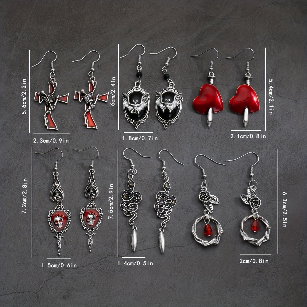 These gothic style earrings feature a skull, cross, bat, gem, rose, and arrow through heart design. They make a creative gift for females.