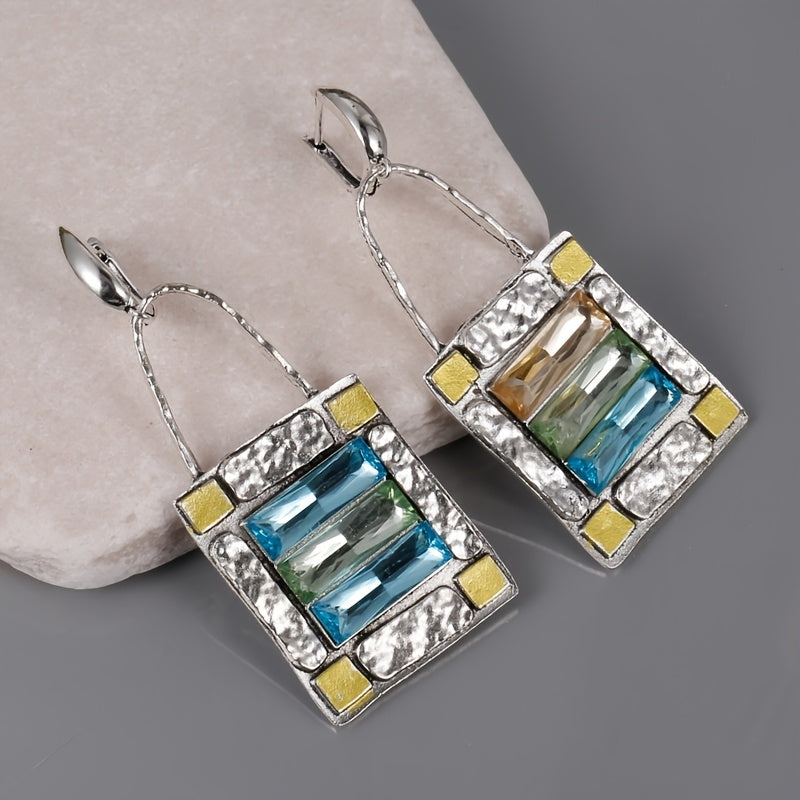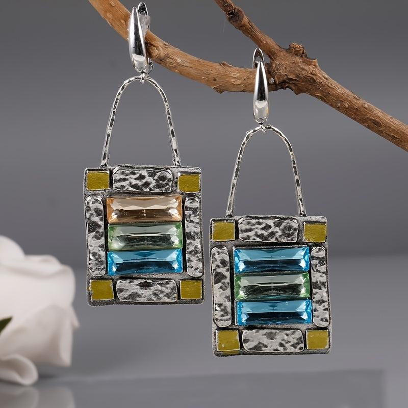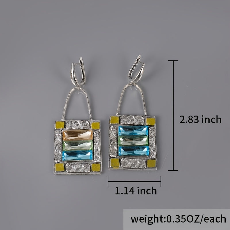 These vintage green crystal stone hook earrings feature a geometric square design with zircon detailing. Perfect for parties and special occasions.