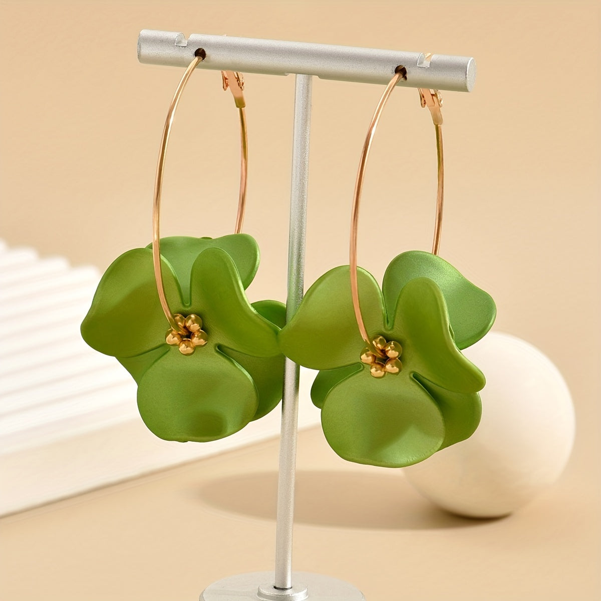 Embrace the vocation style with these elegant hoop earrings featuring green flower decoration. Perfect accessory for holiday or tourism souvenirs.