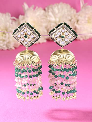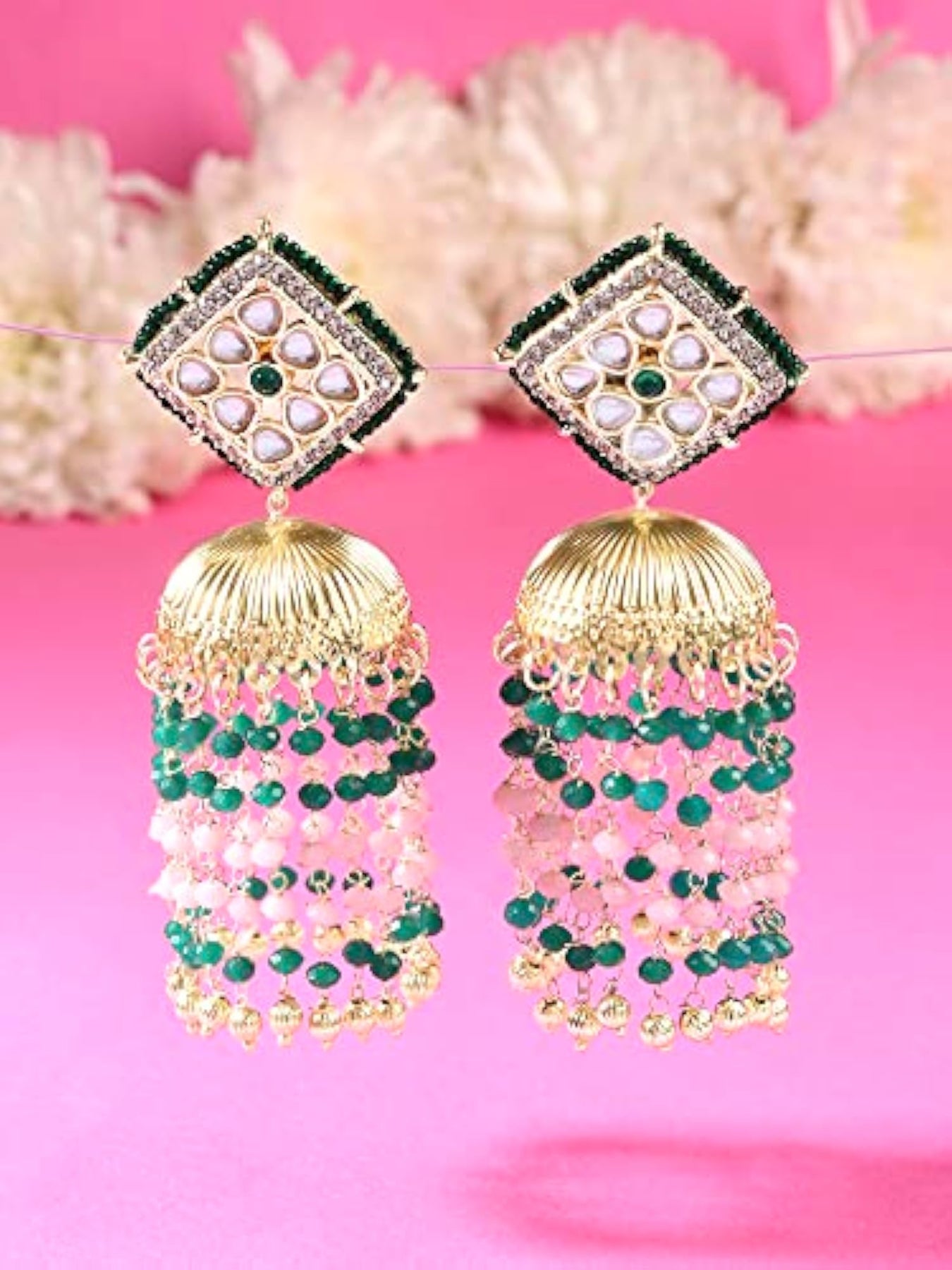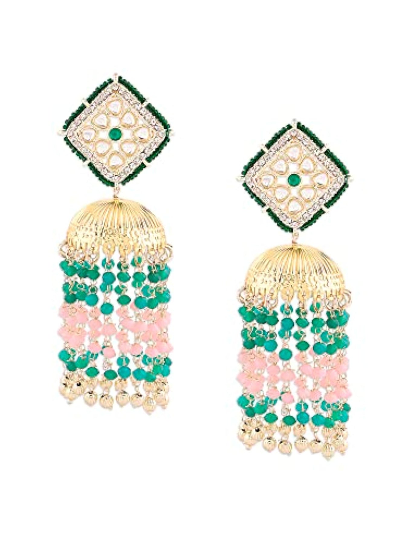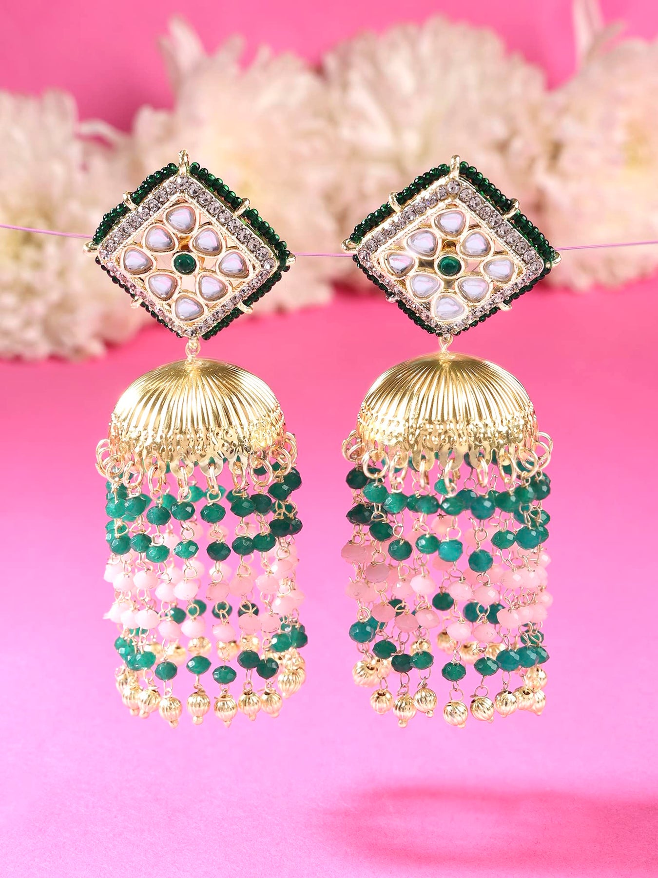 Elegant jhumki earrings with green and pink beads embellished with chain fringe and Kundan. Perfect for women.