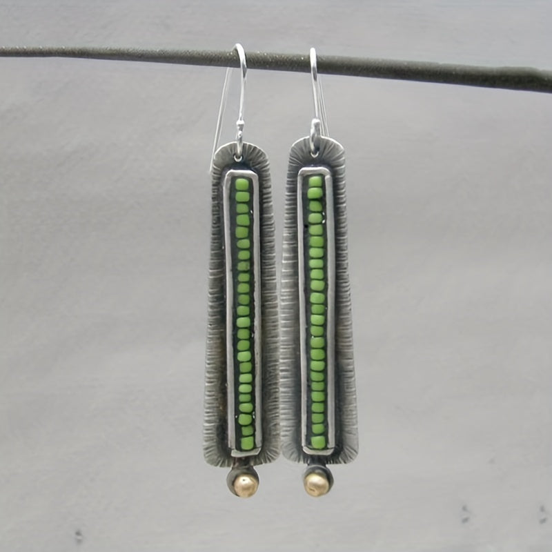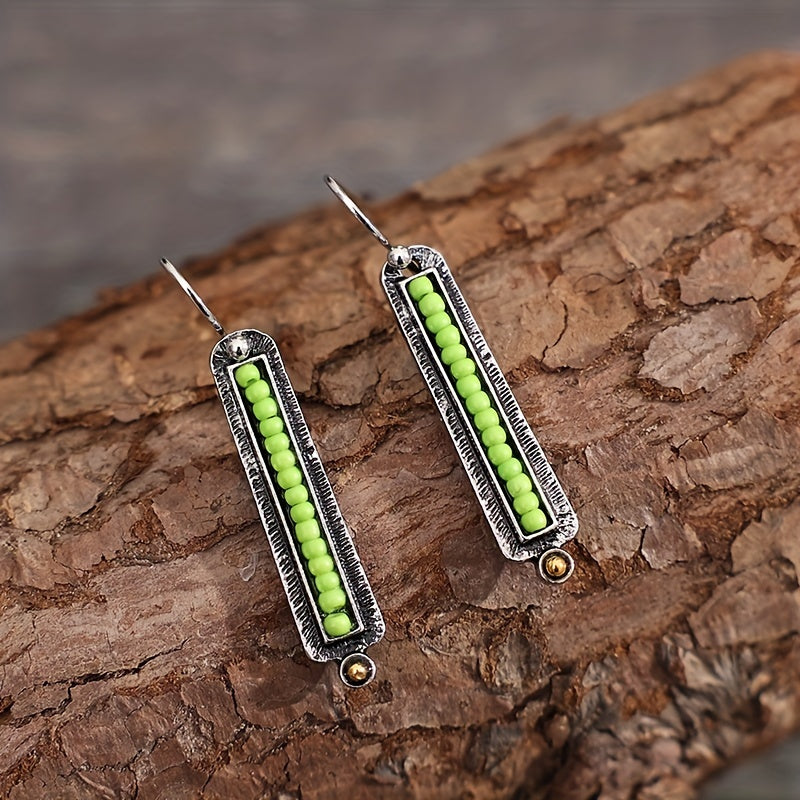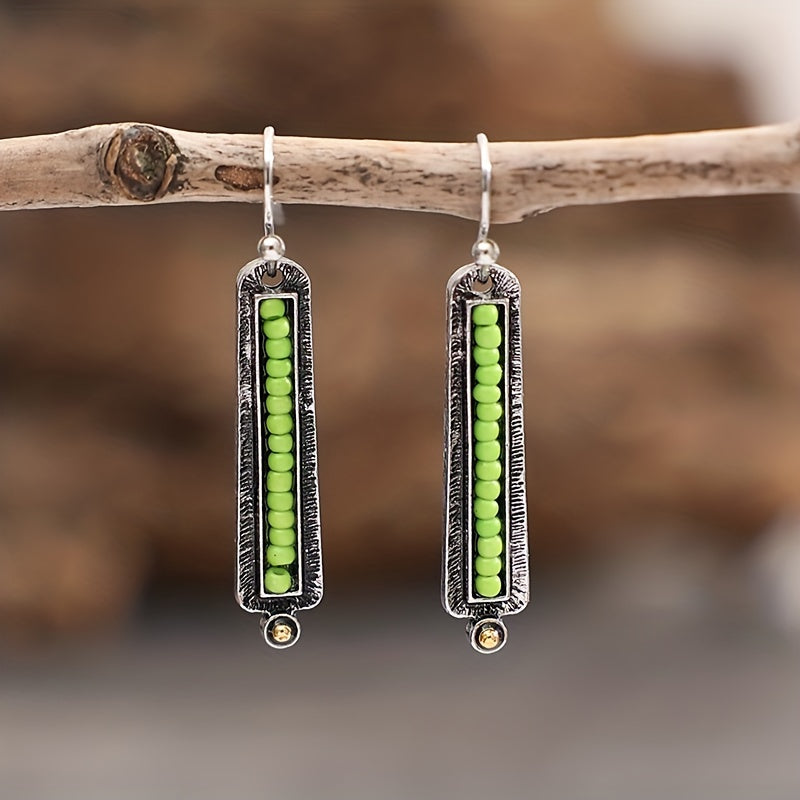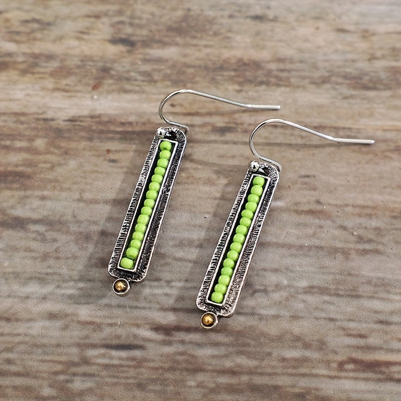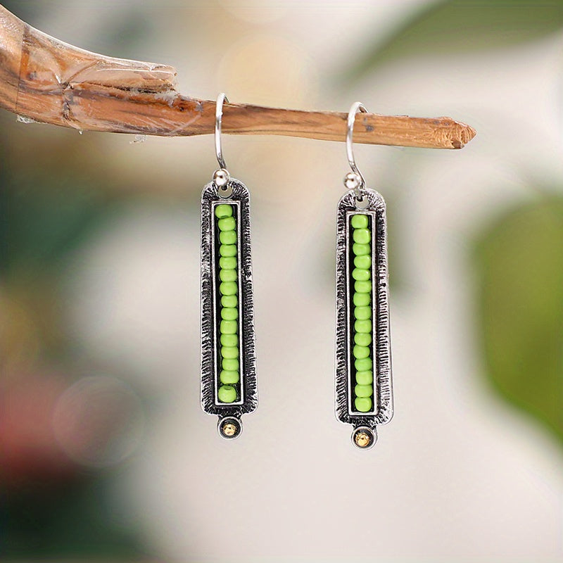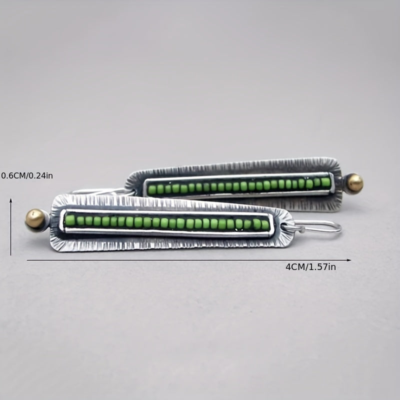 Add a pop of retro charm to your outfit with these rectangle shape dangle earrings featuring green rice beads. Made of zinc alloy and silver plated, perfect for daily casual wear.